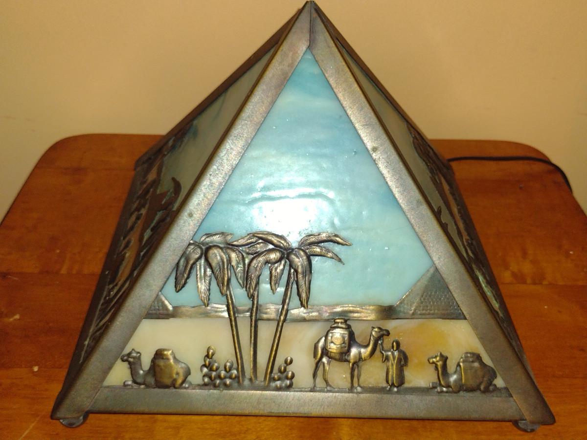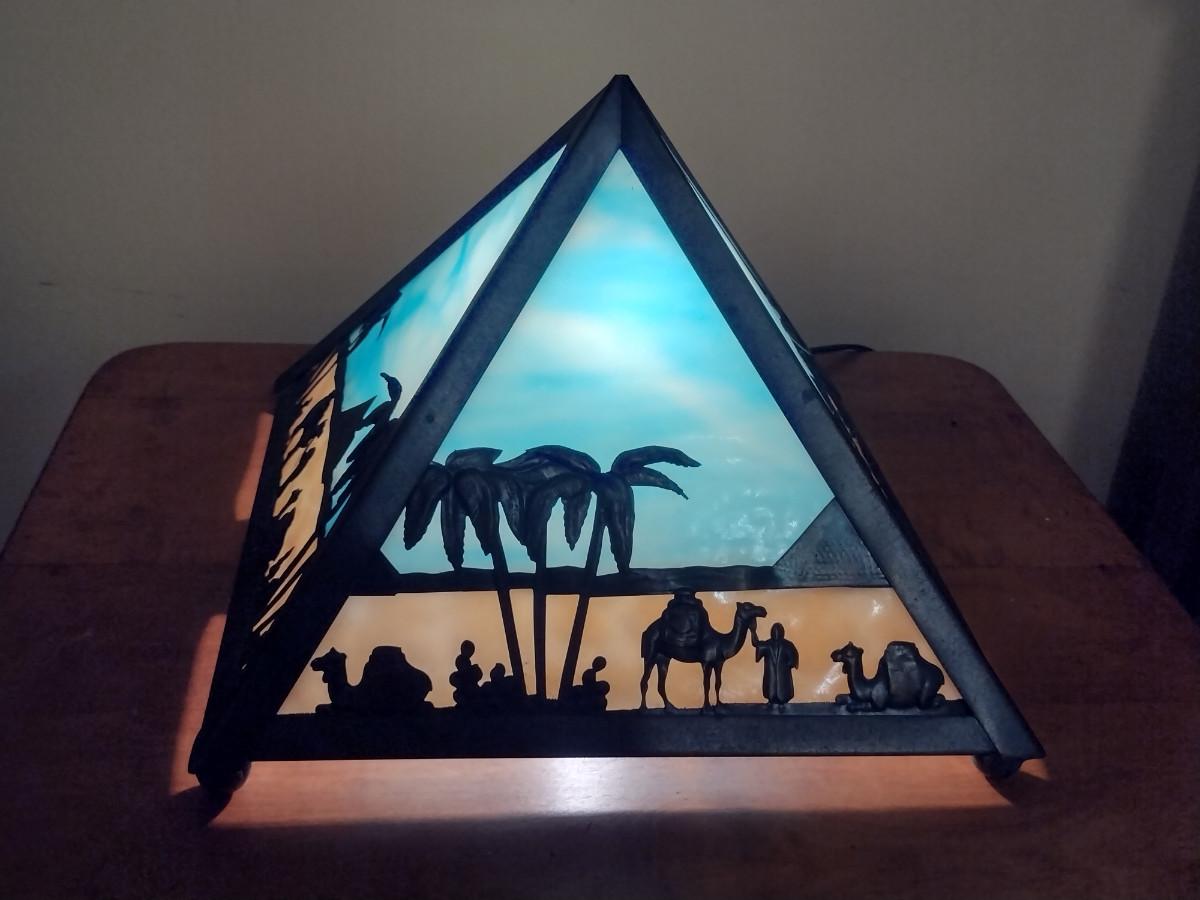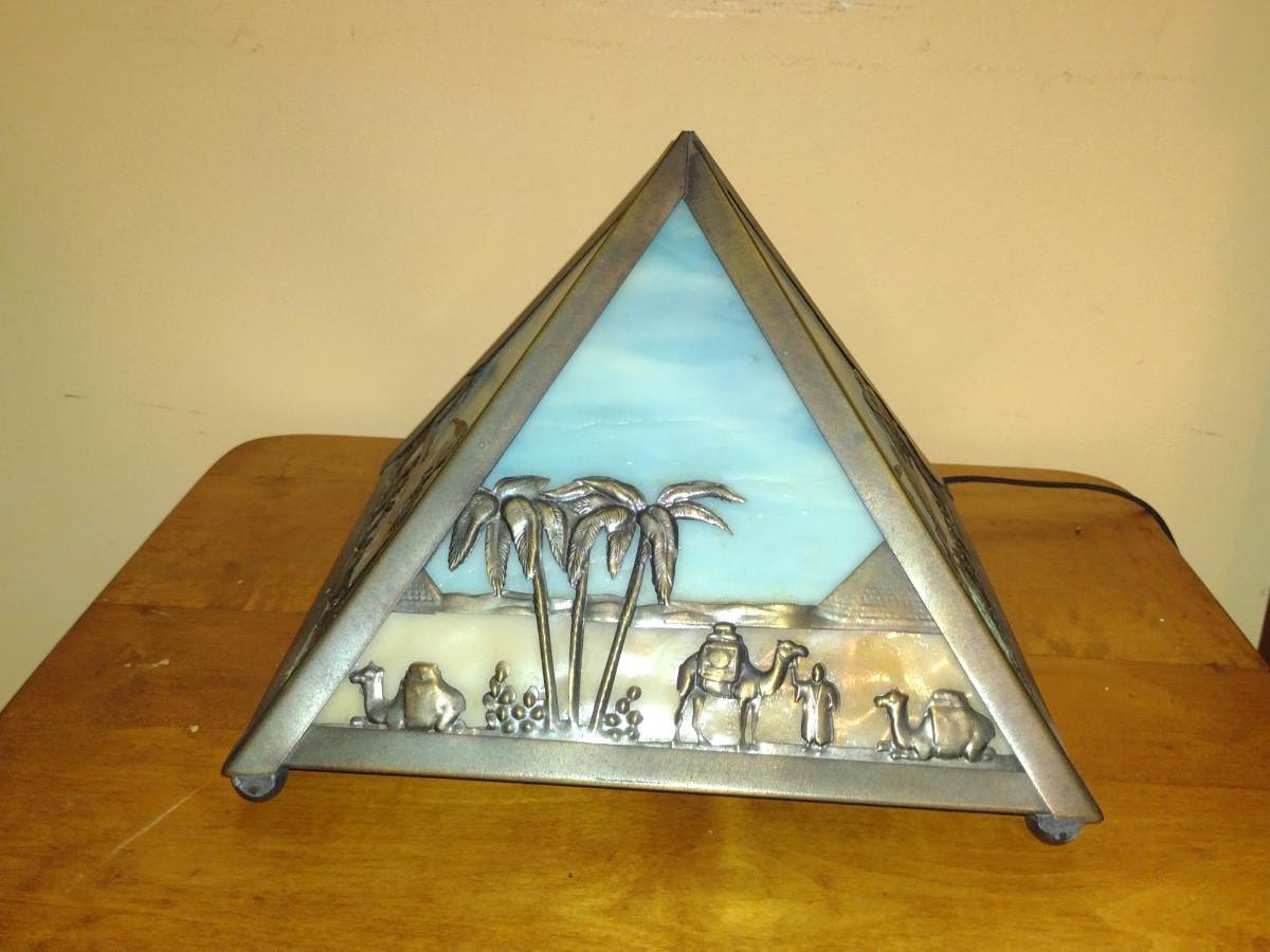 Meyda Tiffany Stained Glass Pyramid Shaped Table Top Lamp/Night Light with Camels and Desert Scene. Item is in working condition. Approx 10" square, 8" tall.
