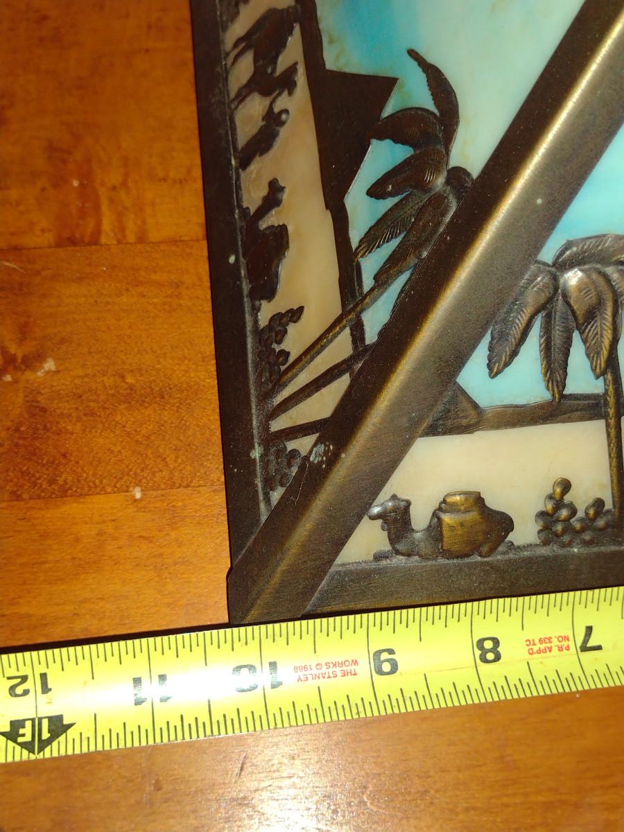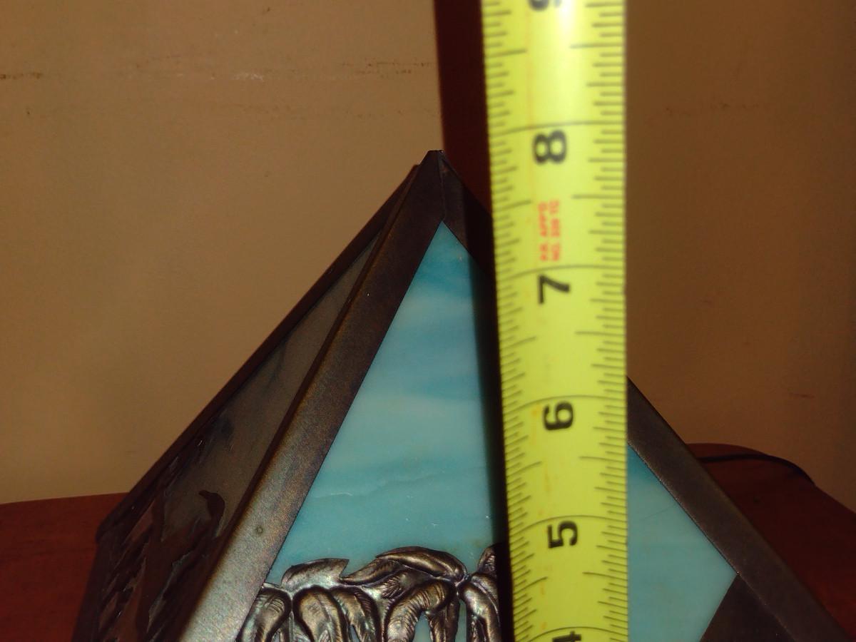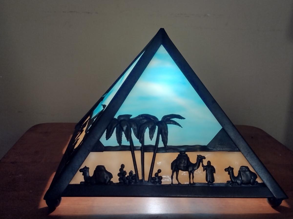 Meyda Tiffany Stained Glass Pyramid Shaped Table Top Lamp/Night Light with Camels and Desert Scene. Item is in working condition. Approx 10" square, 8" tall.