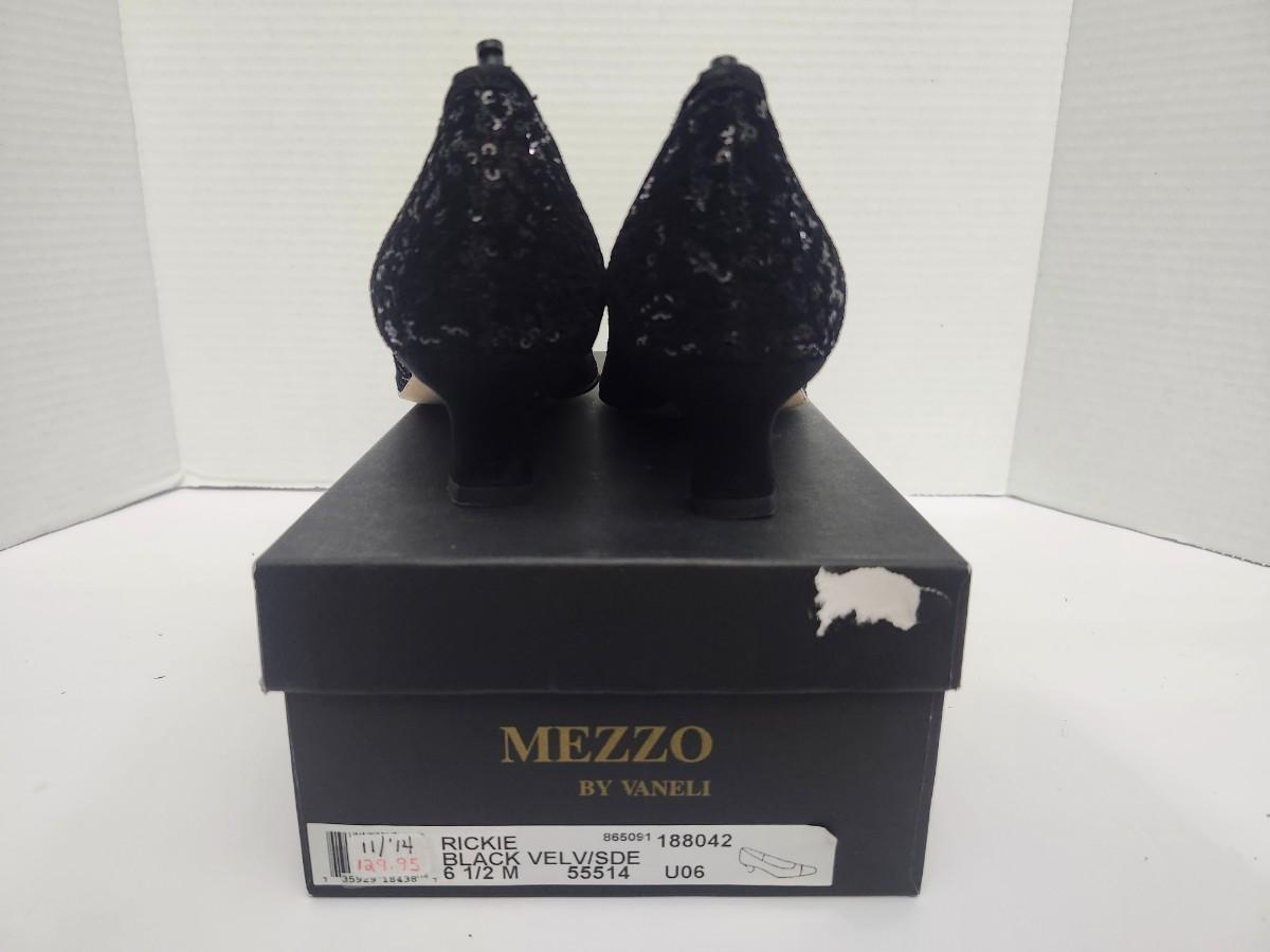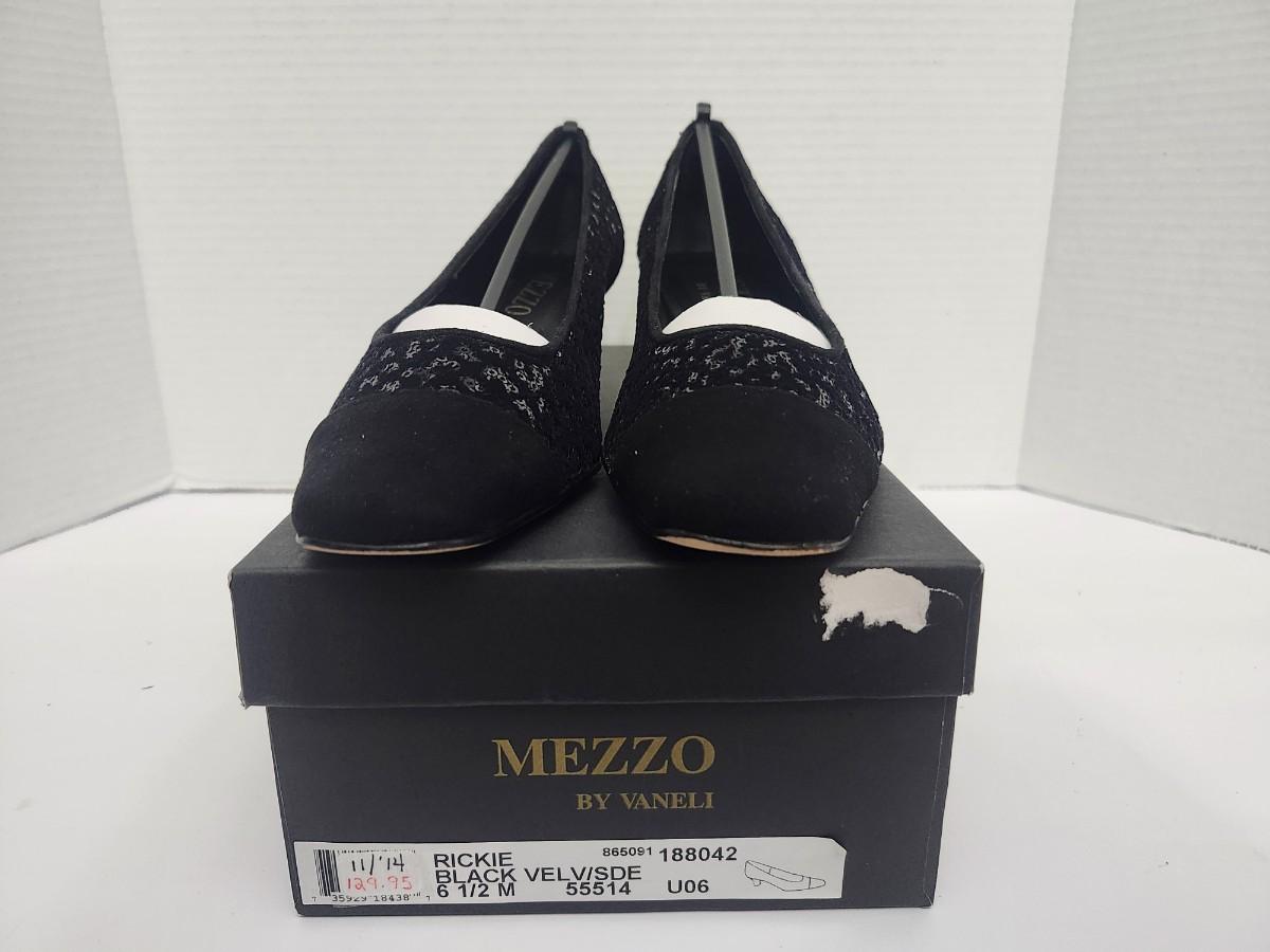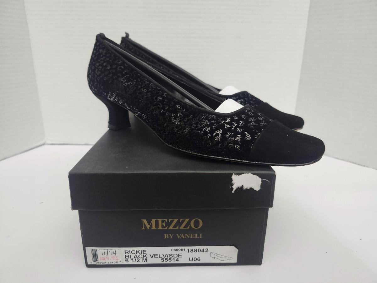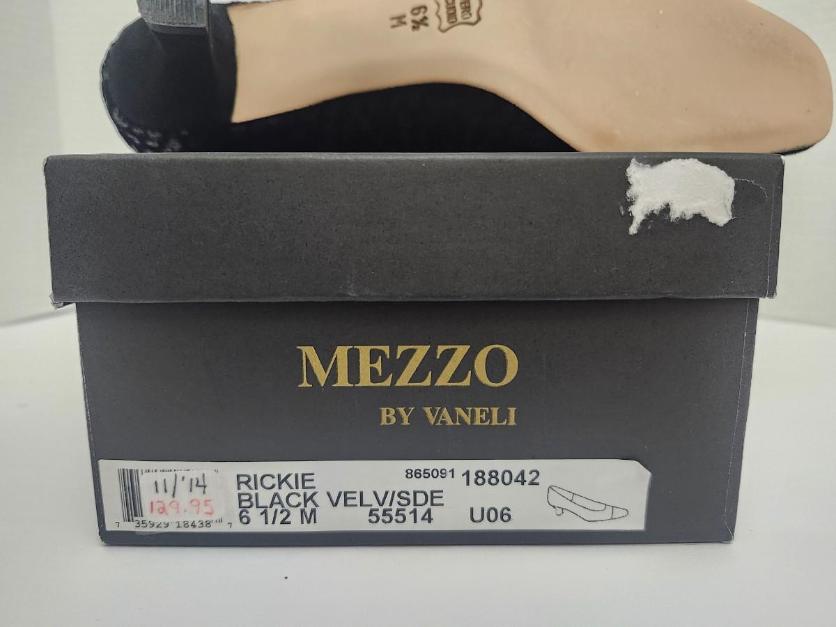 Mezzo by Vaneli Rickie women’s slip on heels in black velvisde with textured patterned upper and smooth black toe cap. Labeled Rickie Black Velvisde size 6 1/2 M on original Mezzo by Vaneli shoe box. Low heel dress style with slim heel and contrasting materials visible on upper. Includes original branded box as shown. Description based strictly on visible labels and photographs only.