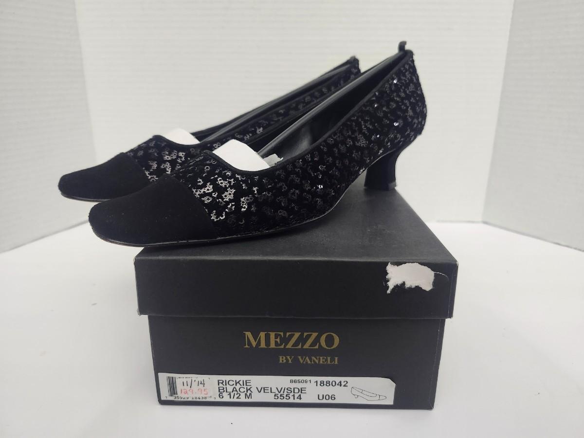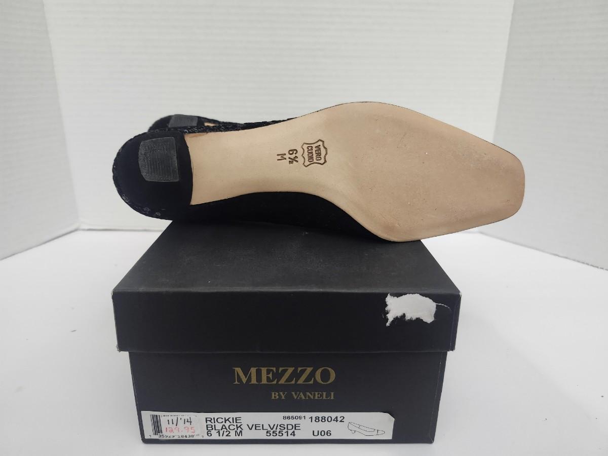 Mezzo by Vaneli Rickie women’s slip on heels in black velvisde with textured patterned upper and smooth black toe cap. Labeled Rickie Black Velvisde size 6 1/2 M on original Mezzo by Vaneli shoe box. Low heel dress style with slim heel and contrasting materials visible on upper. Includes original branded box as shown. Description based strictly on visible labels and photographs only.