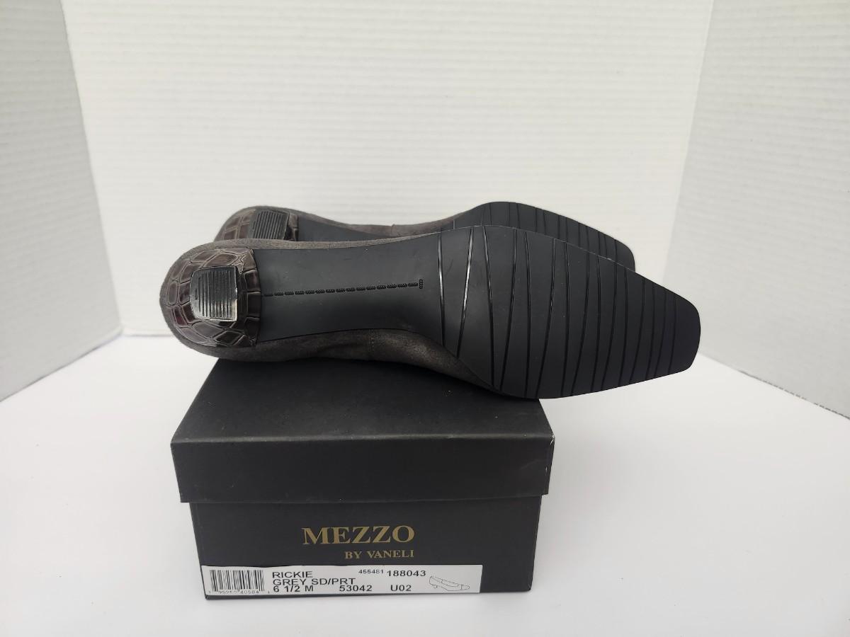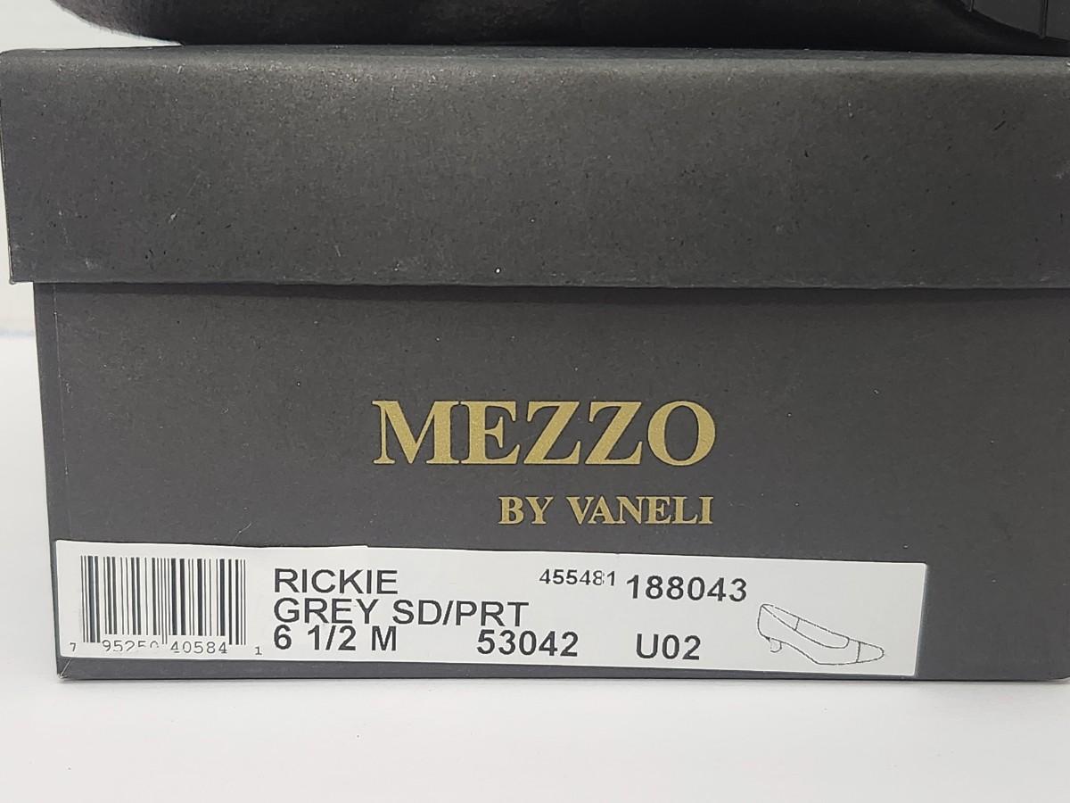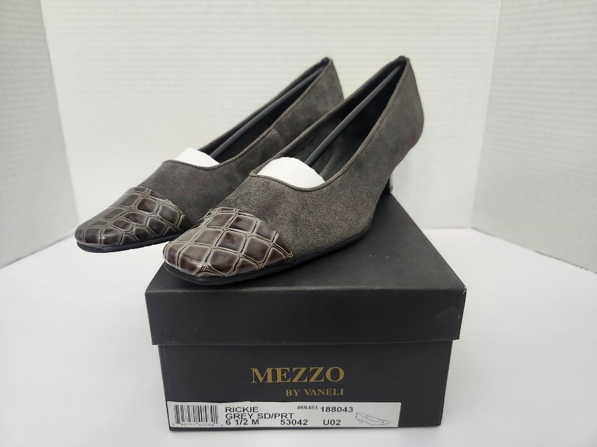 Mezzo by Vaneli Rickie women’s dress pumps in grey as labeled on the original box. Marked size 6 1/2 Medium. Classic low heel pump with contrasting textured toe detail and slip on style. Includes original Mezzo by Vaneli shoe box. All details taken strictly from visible labels and photographs only.