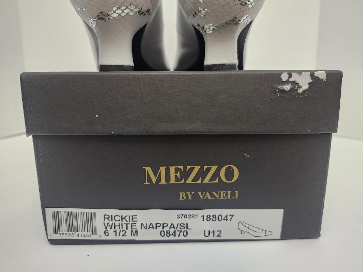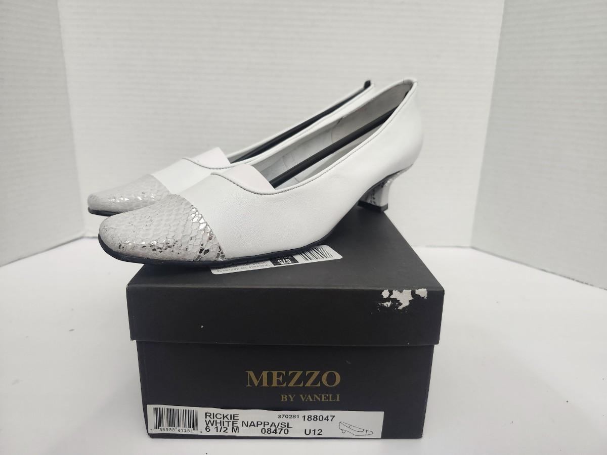 Mezzo by Vaneli Rickie women’s slip on heels in white nappa leather with contrasting textured cap toe detail. Labeled Rickie White Nappa size 6 1/2 M on original Mezzo by Vaneli shoe box. Low heel dress style with smooth leather upper and decorative toe accent. Includes original branded box as shown. Description based strictly on visible labels and photographs only.