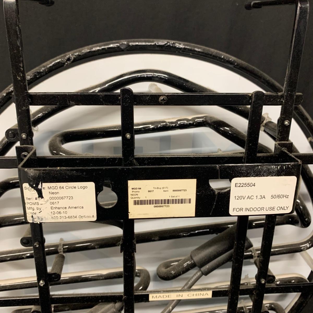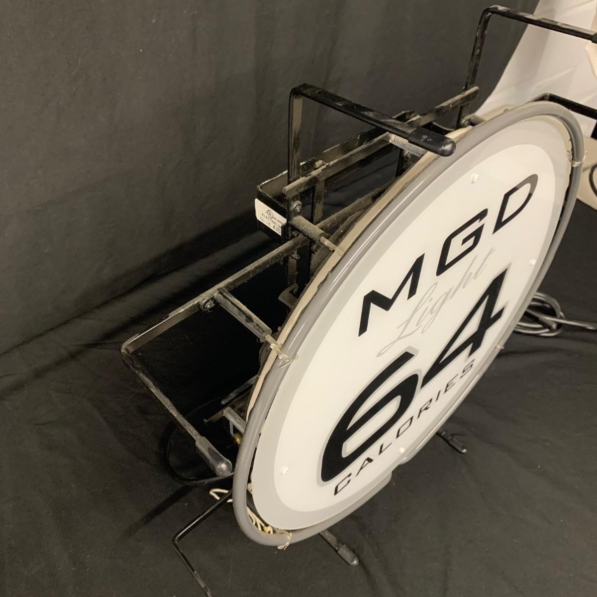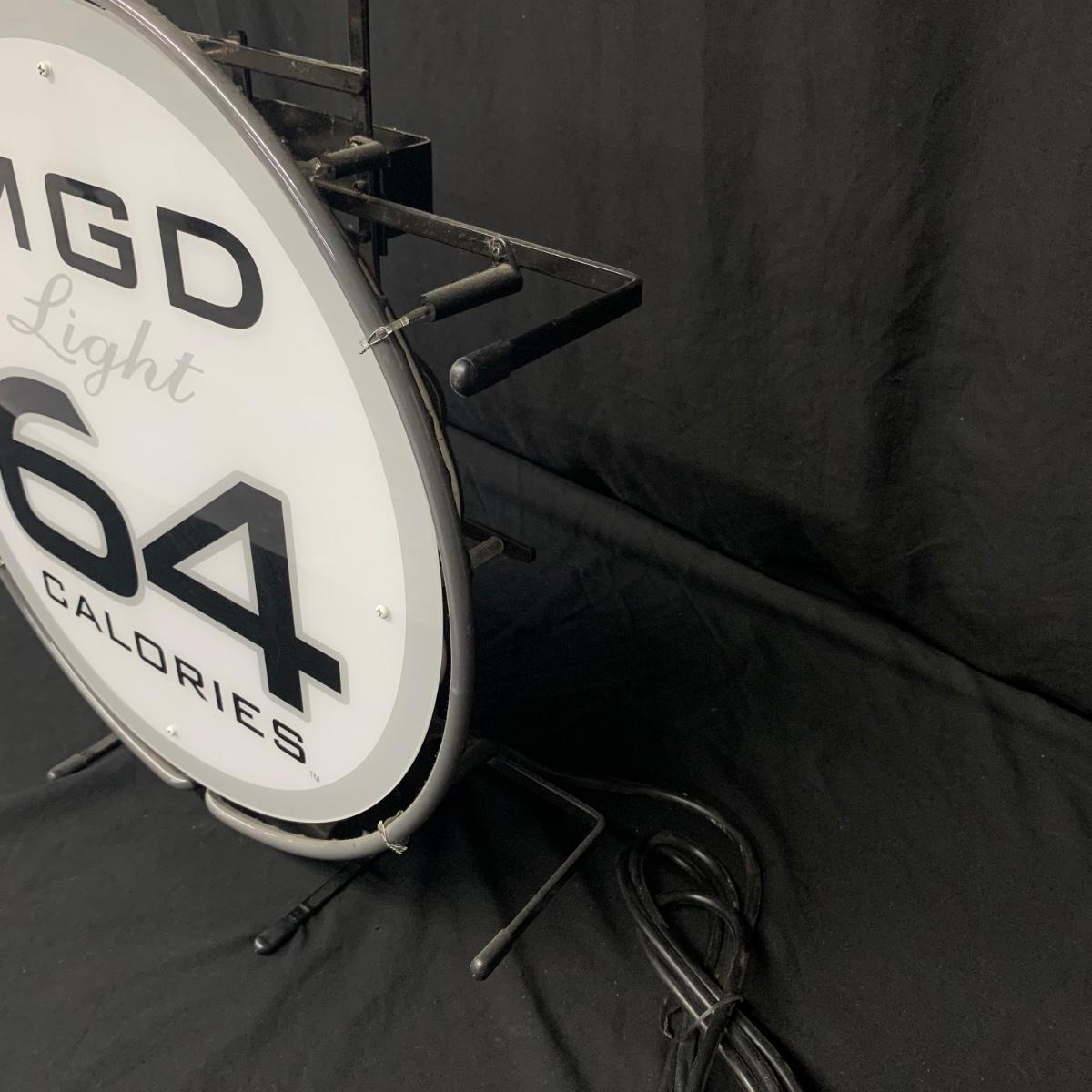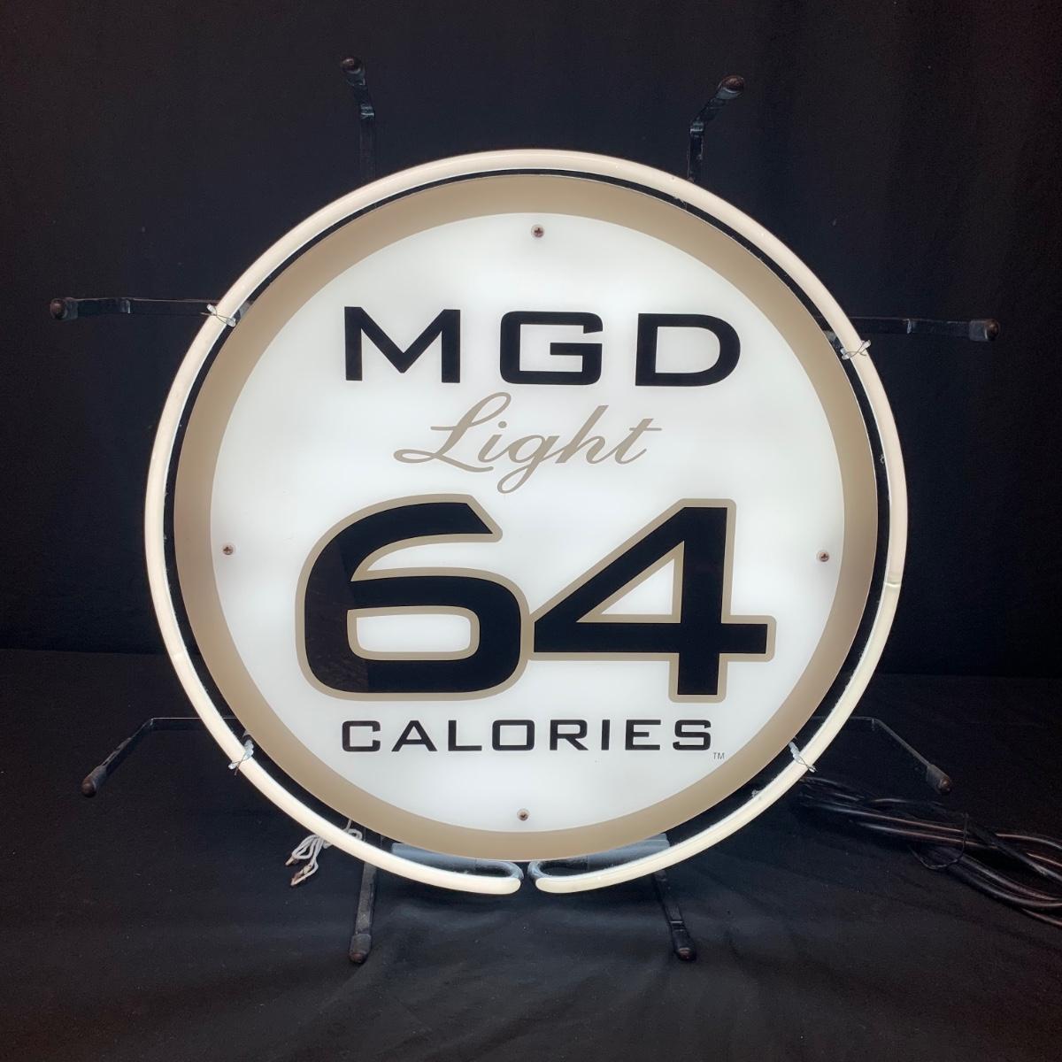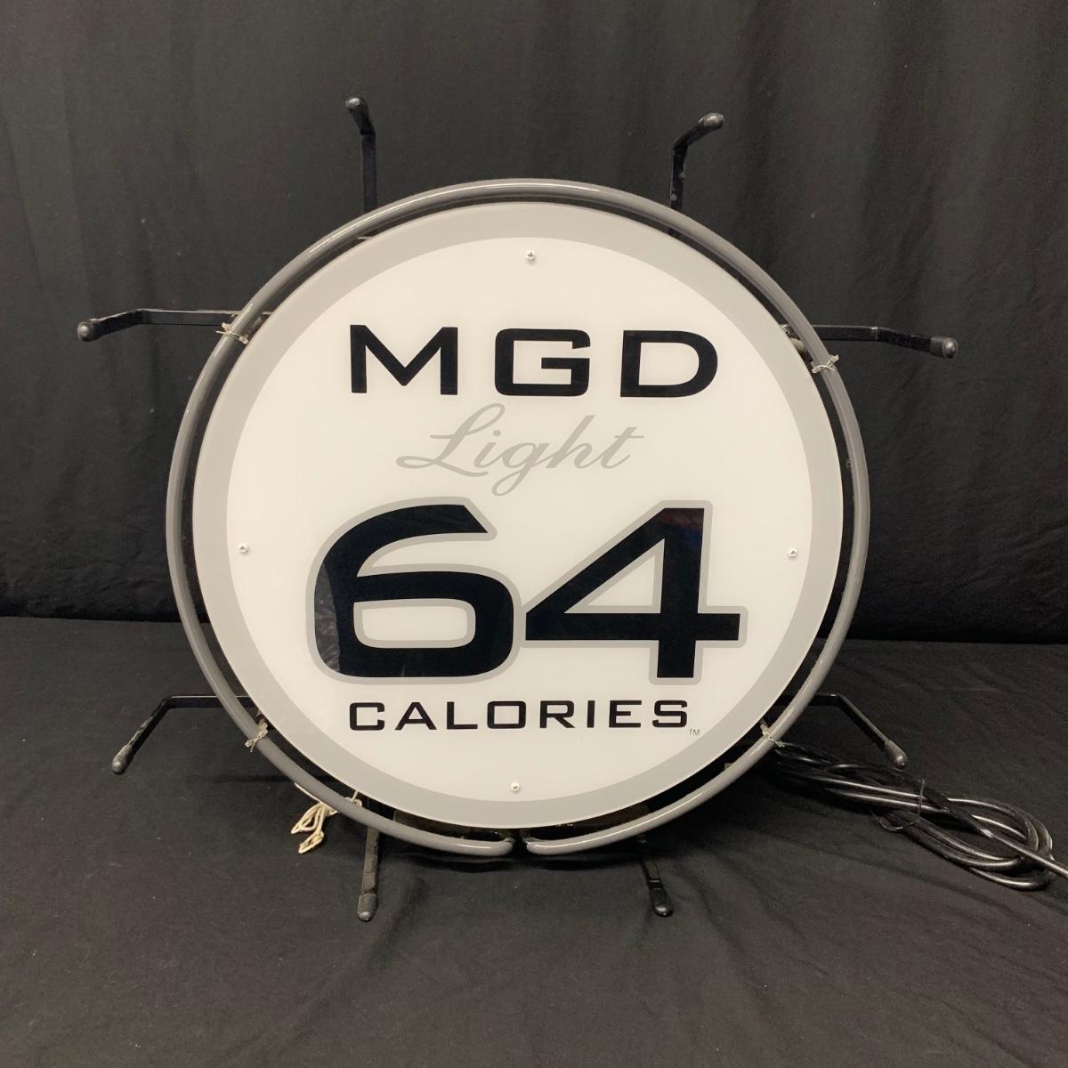 MGD Light 64 Calories neon sign. Measures 20.5” x 7” x 20.5”. Sign turned on when tested. It has a pull chain to turn the light on and off and a dimmer button. It has a three-prong electric plug. The sign is a bit dusty. Shipping available. Shipping can be costly, we suggest calling our local UPS with dimensions and getting an estimate before bidding (828) 252-6930.