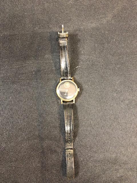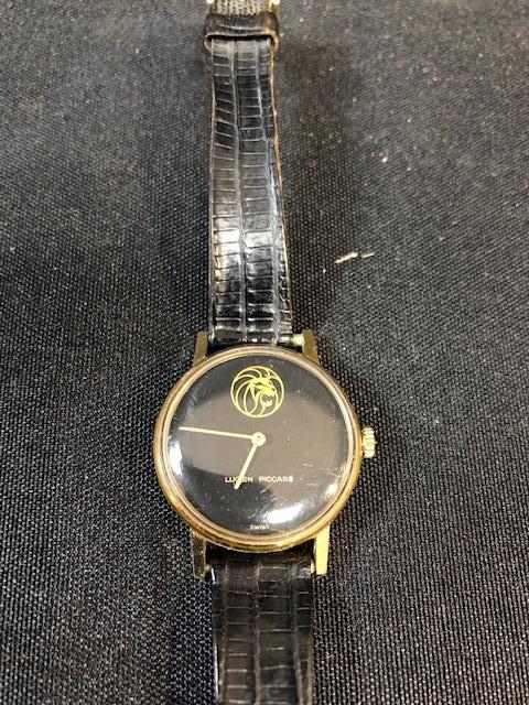 MGM Grand Watch by Lucien Piccard. Black face with gold logo, hands, and casing. Black band. Not working, probably need a battery.