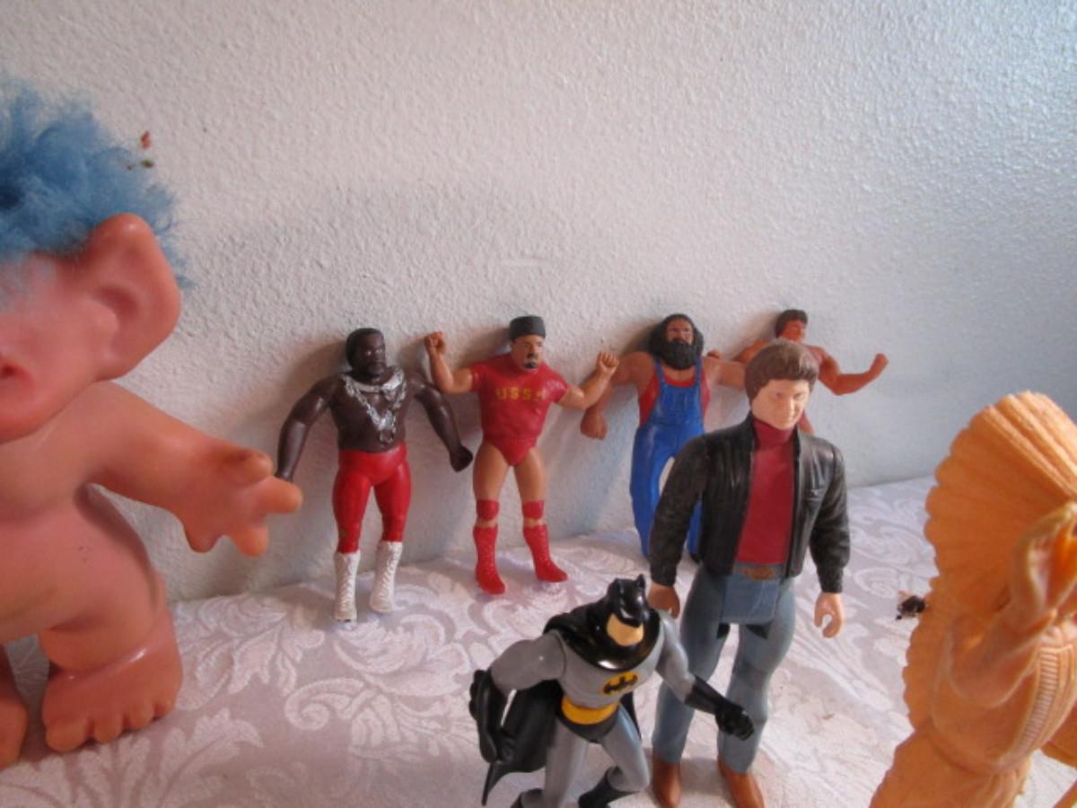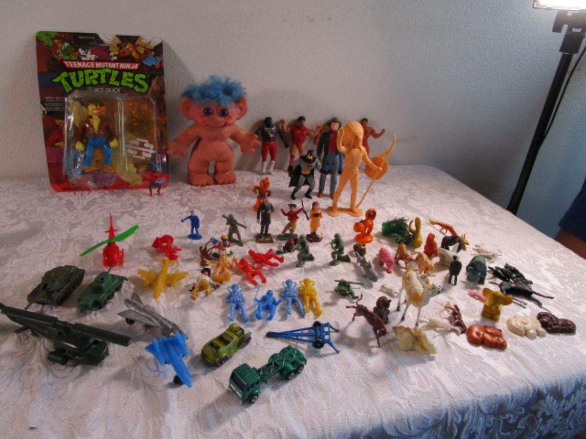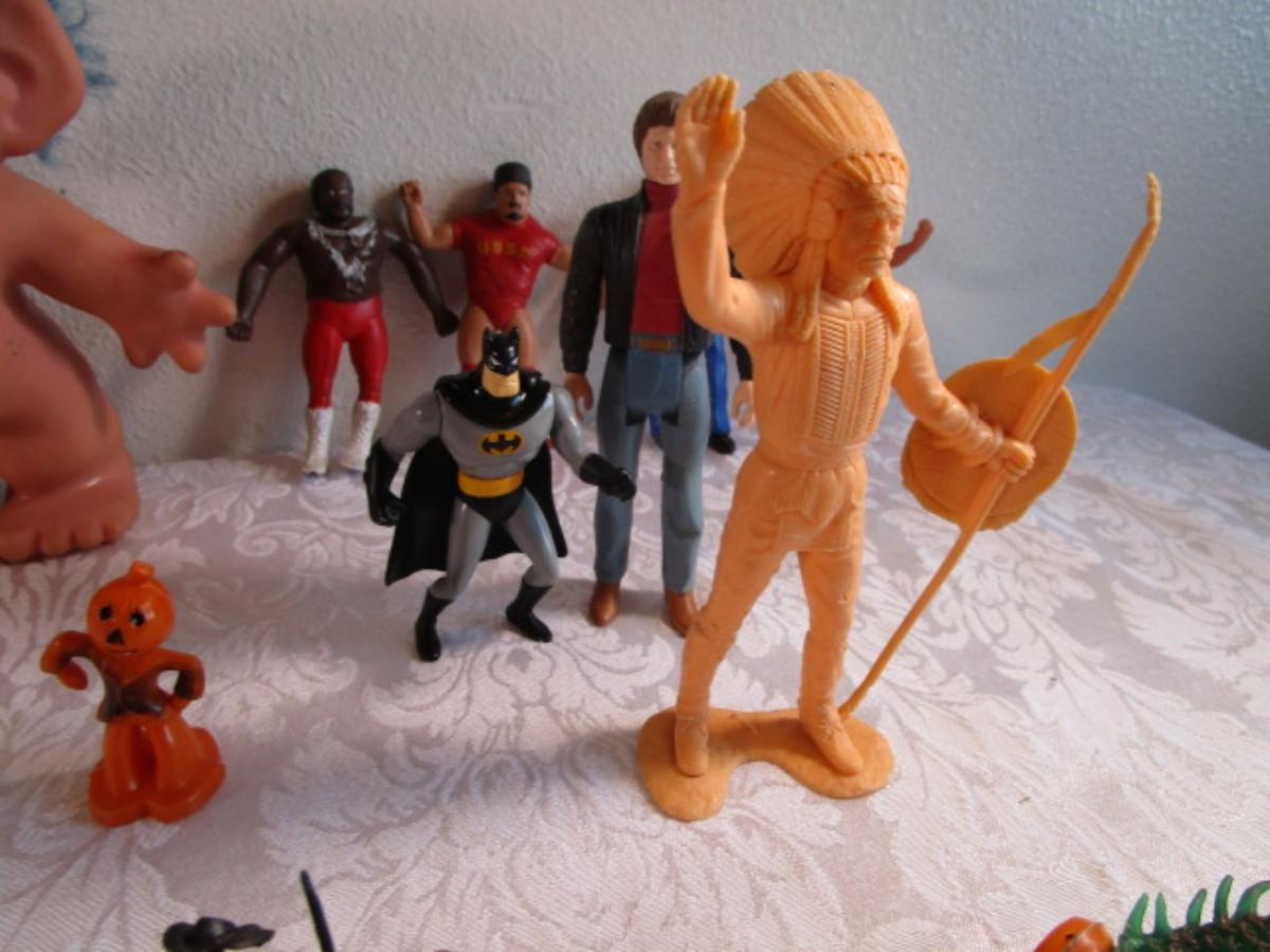 Ninja Turtles figure, troll bank, Batman figure, army men, cowboys & Indians, wrestler figures, tanks, etc. - G