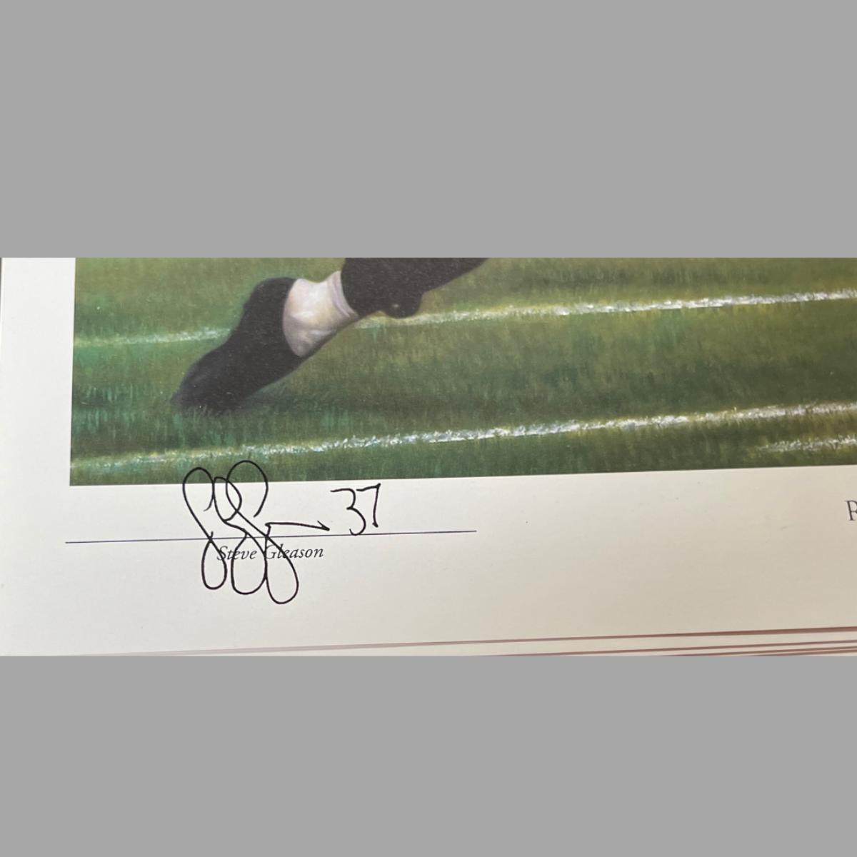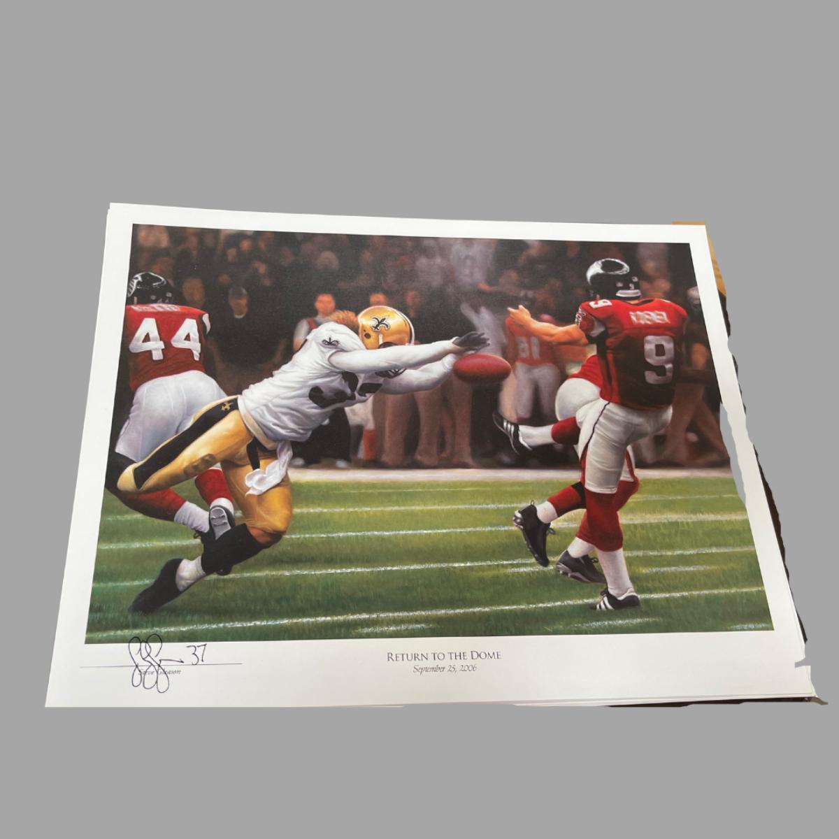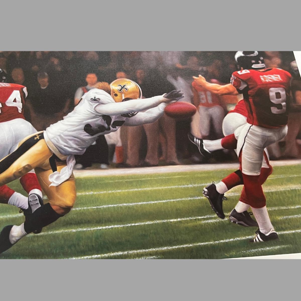 This is a famous block by Steve Gleason in the Return to the Dome. Michael Hunt has recreated it and this is an official signed print. Looks amazing framed. This print is 14 x 11