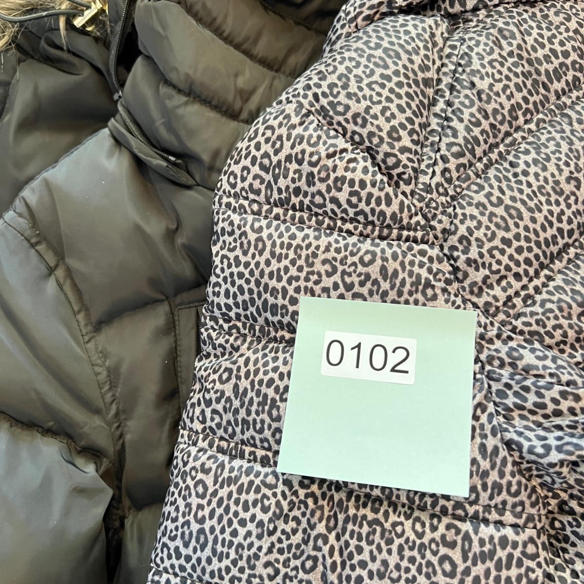 The jacket is "packable down filled" size medium. The coat is size small with removable hood. It has a white cast at the neckline as shown in pics. Looks to be residual makeup and needs cleaning.
