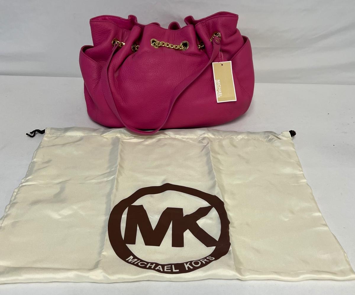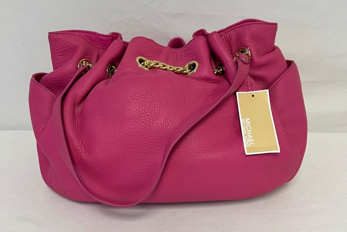NOS. Large zinnia pink leather ring tote bag with gold tone chain. Includes dust cover. Measurement: 16" x 9" (body only). [LA]