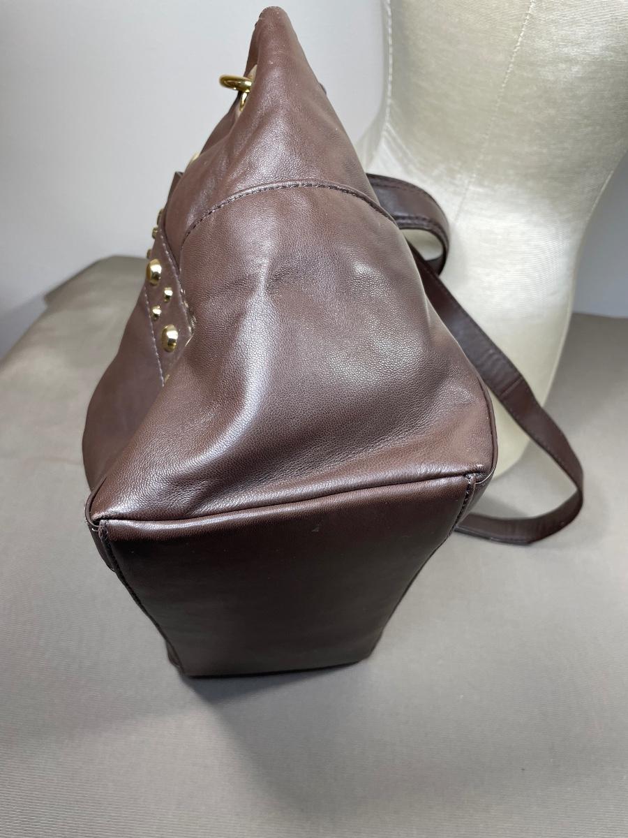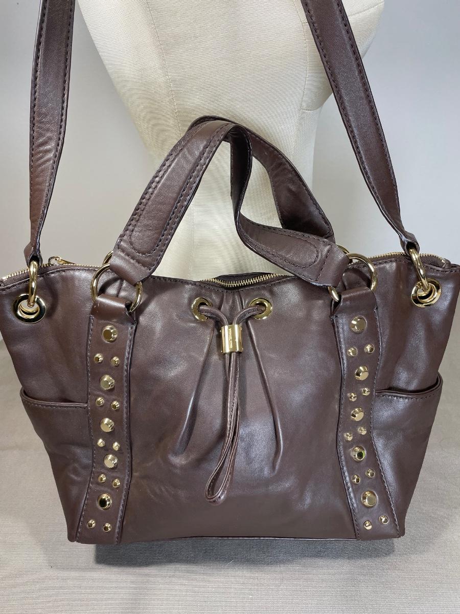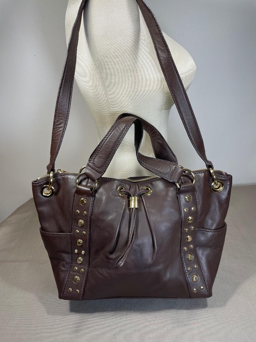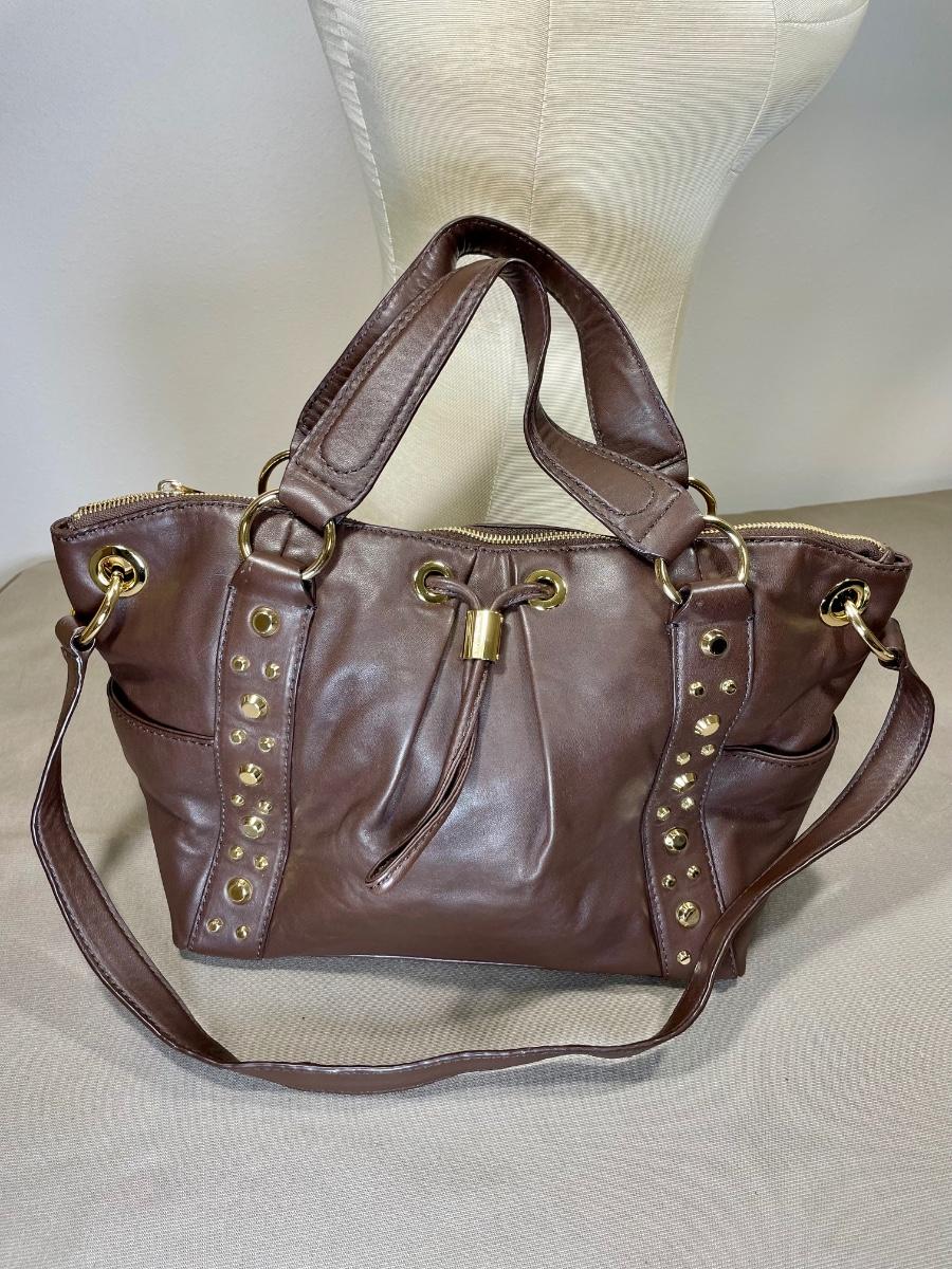 NWOT brown smooth leather with gold tone stud detail and removable crossbody strap.
