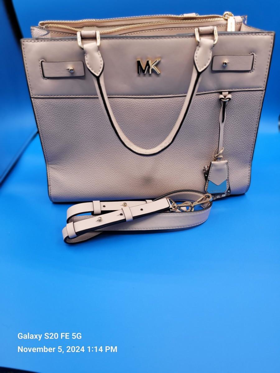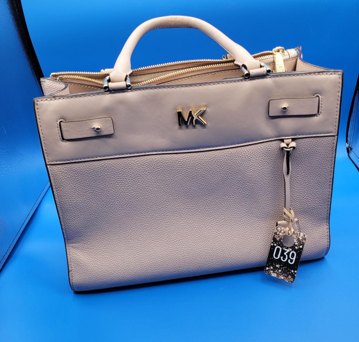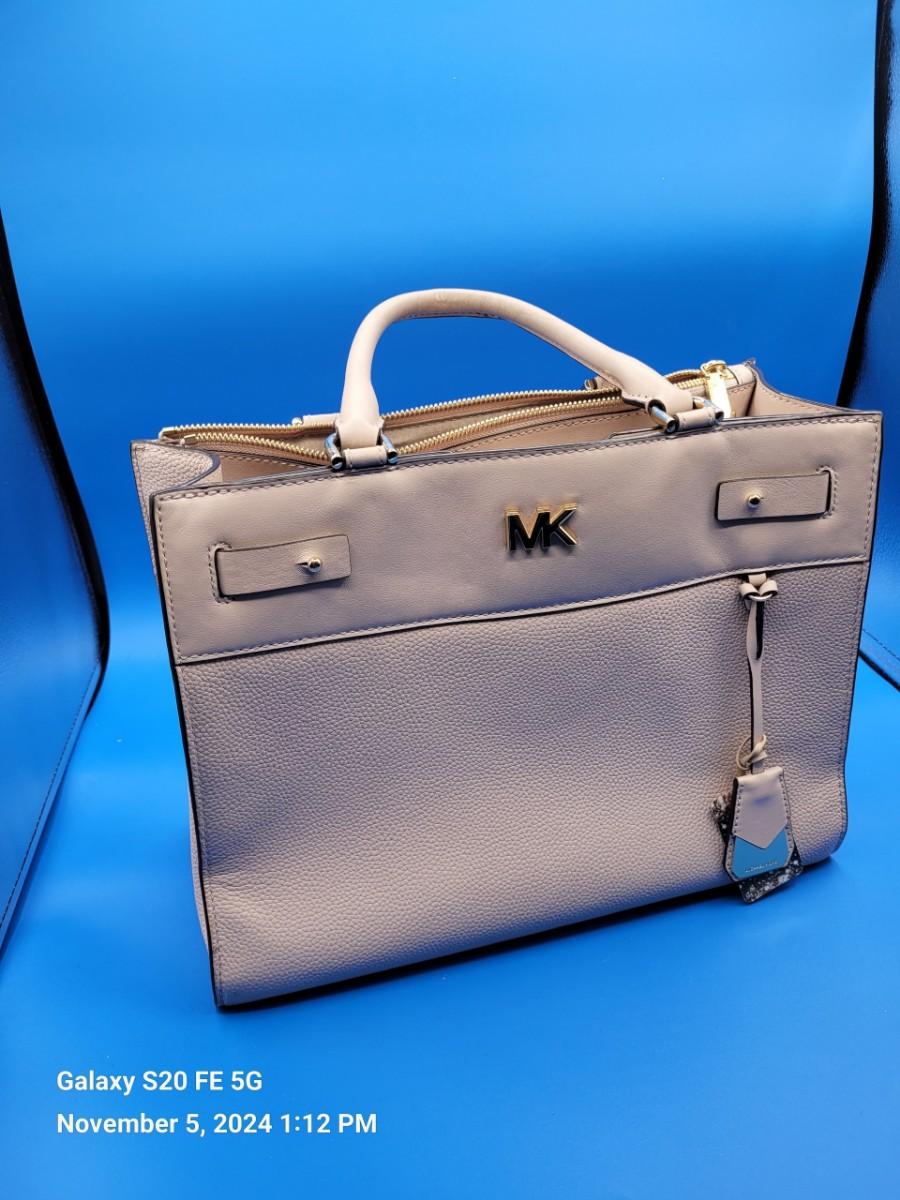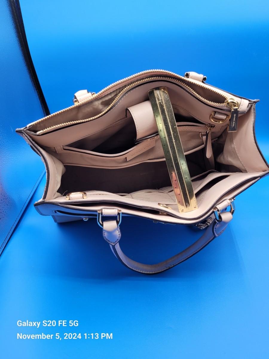 with dust bag, 5 inside posckets, 1 outside pocket. Leather, pale pink with top zip.