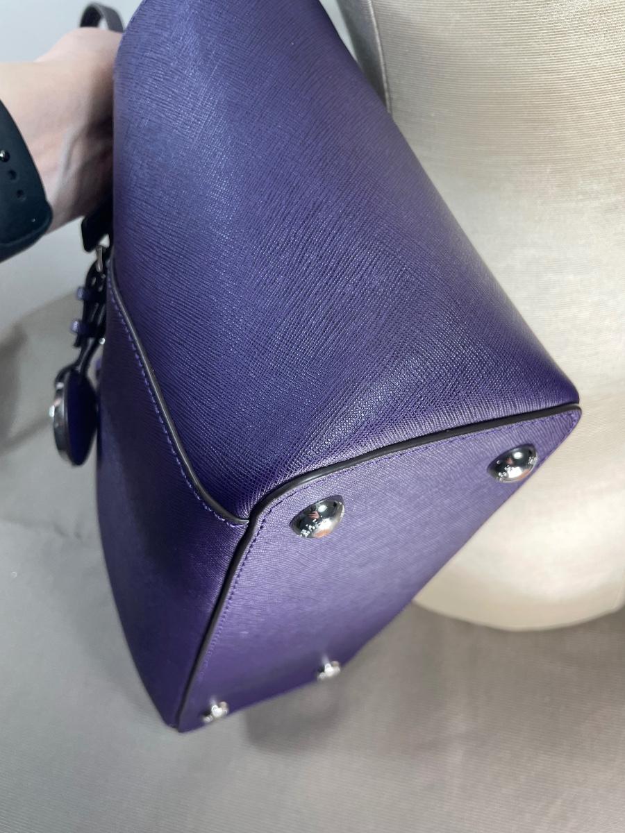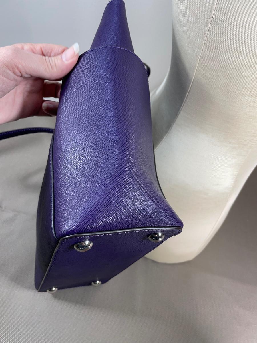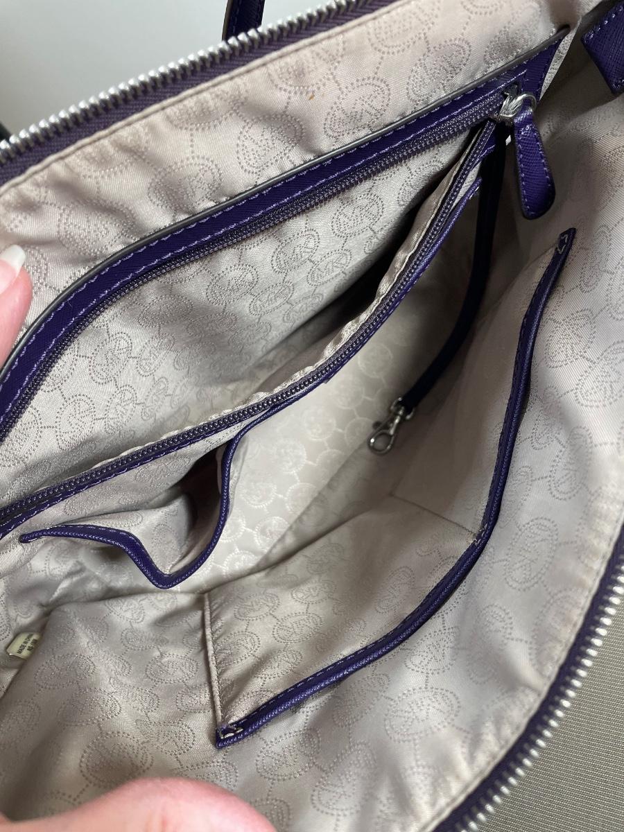 Medium shoulder bag with top zipper closure. 15” wide and 11” high. Excellent clean condition. Wear on metal feet only.