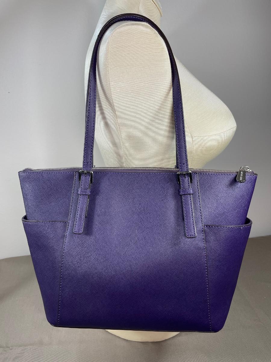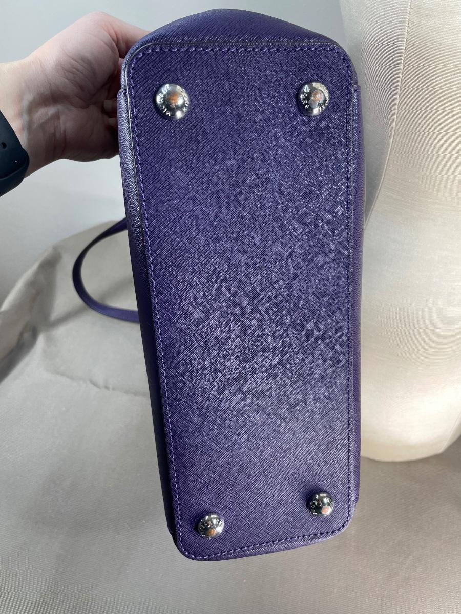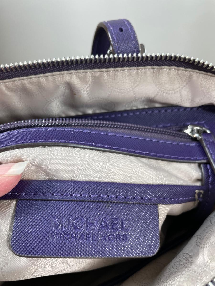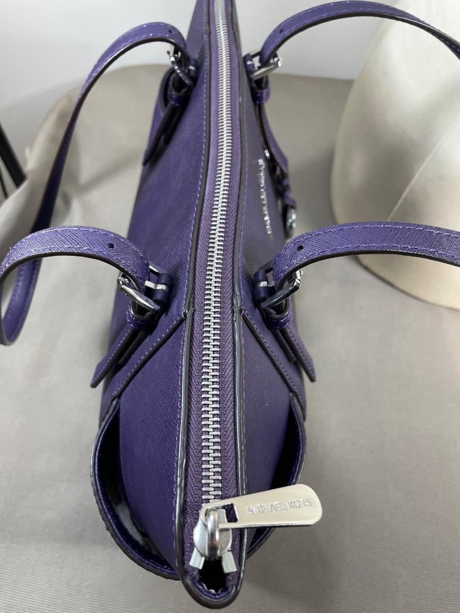 Medium shoulder bag with top zipper closure. 15” wide and 11” high. Excellent clean condition. Wear on metal feet only.