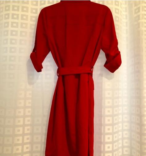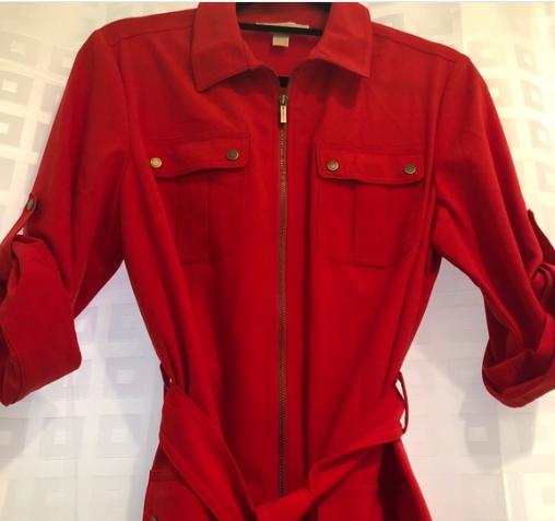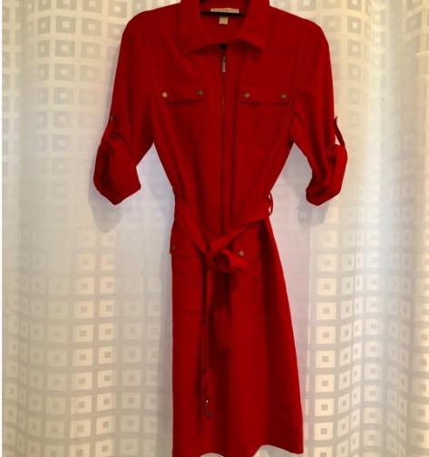 LIKE NEW! Red Michael Kors Polyester Blend (Viscose/Spandex) Stretch Shirt Dress, Spread Collar, Zipper Front (Gold Hardware). Stunning Silhouette Fit, Straight Hem, with Tie Belt, size XL