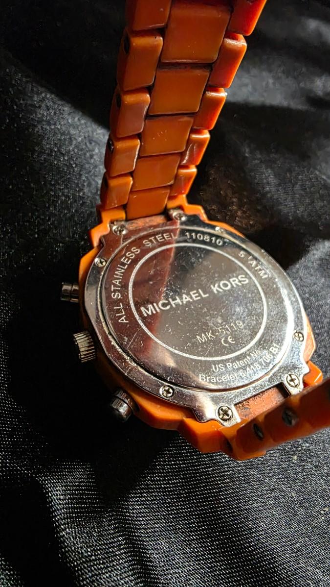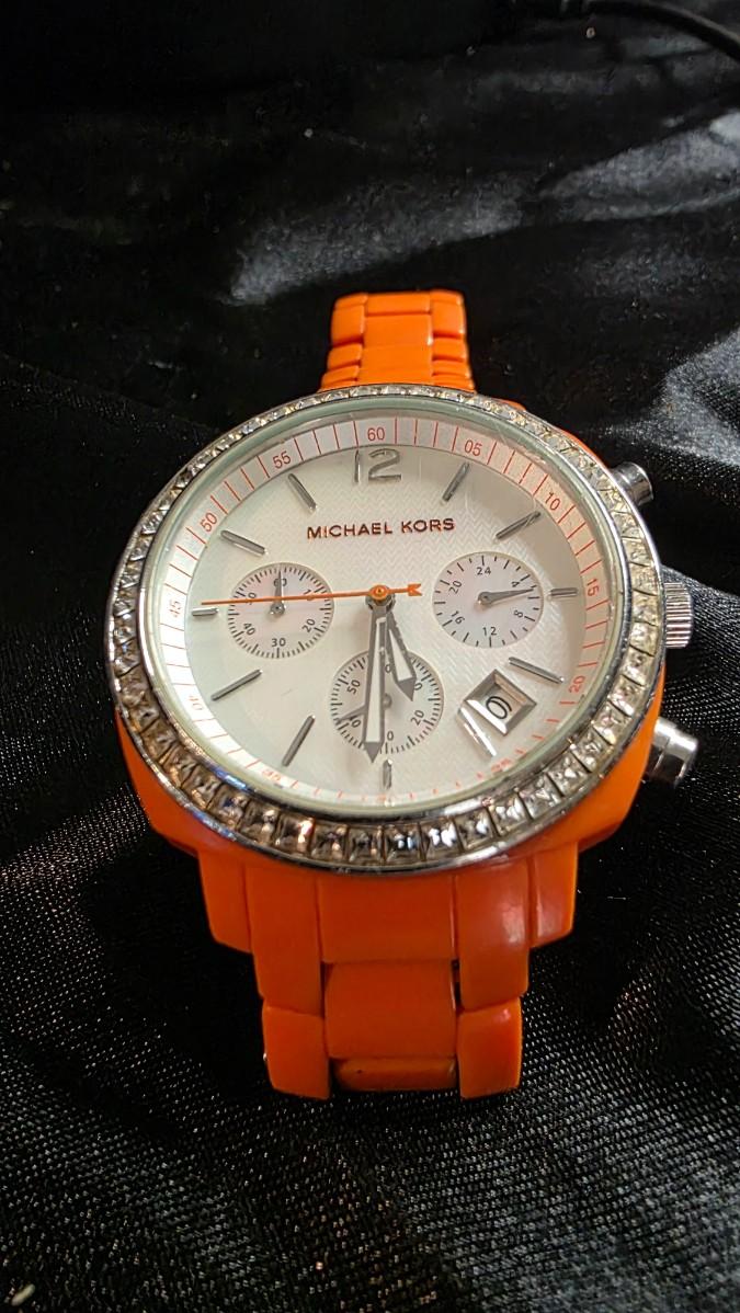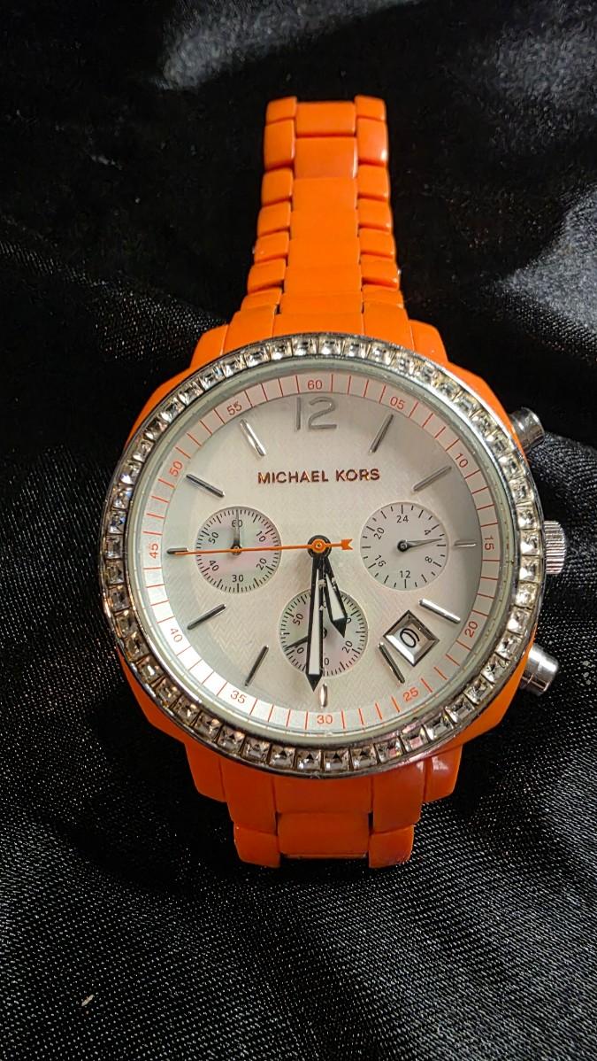 In the vibrant pulse of a summer sunset, where the sky burns orange like a fashionista's boldest choice, a Michael Kors Runway chronograph watch captures the thrill of the runway's edge—a white dial framed by a bezel of sparkling pavé crystals that catch light like paparazzi flashes, the orange resin strap wrapping the wrist with playful tenacity, the three sub-dials ticking with chronograph precision as hands sweep across baton markers and a date window at six o'clock. The stainless steel case gleams with urban polish, the orange hue evoking sunsets over cityscapes and the unapologetic energy of high fashion that turns every glance into a statement.