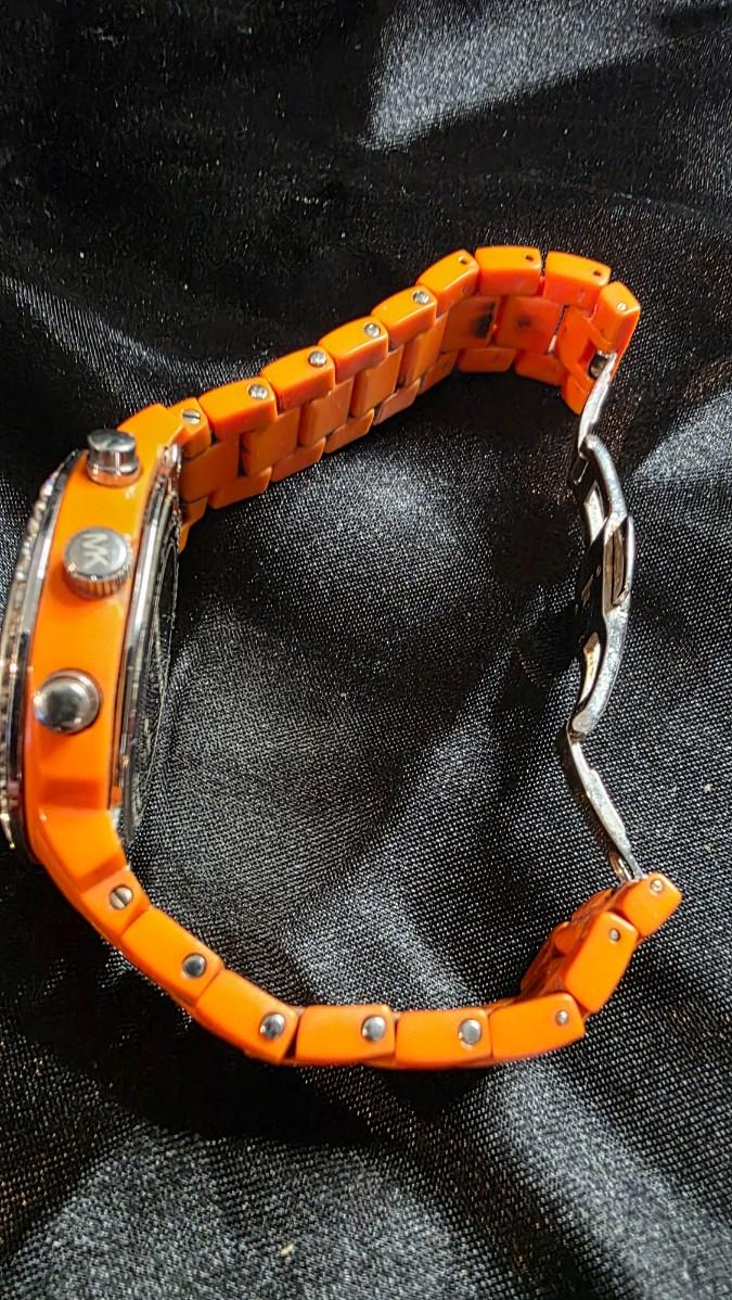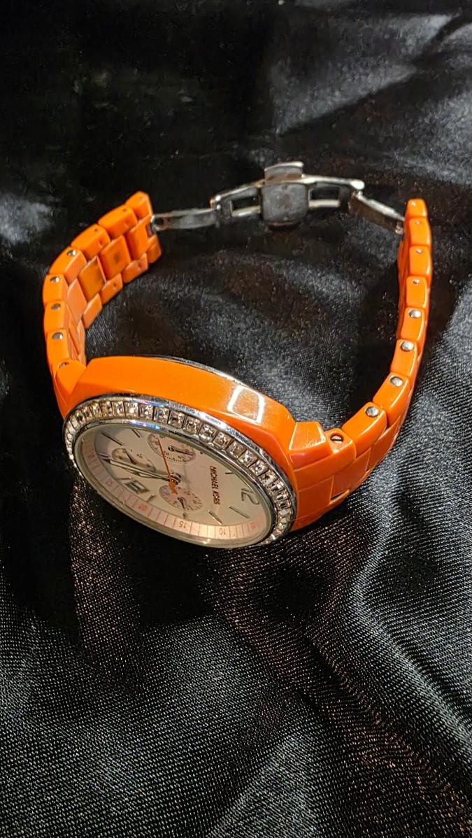 In the vibrant pulse of a summer sunset, where the sky burns orange like a fashionista's boldest choice, a Michael Kors Runway chronograph watch captures the thrill of the runway's edge—a white dial framed by a bezel of sparkling pavé crystals that catch light like paparazzi flashes, the orange resin strap wrapping the wrist with playful tenacity, the three sub-dials ticking with chronograph precision as hands sweep across baton markers and a date window at six o'clock. The stainless steel case gleams with urban polish, the orange hue evoking sunsets over cityscapes and the unapologetic energy of high fashion that turns every glance into a statement.