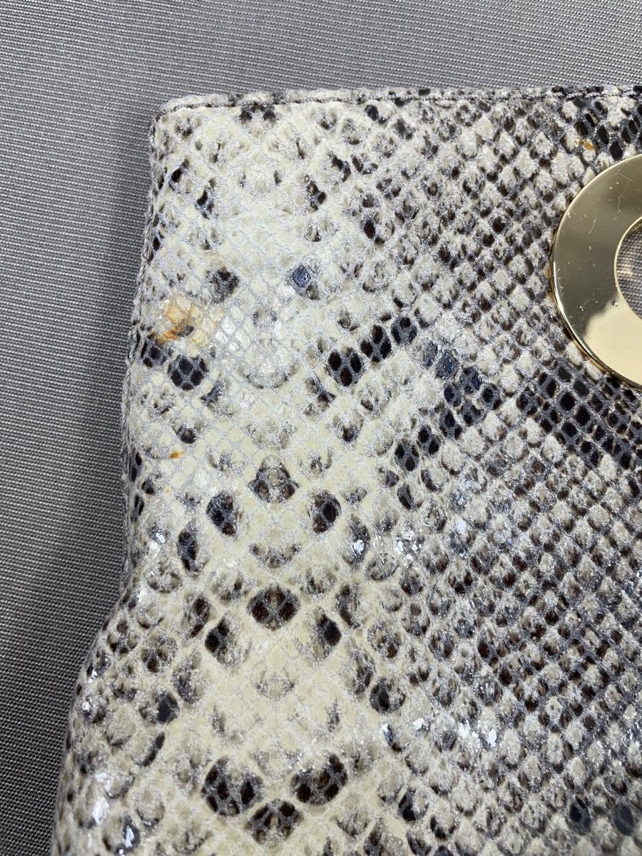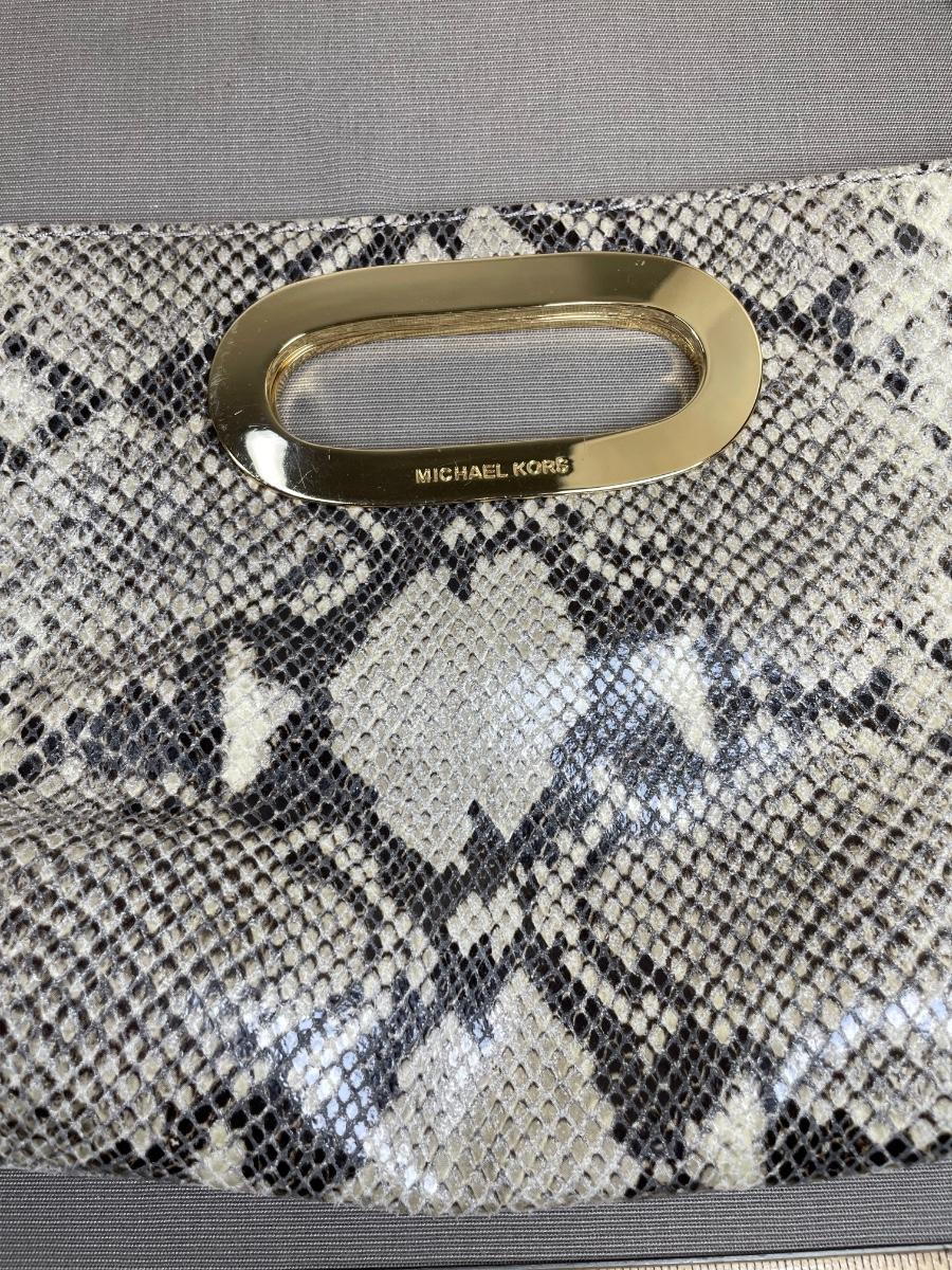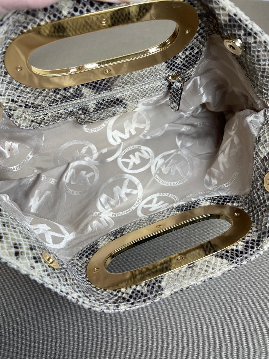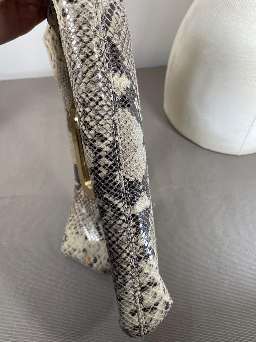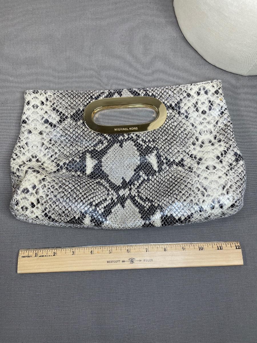 12” by 8” with gold tone handle. Good used condition. One darker spot on back see last photo.