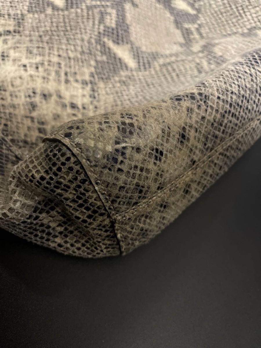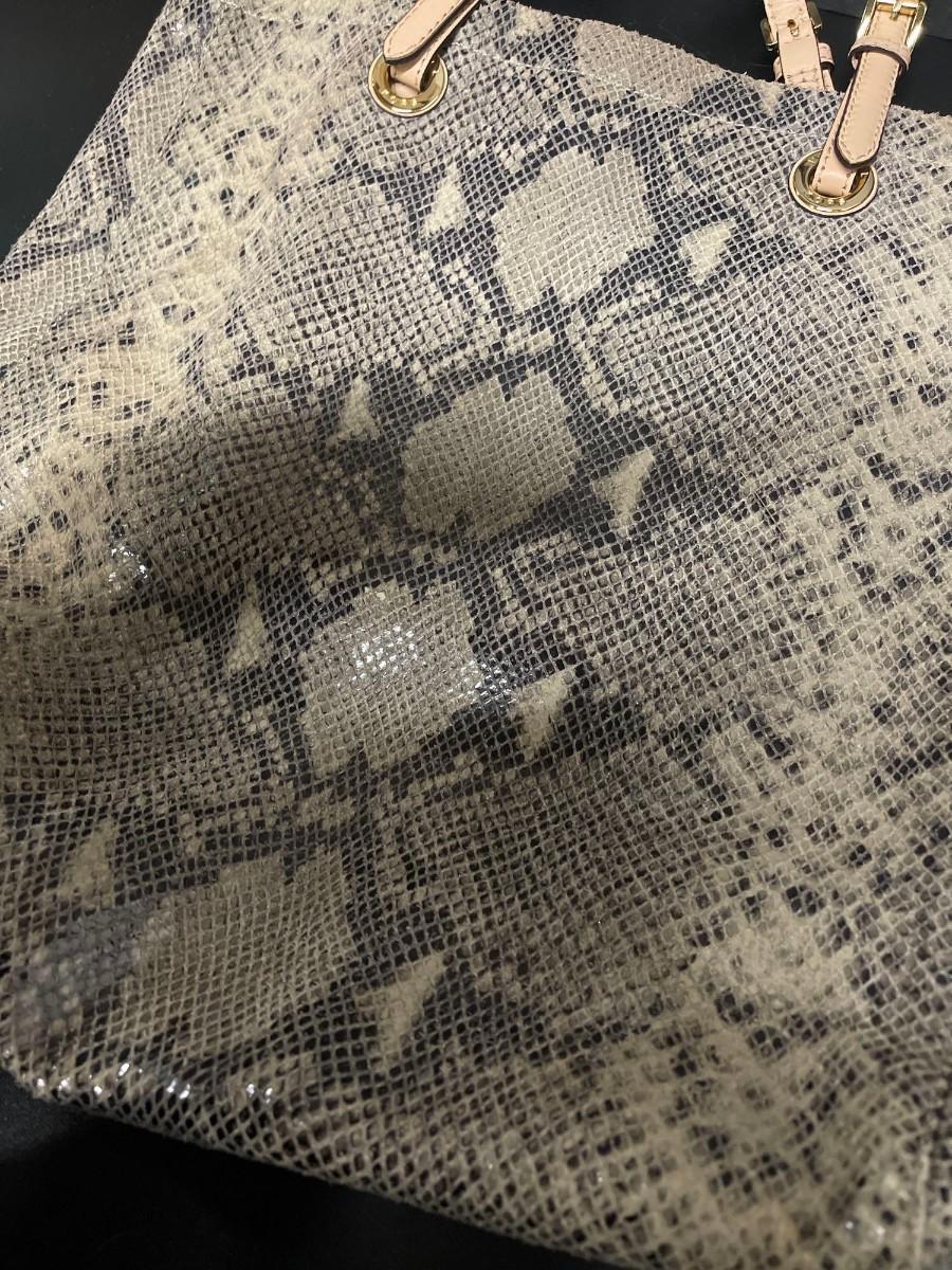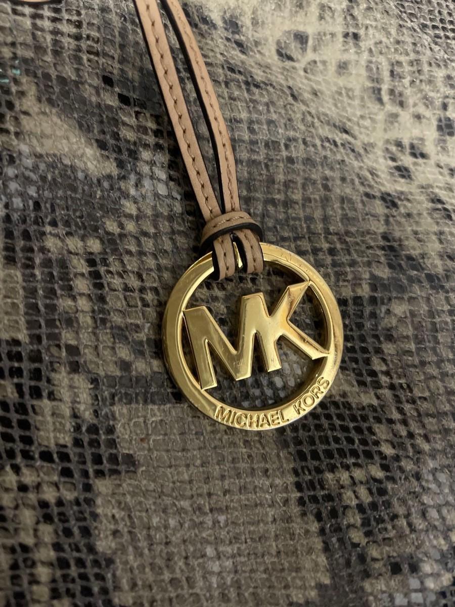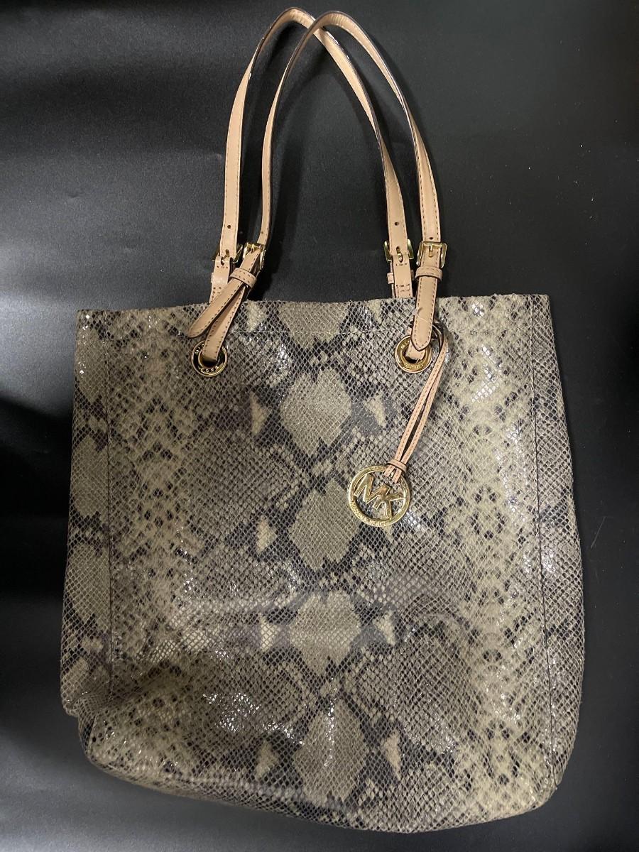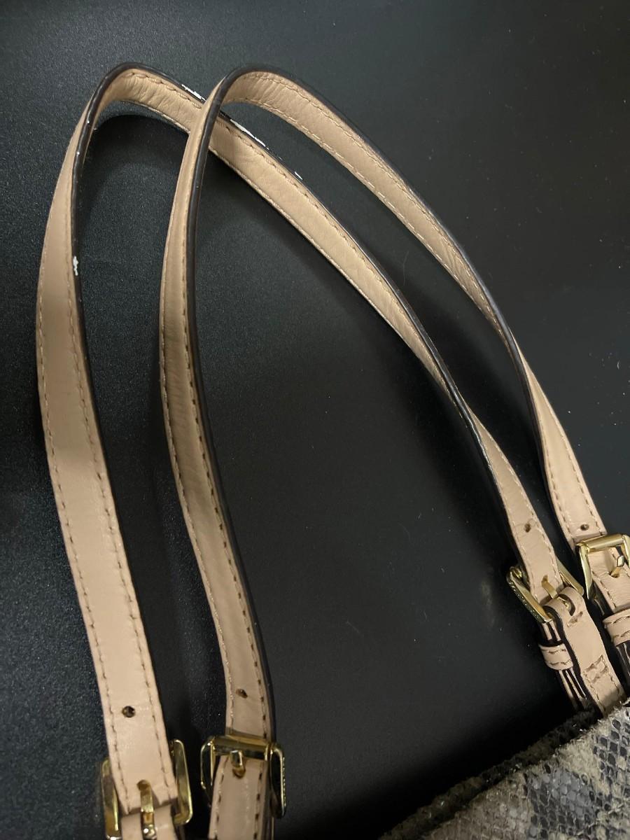 Michael Kors snakeskin tote bag showing very little signs of where except for a few minor scratches to the straps. Also has minor scratching to the hardware. Approx 16” without handles. Handle drop is about 9”.