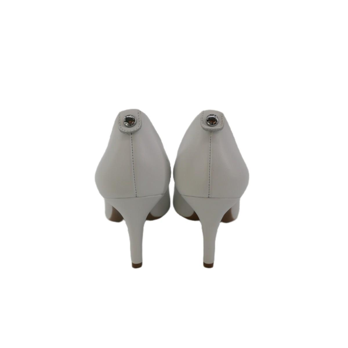 Michael Kors stiletto heel pumps in women's size US 6.5. White outer leather and beige rubber outsoles # PV18K. Heel height measures 3". Beautiful color combination and pointed toe with Michael Kors buttons on back of shoe. Amazing, excellent condition! Very slight scuffing around heels. No original box. This lot has a reserve price. (F17)
