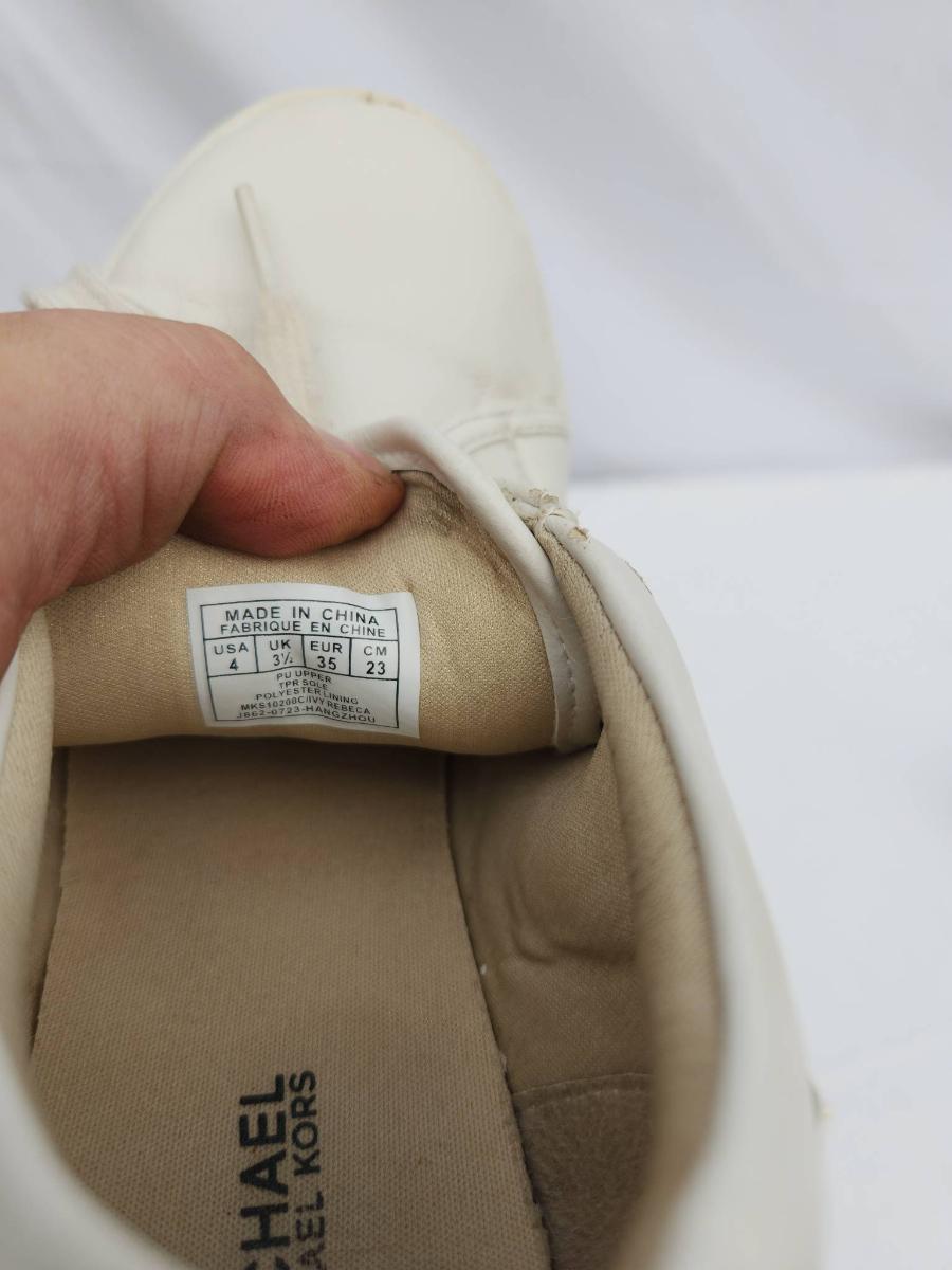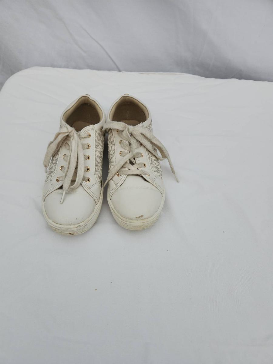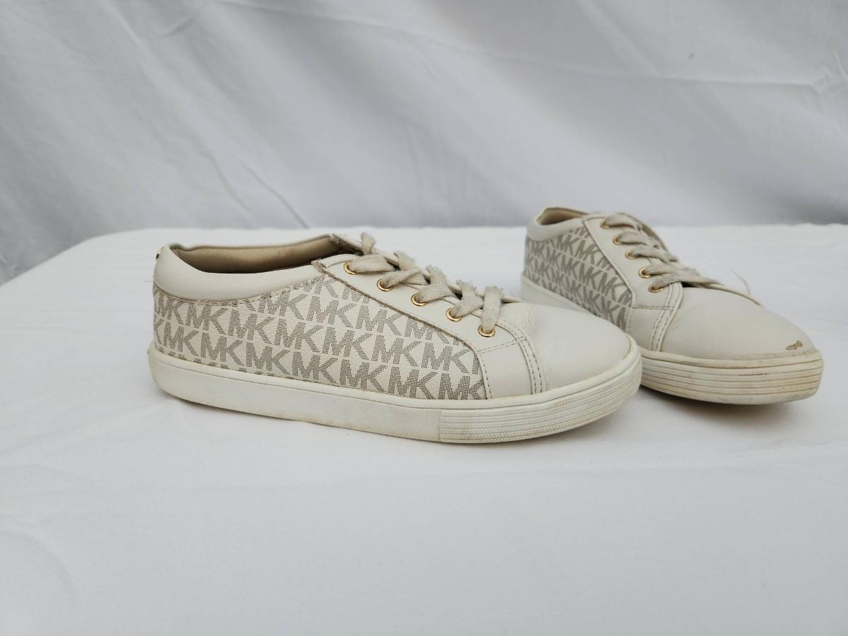 Michael Kors women's lace-up sneakers with monogram print. Tagged as size US 5.5 (EU 35, UK 3). Features beige canvas and leather with gold-tone eyelets. Moderate wear visible on soles and minor scuffs on toes. Made in China.