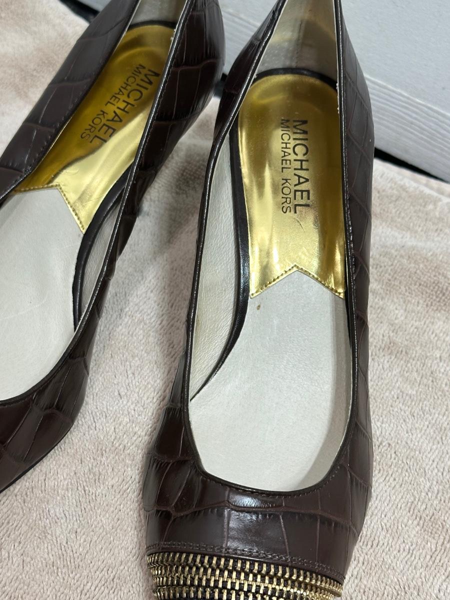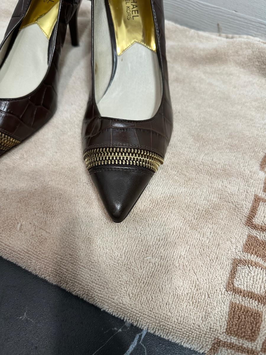 Michael Michael Kors brown crocodile-embossed leather pumps with a gold zipper detail on the toe.