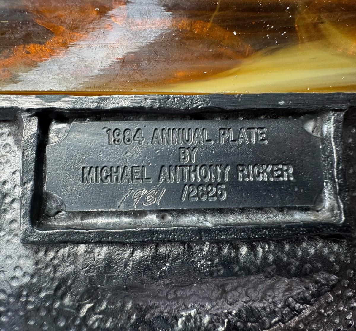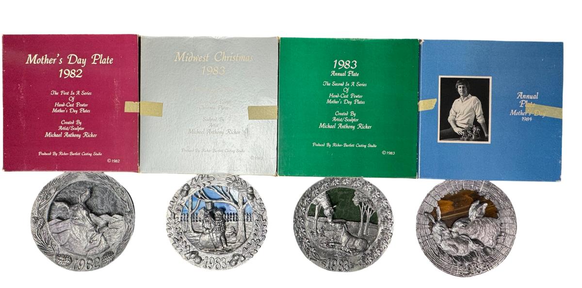 NOS. From 1982, 1983(x2), and 1984. Includes Midwestern Christmas, Mother’s Day, and more. Total of four plates. Each plate has a colored glass insert. The boxes have storage related wear. Measurement: 8” Diameter (each). [SR]