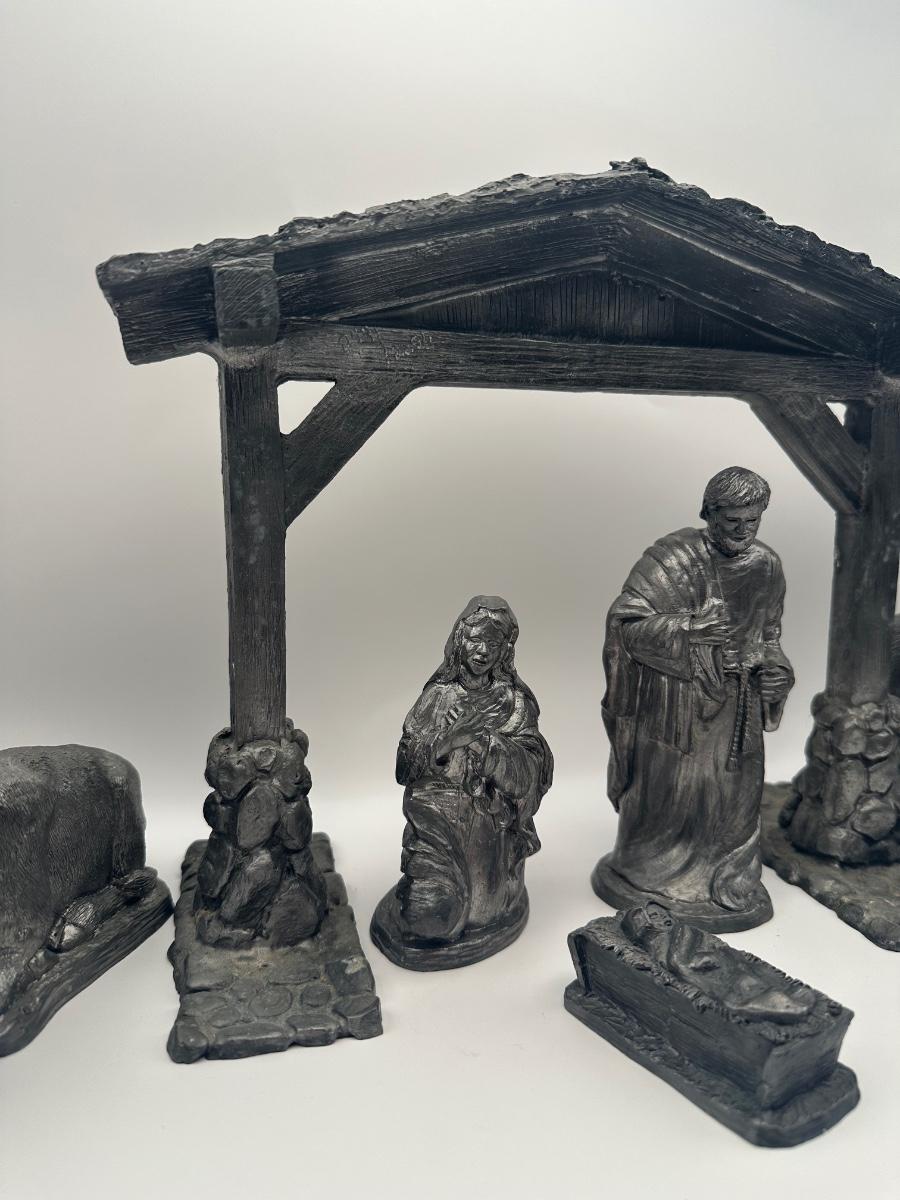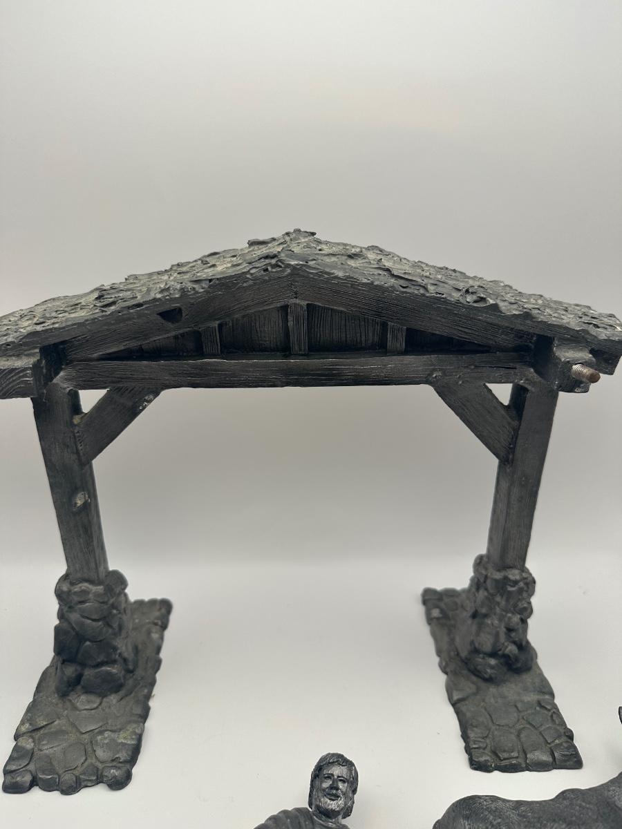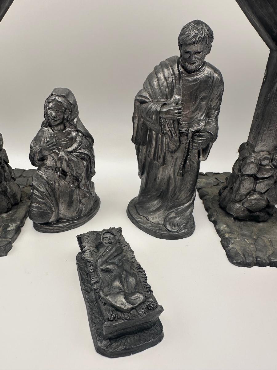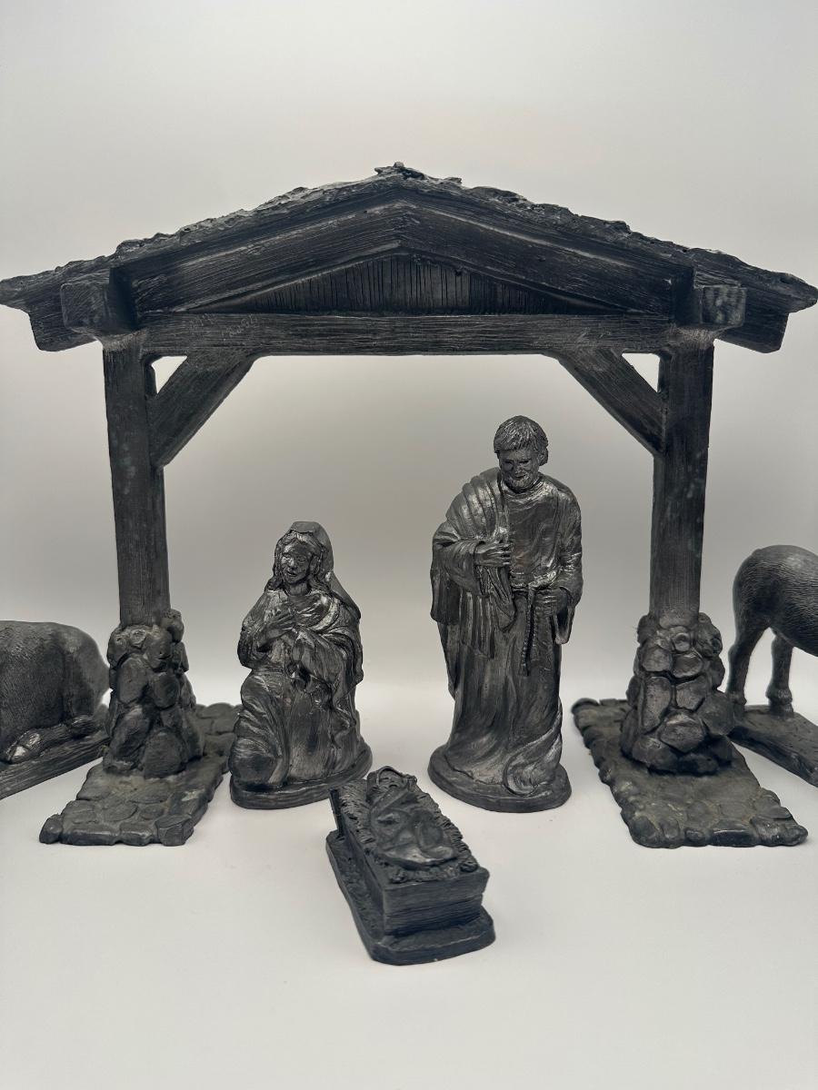 Handcrafted pewter nativity set by Michael Ricker for Rawcliffe Pewter, made in the USA, including stable, Mary, Joseph, infant Jesus in manger, ox, and donkey.