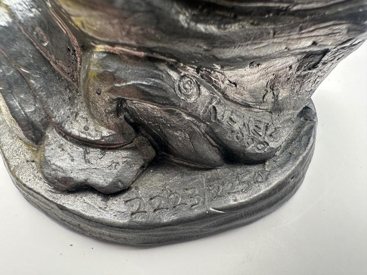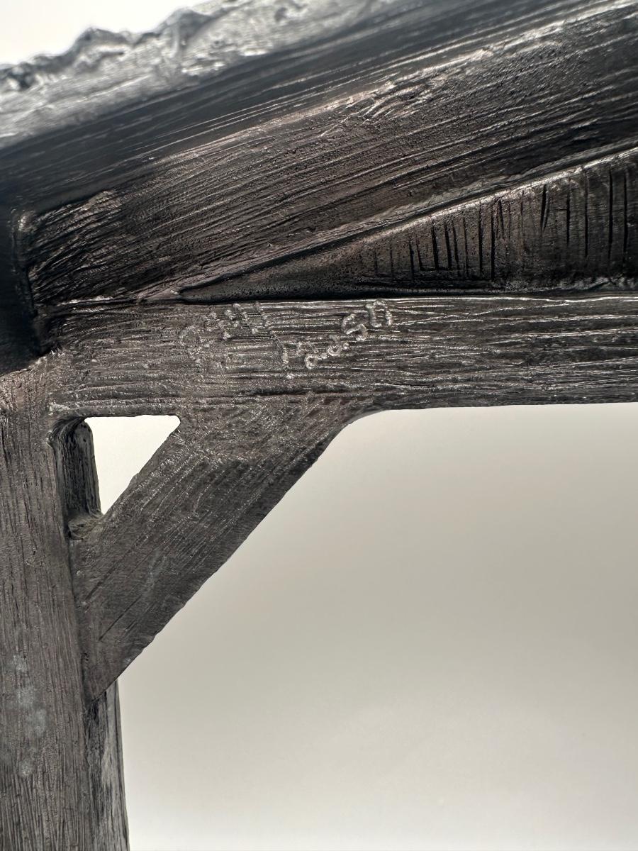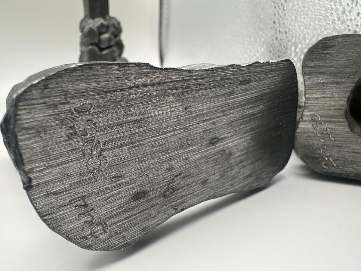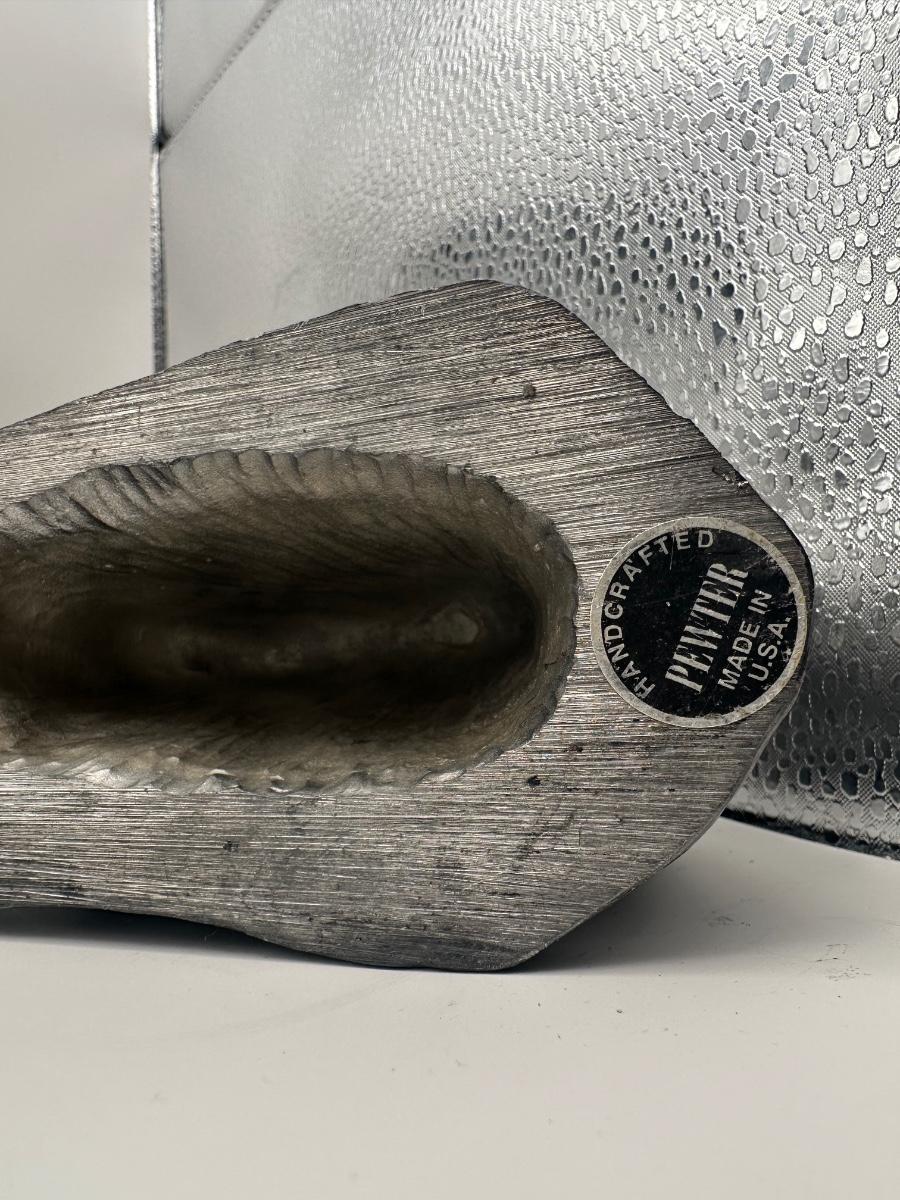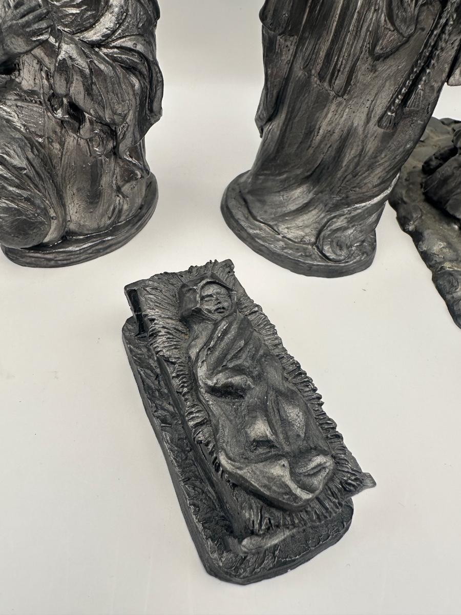 Handcrafted pewter nativity set by Michael Ricker for Rawcliffe Pewter, made in the USA, including stable, Mary, Joseph, infant Jesus in manger, ox, and donkey.