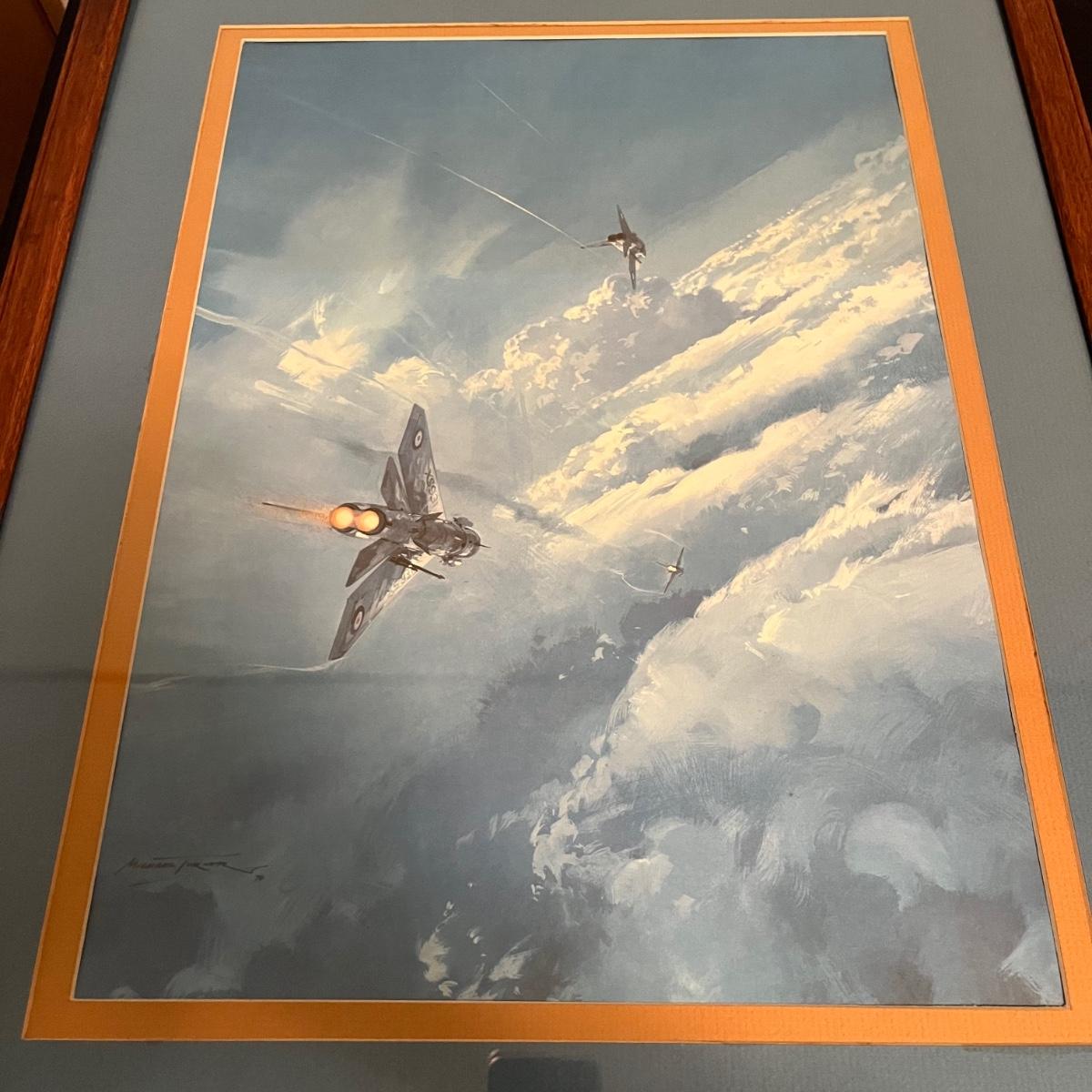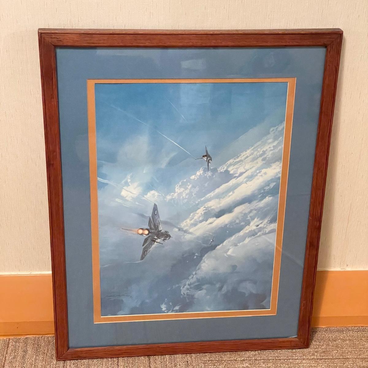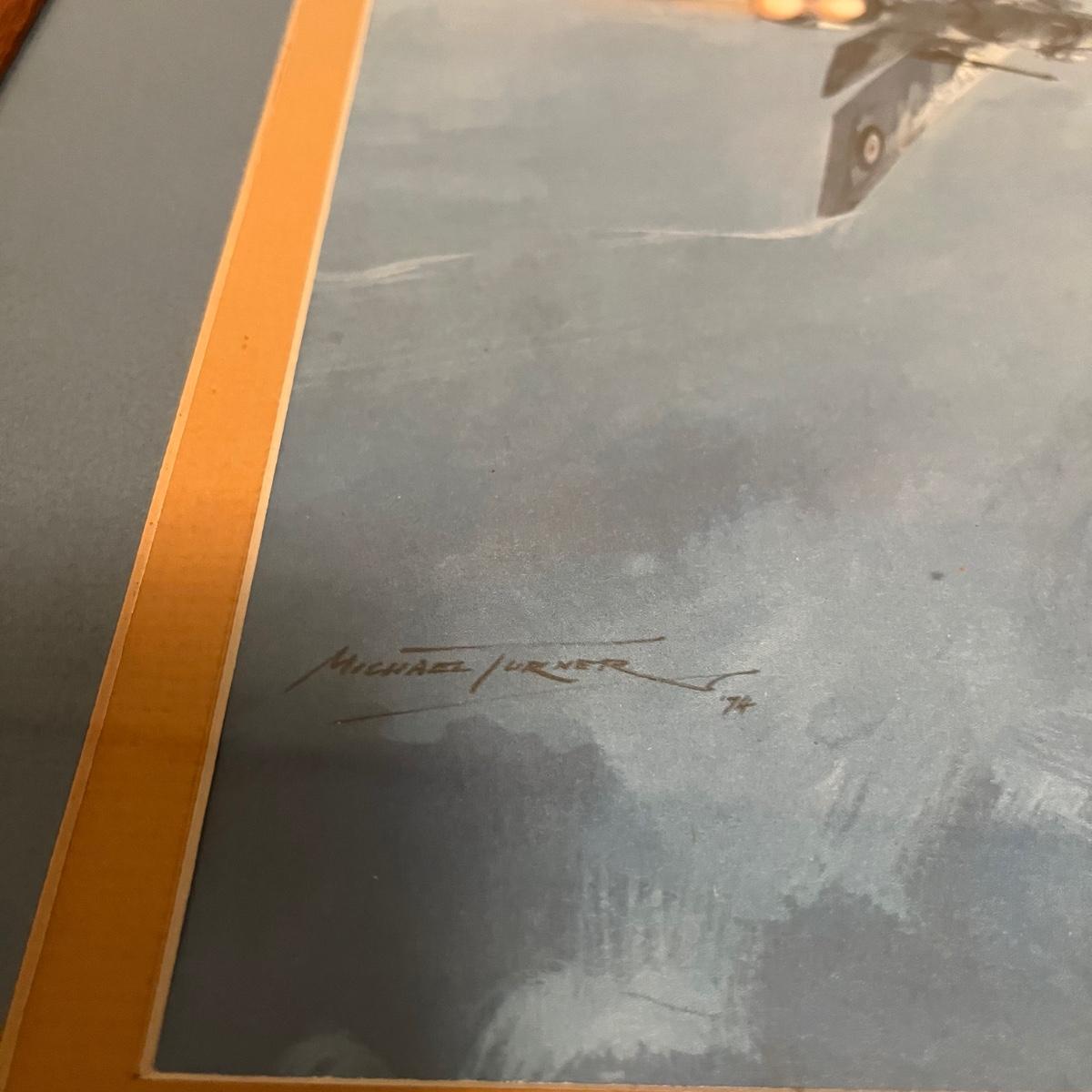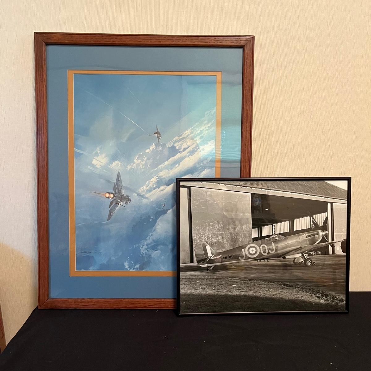 Lot includes a wooden framed and minted print by Michael Turner of two Jets pictured in flight and a framed photo of a propeller powered plane. Largest frame measures 19” x 24.5”. The Michael Turner print has a signature but it appears to be a stamp.