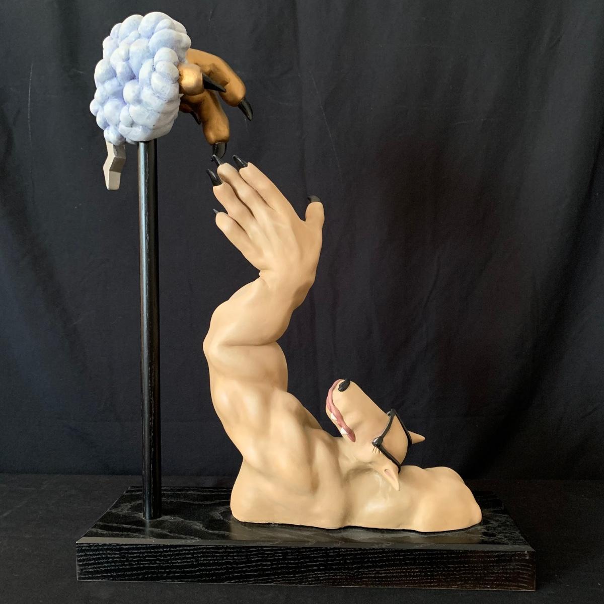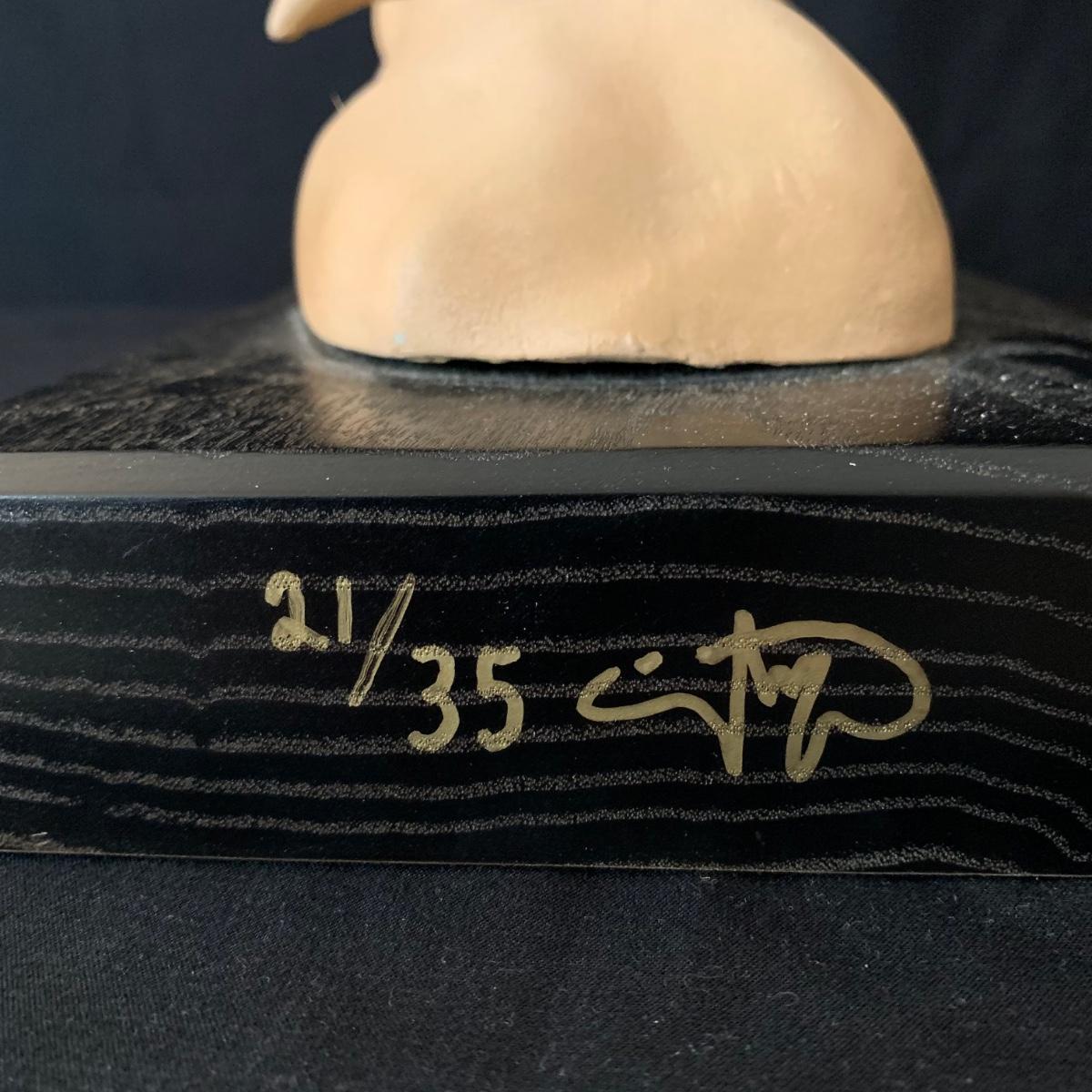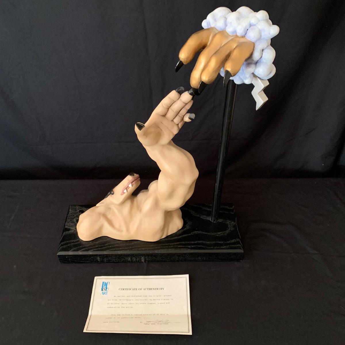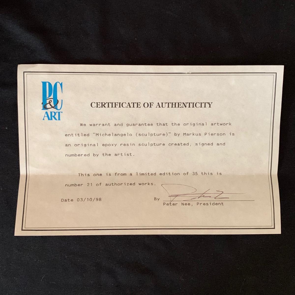 Sculpture titled “Michelangelo” by Markus Pierson. Sculpture comes with a Certificate of Authenticity stating that it is an original epoxy resin sculpture created, signed, and numbered by the artist. It is hand-painted and it measures 17” x 6” x 22”.