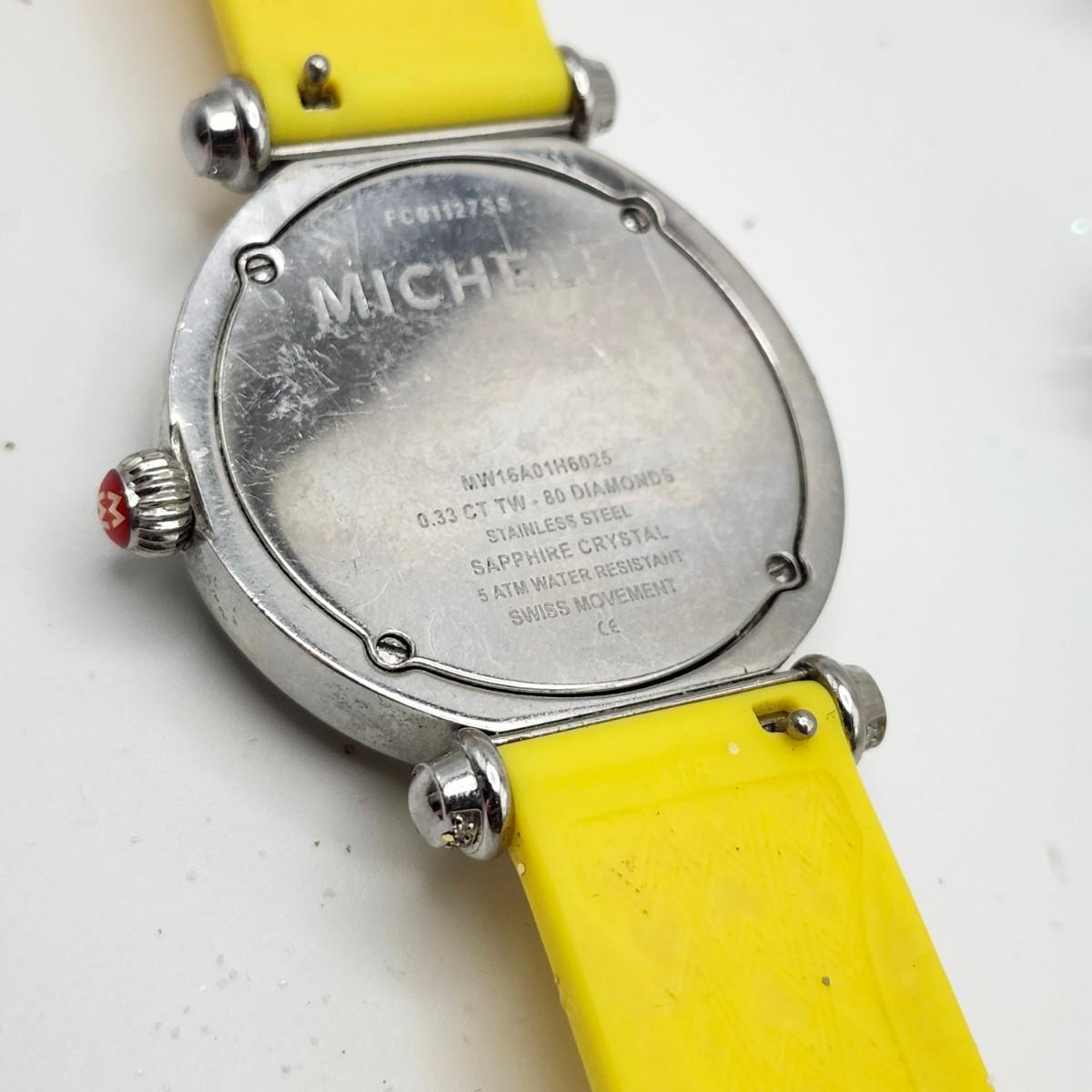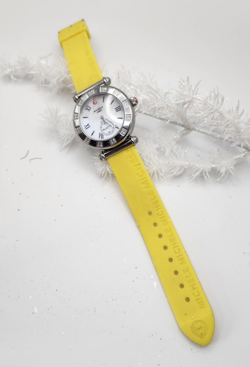 Lovely Michele Caber watch retails at $695.00. Stainless steel Mother of Pearl dial. Diamond bezel.