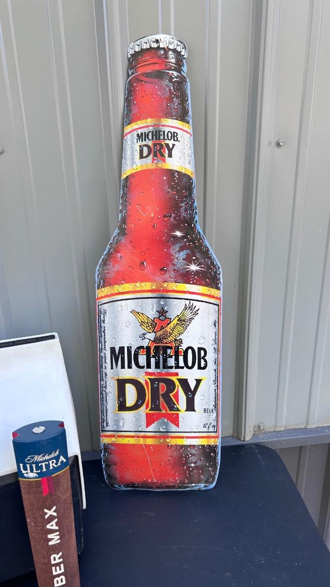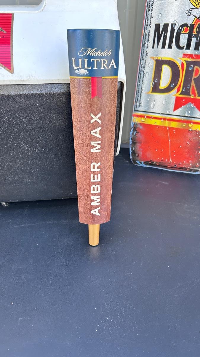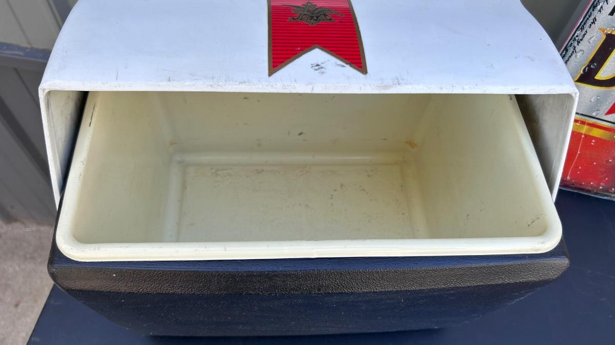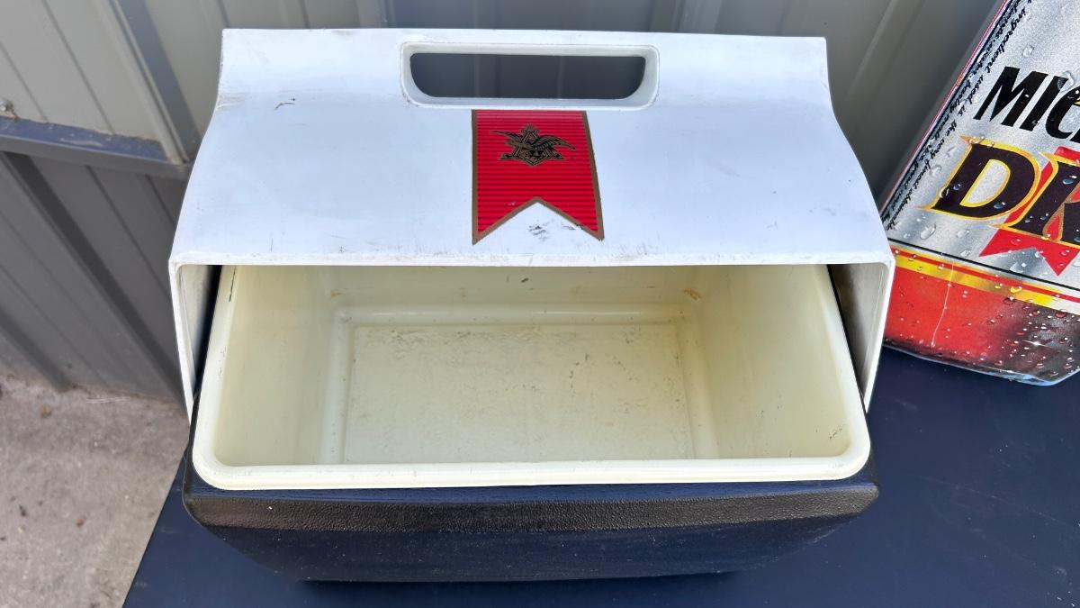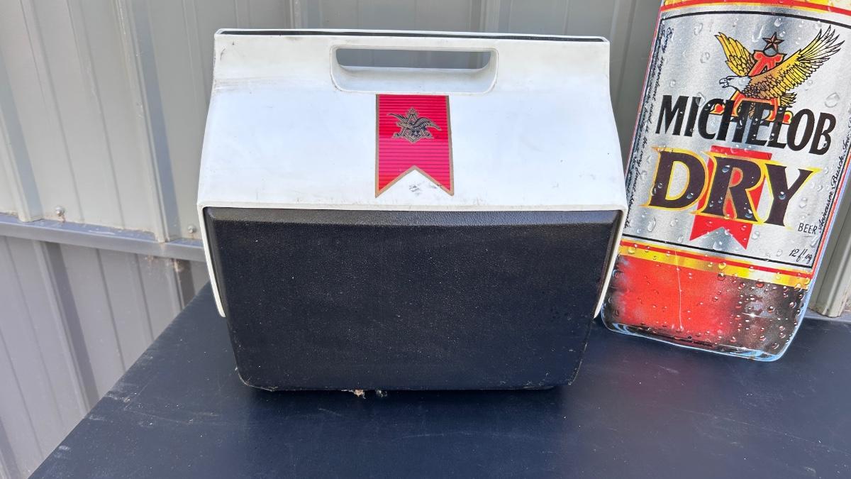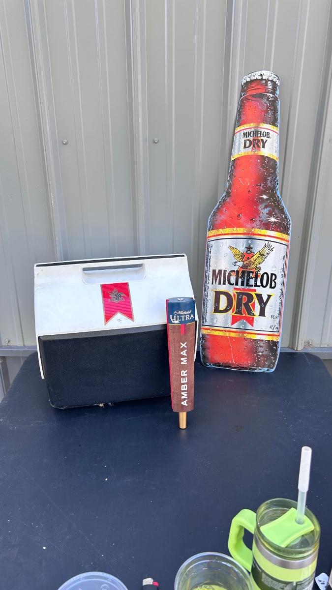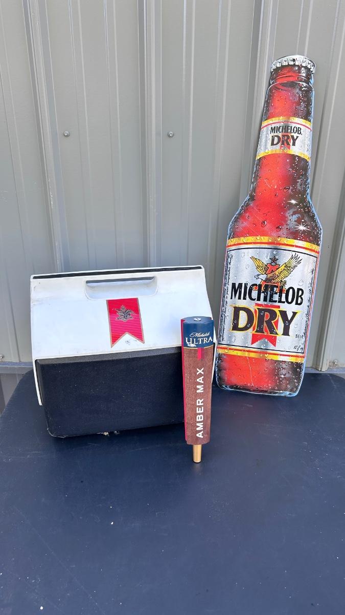 MICHELOB IGLOO COOLER, BEER TAP HANDLE AND TIN SIGN