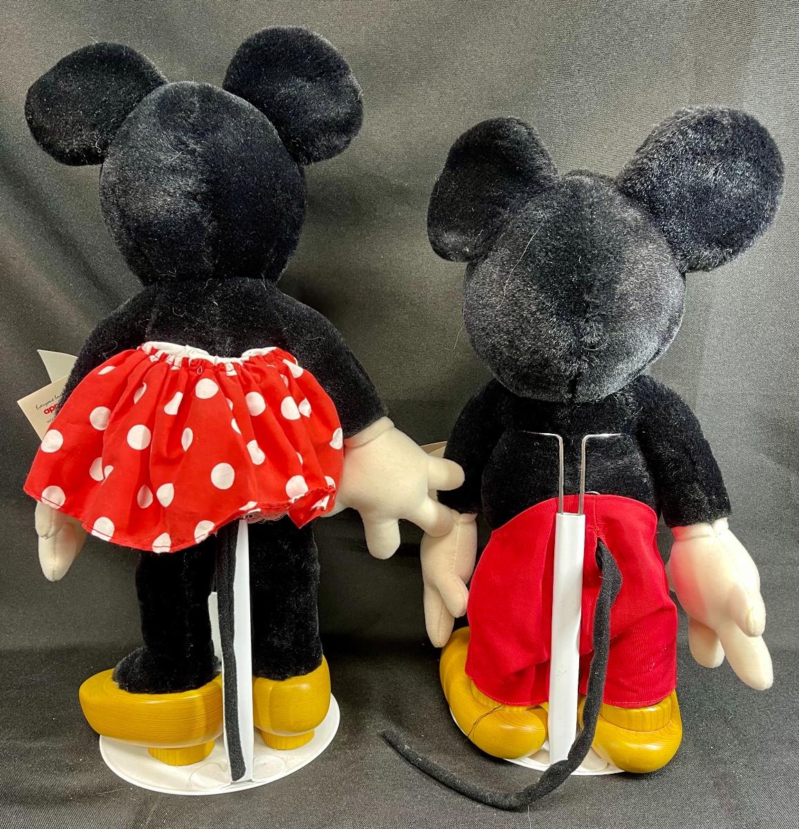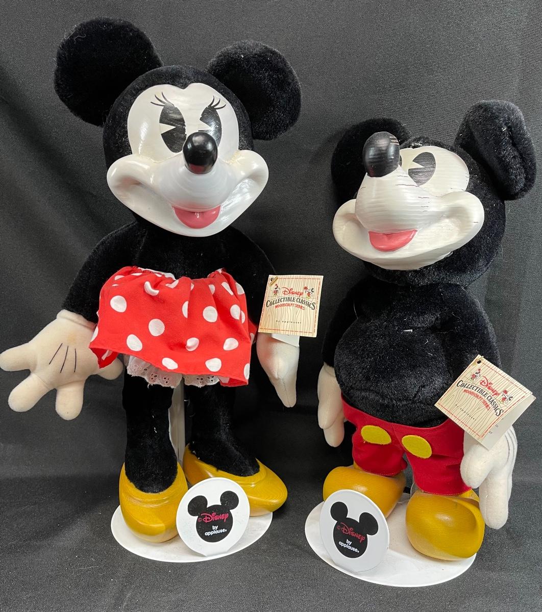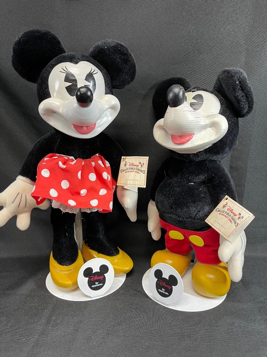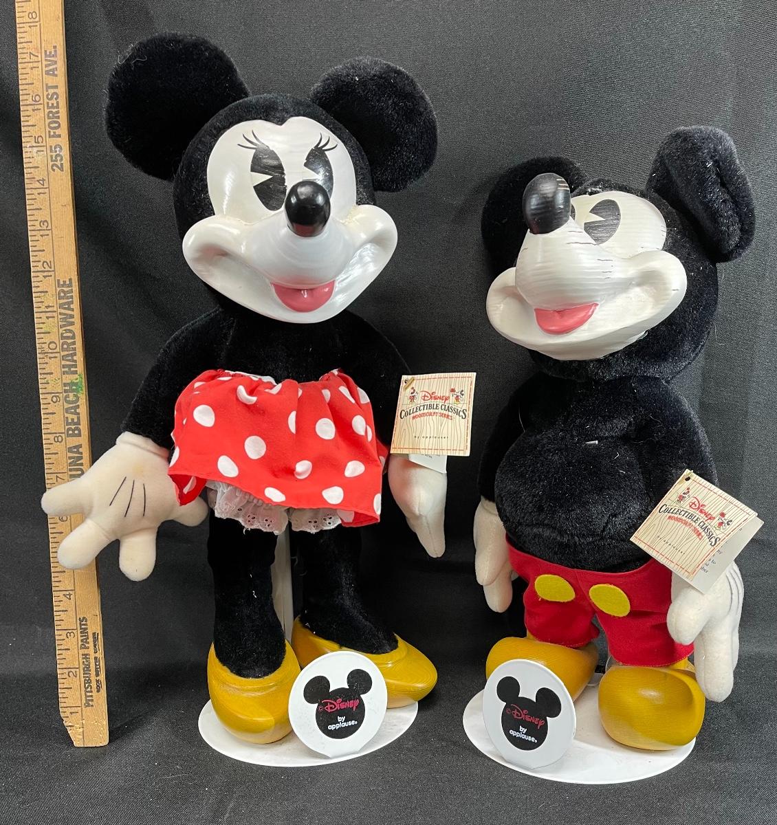 Mickey and Minnie mouse Disney character applause plush dolls. Painted wood faces. Good condition. Original hang tag and stands.