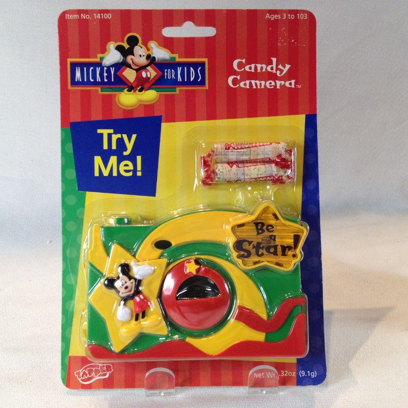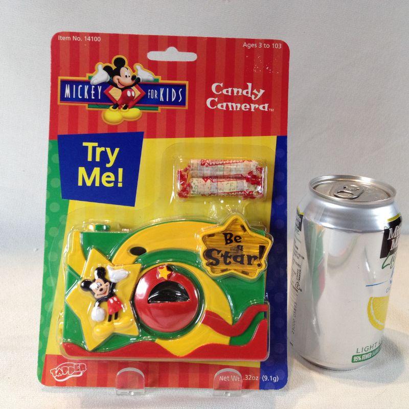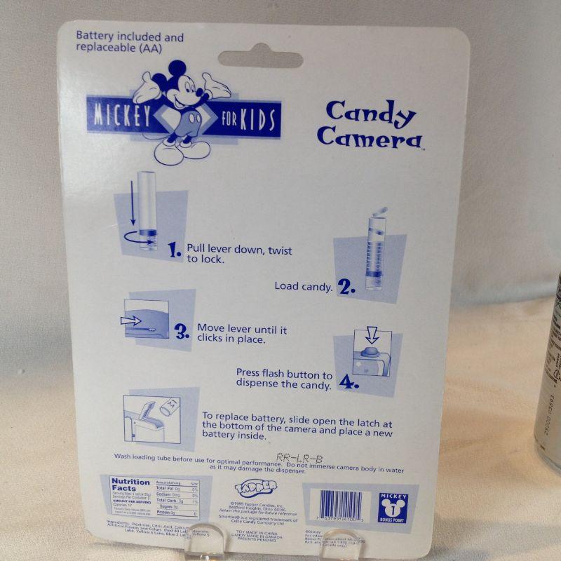 This lot is really cool. The Mickey Mouse Camera dispenses candy by pushing the shutter button. Original packaging in very good condition except for the old included candy. Candy doesn't look appealing and should not be consumed. Takes a AA Battery which was included but we doubt it will still work.