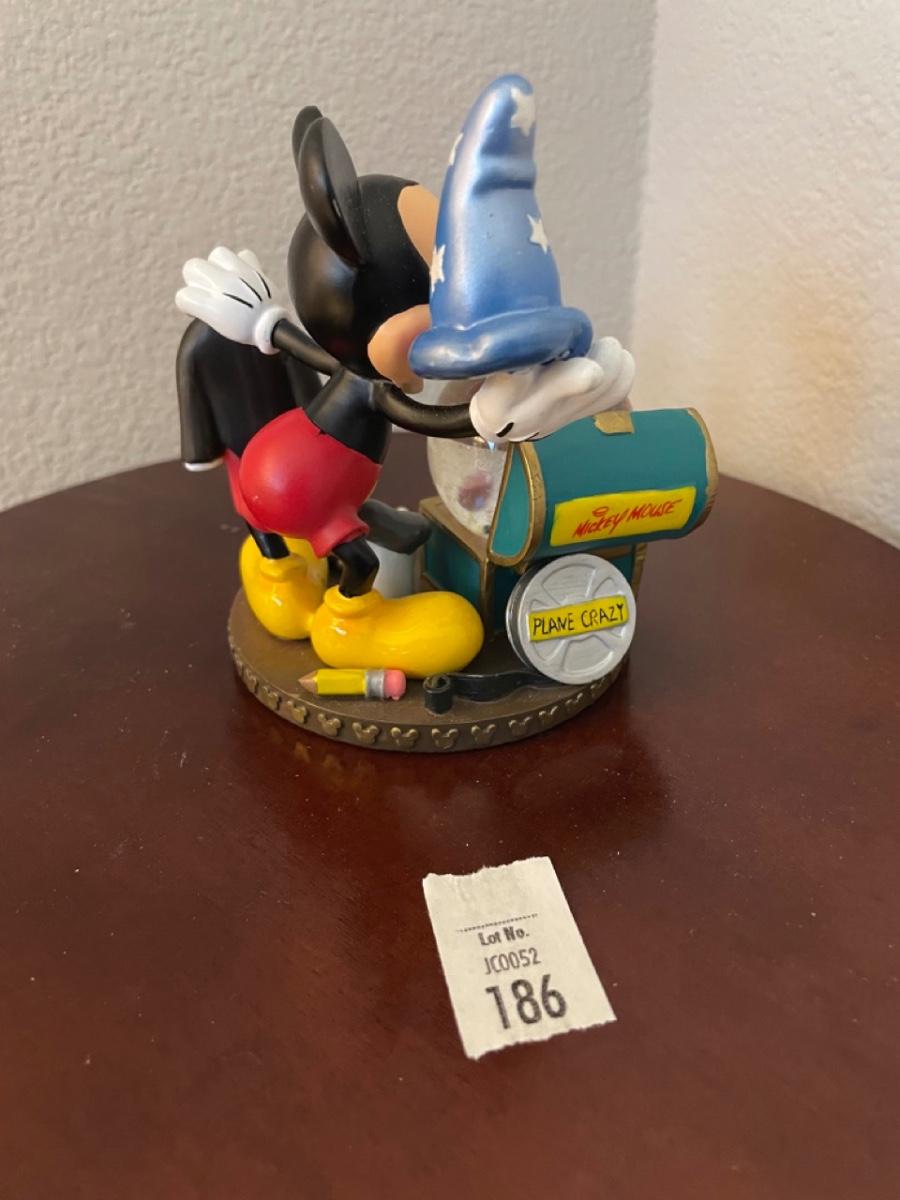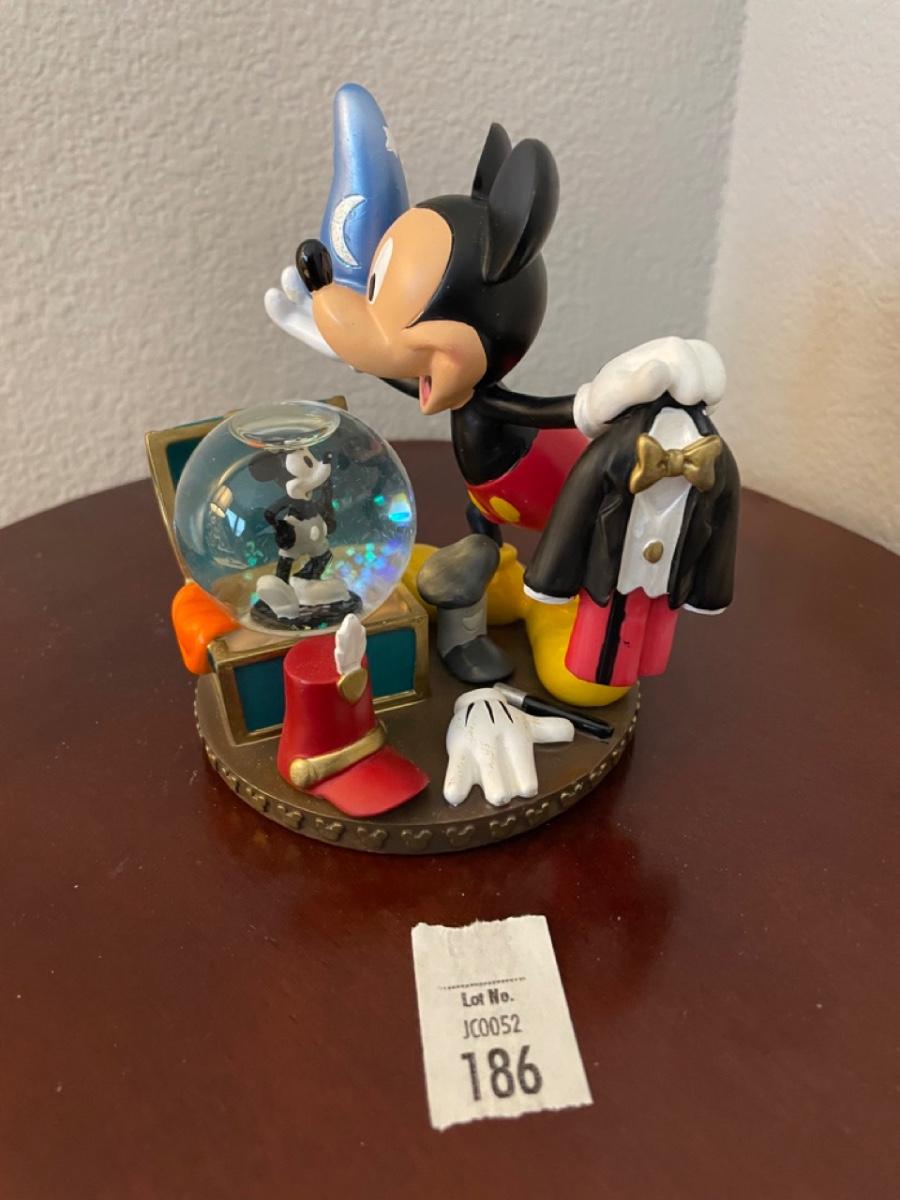Mickey & mini snow globe with Steamboat Willie inside. Steamer truck and different costumes: Sorcerer Mickey, Tuxedo. Plane Crazy