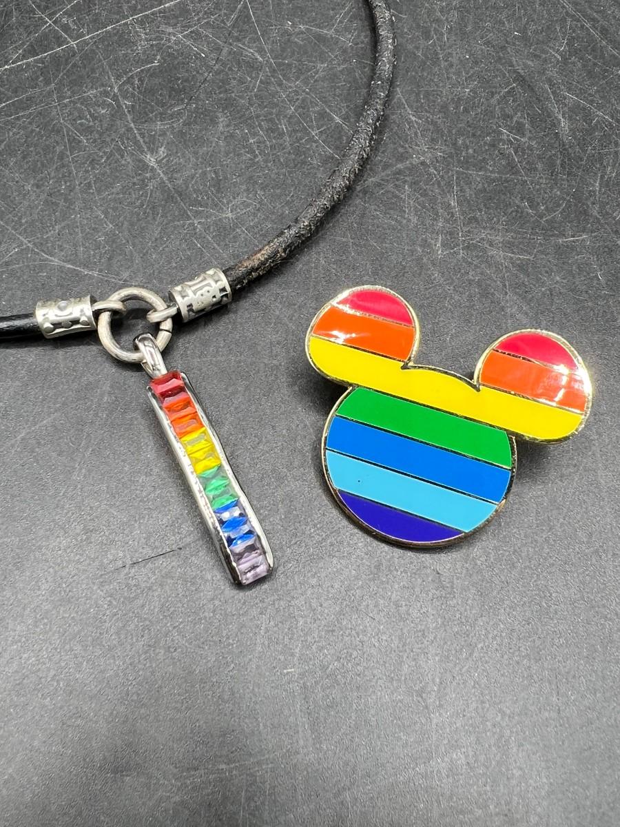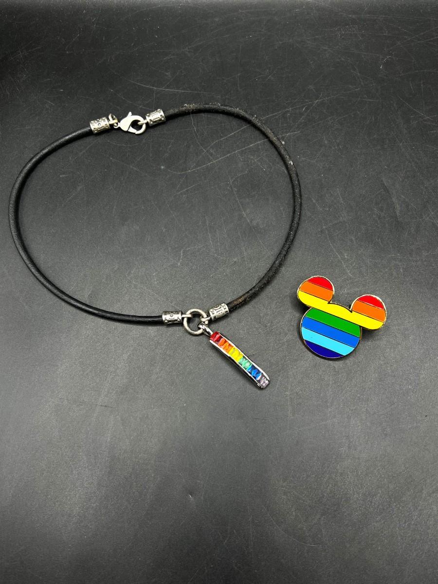 Mickey Mouse Trading Pin Rainbow Mickey Ear and Rainbow Colored Pendant, there is no significant damage to the pin or the necklace and is in good wearable condition. Check pictures for more details and for sizing.