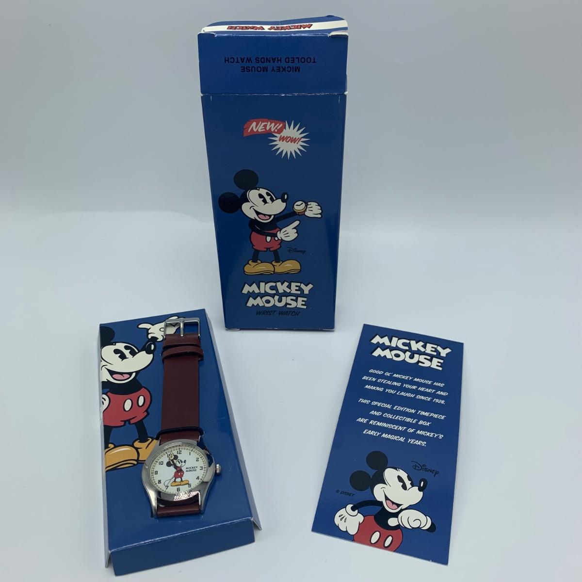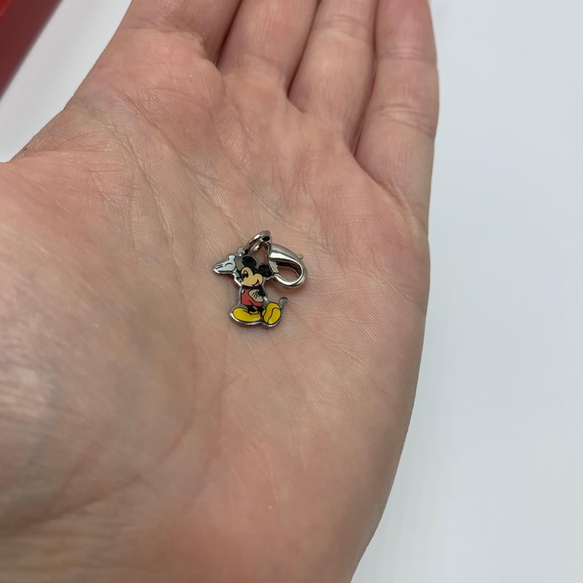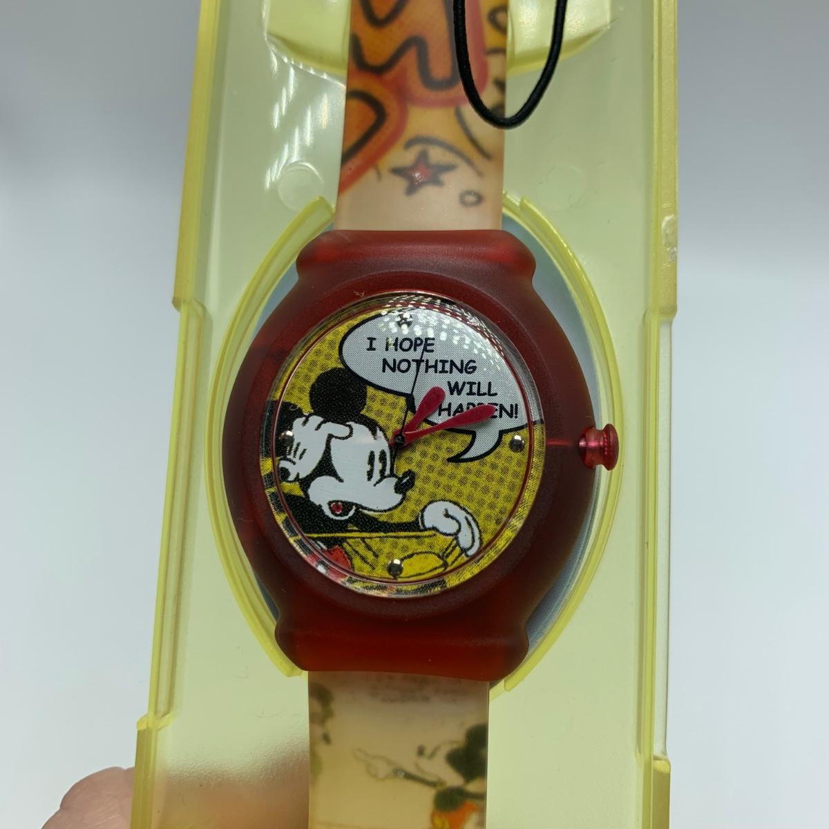 Four Mickey Mouse watches plus two pendants, a charm, and a small plastic Mickey Mouse figurine. Three of the watches appear to be unworn. The pink one has been used and needs cleaned. None of the watches are currently functioning and likely need their batteries replaced.