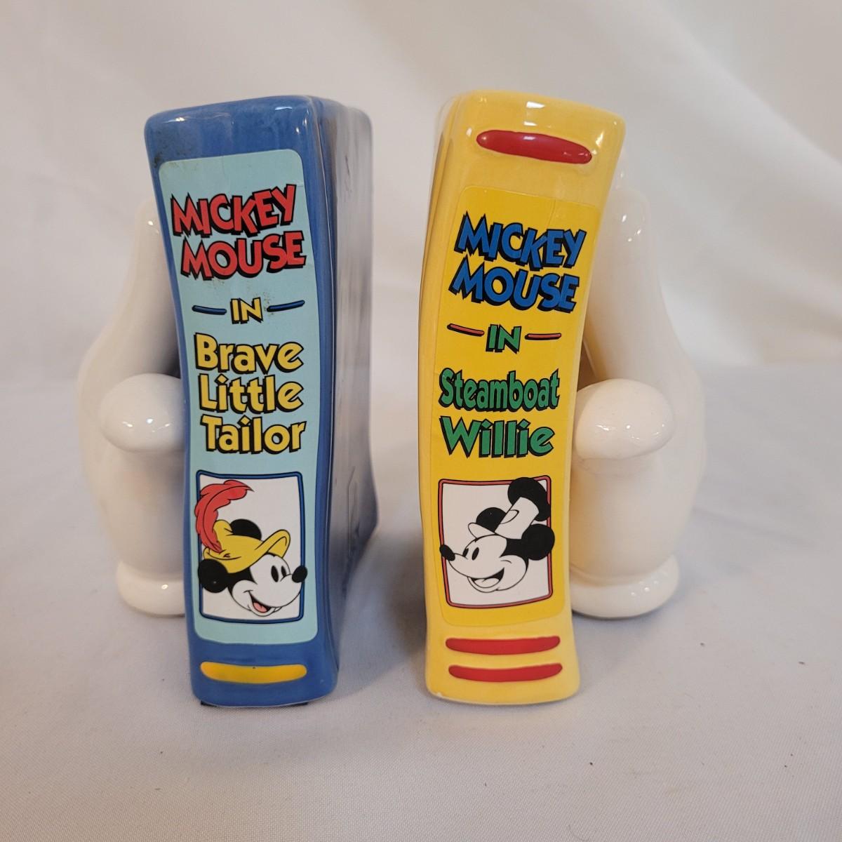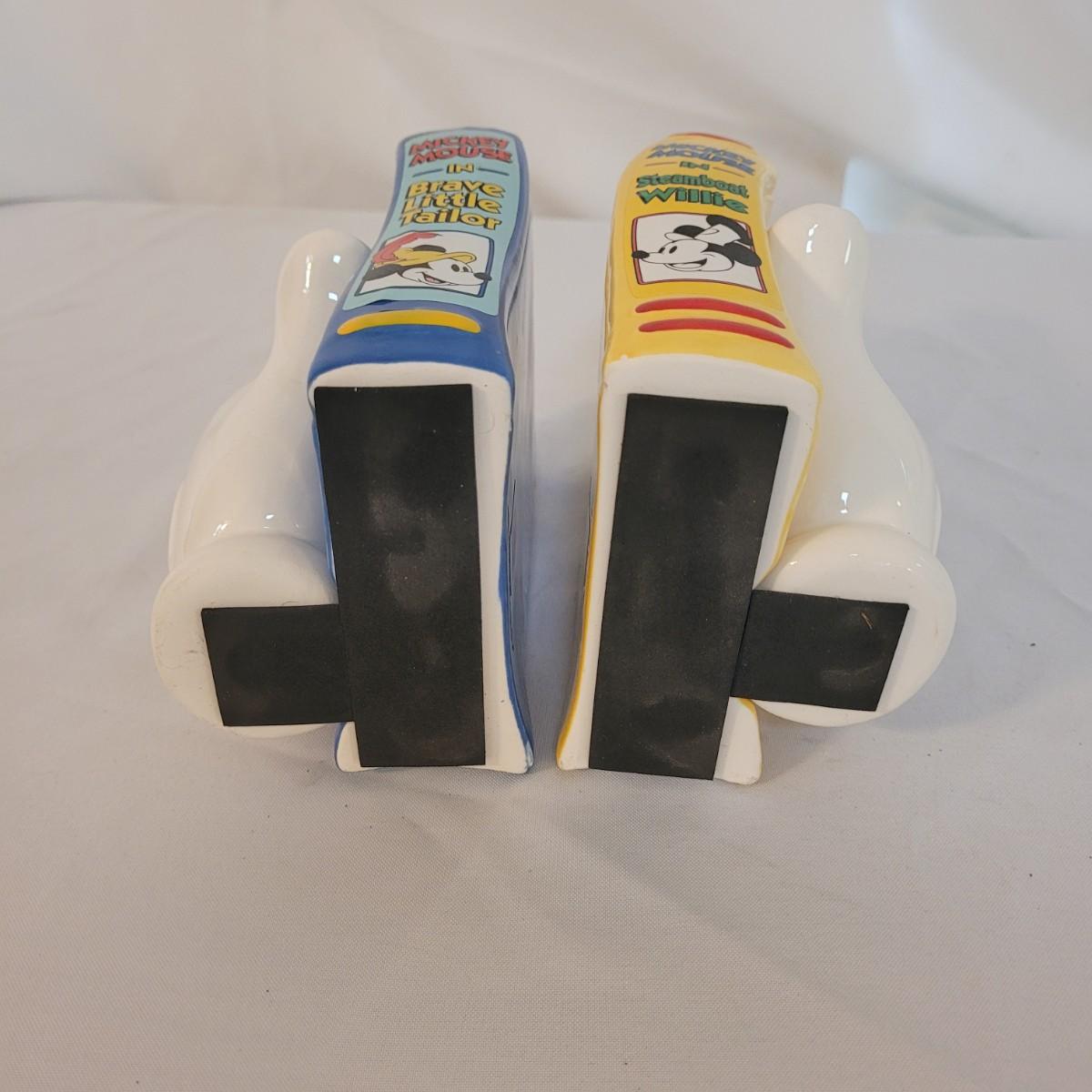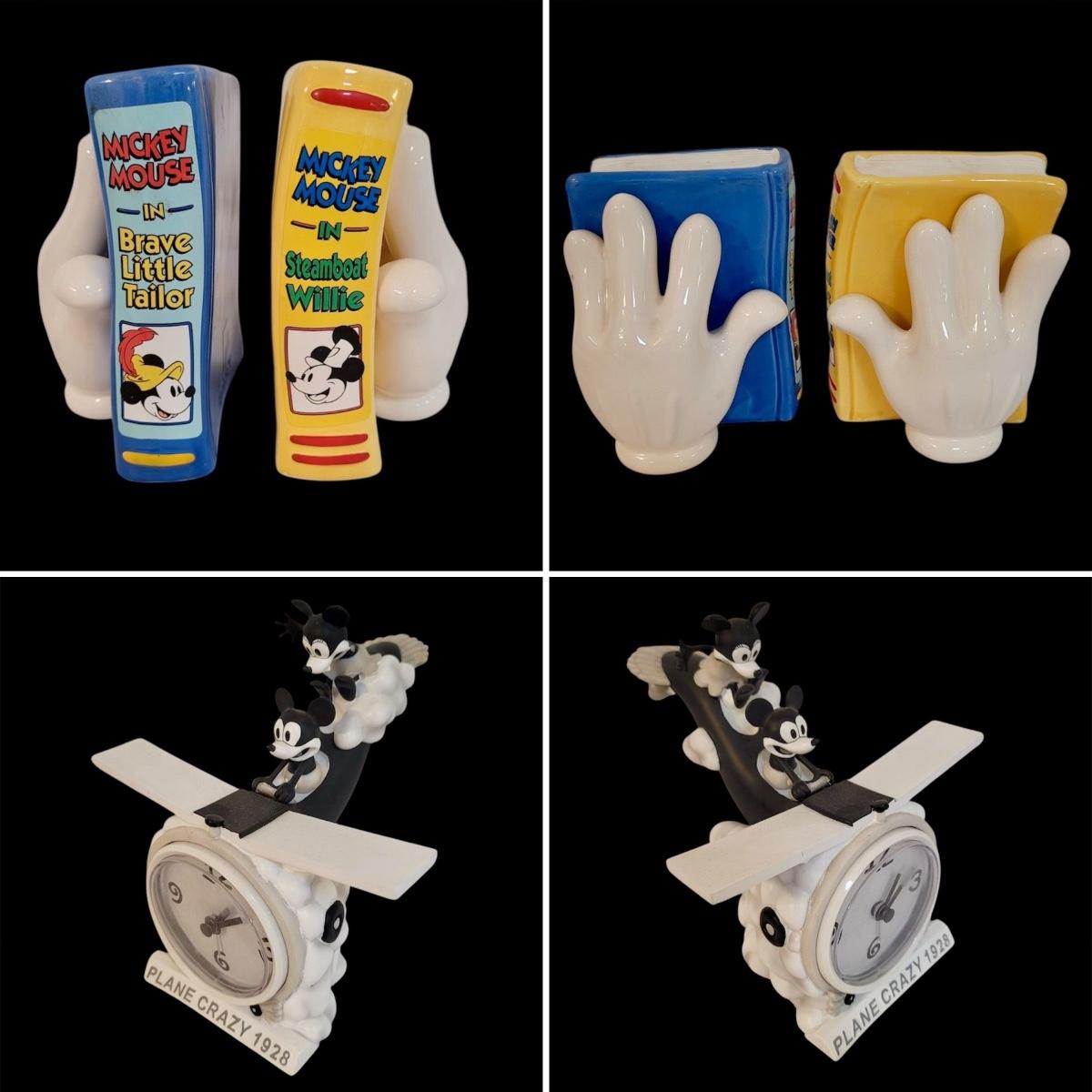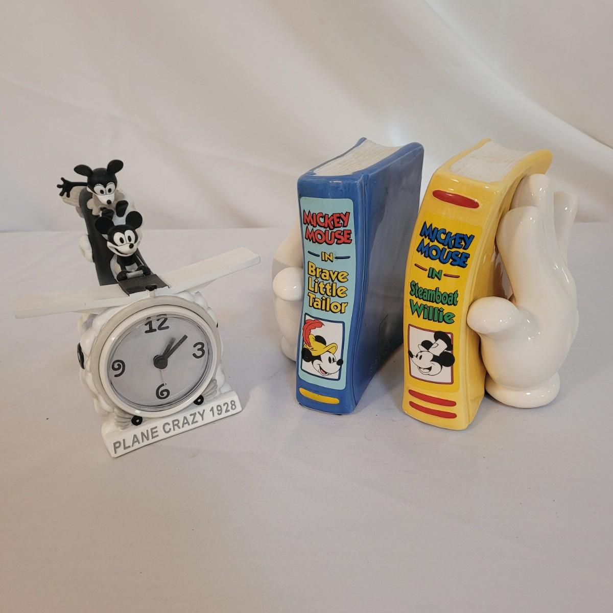 This lot includes a set of Mickey Mouse bookends and clock. The bookends are ceramic and feature Mickeys white gloves holding two books, "Brave Little Tailor" and "Steamboat Willie". The clock is a Minnie and Mickey "Plane Crazy 1928" clock. It features mickey and Minnie diving in an airplane. This plane appears to be a rare and hard to find item for collectors of Disney products. Minnie is missing her left arm. It is battery operated and currently not running.