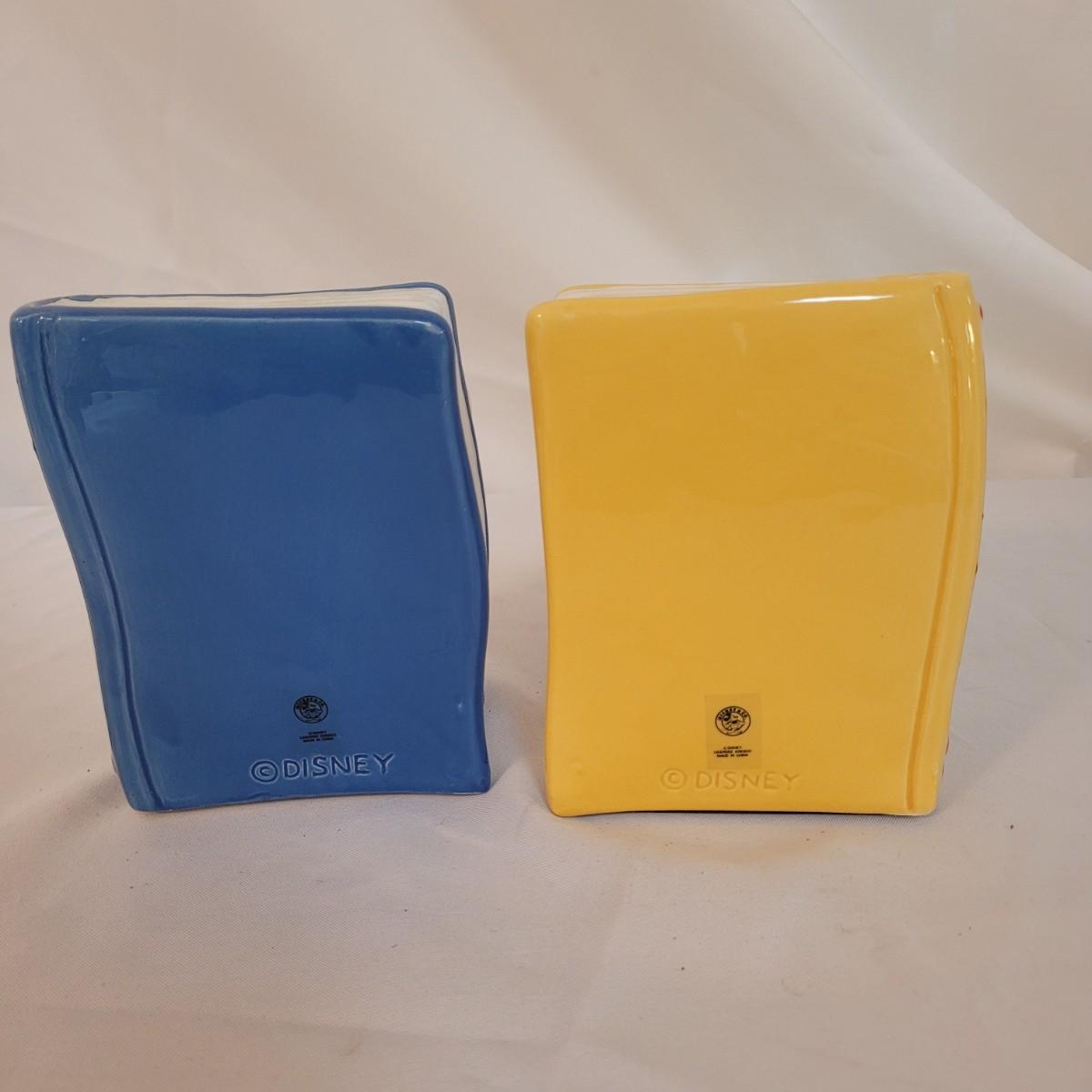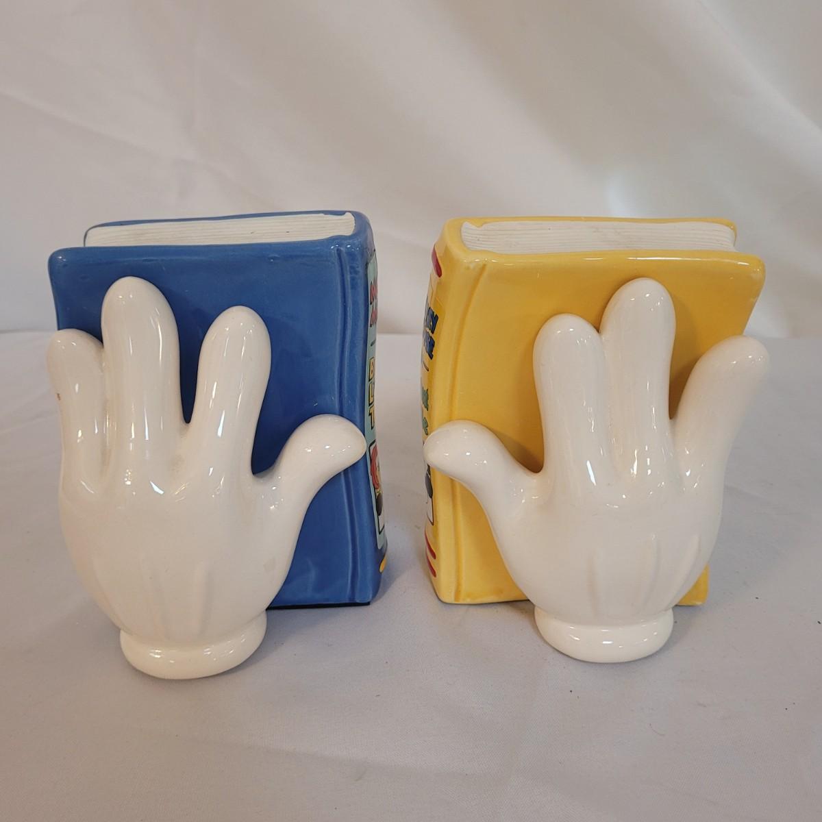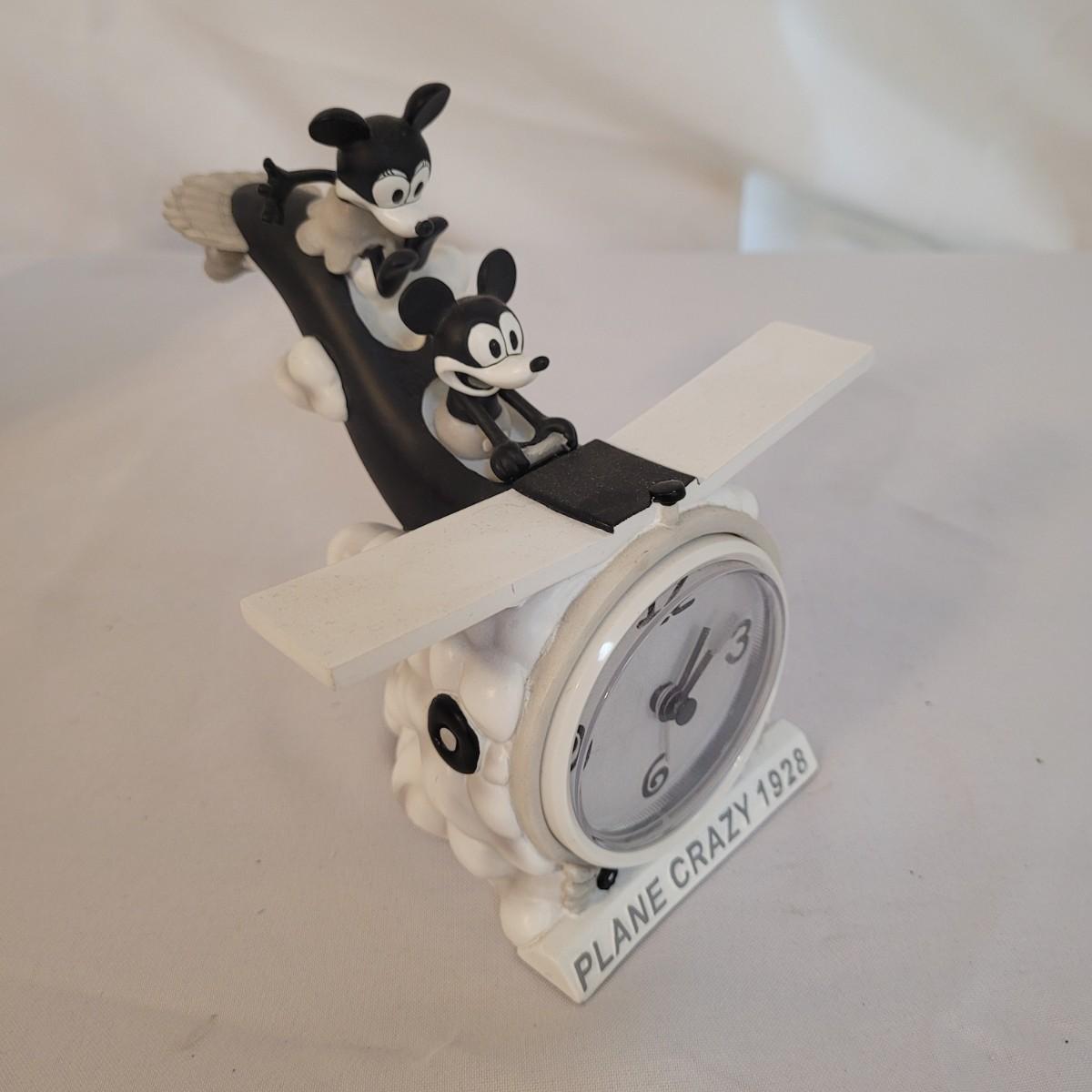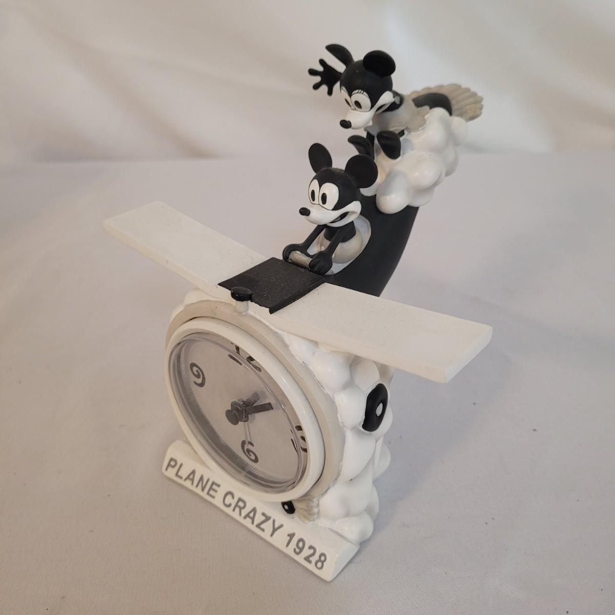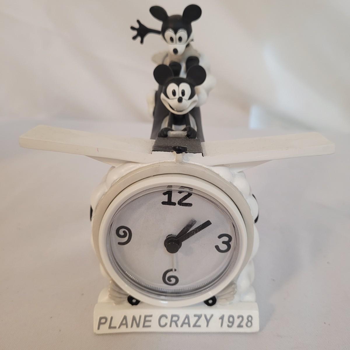 This lot includes a set of Mickey Mouse bookends and clock. The bookends are ceramic and feature Mickeys white gloves holding two books, "Brave Little Tailor" and "Steamboat Willie". The clock is a Minnie and Mickey "Plane Crazy 1928" clock. It features mickey and Minnie diving in an airplane. This plane appears to be a rare and hard to find item for collectors of Disney products. Minnie is missing her left arm. It is battery operated and currently not running.