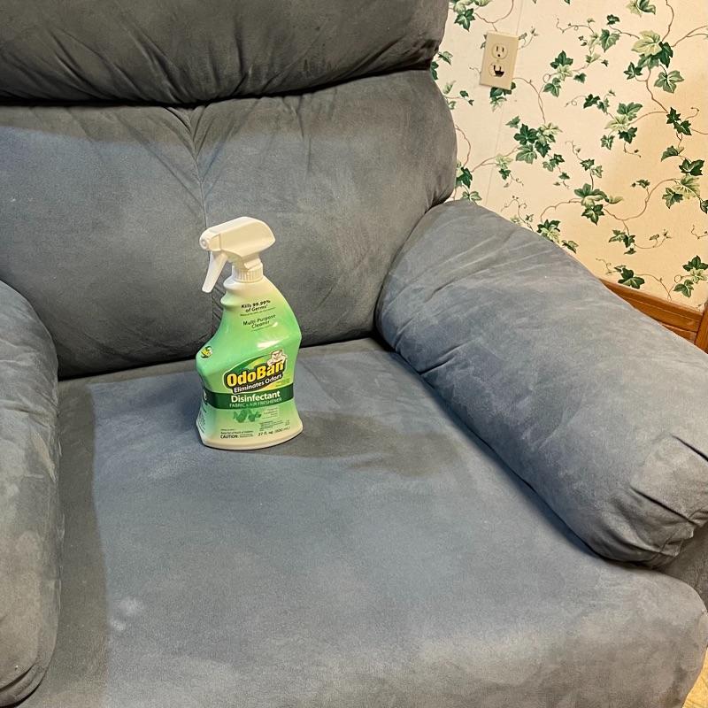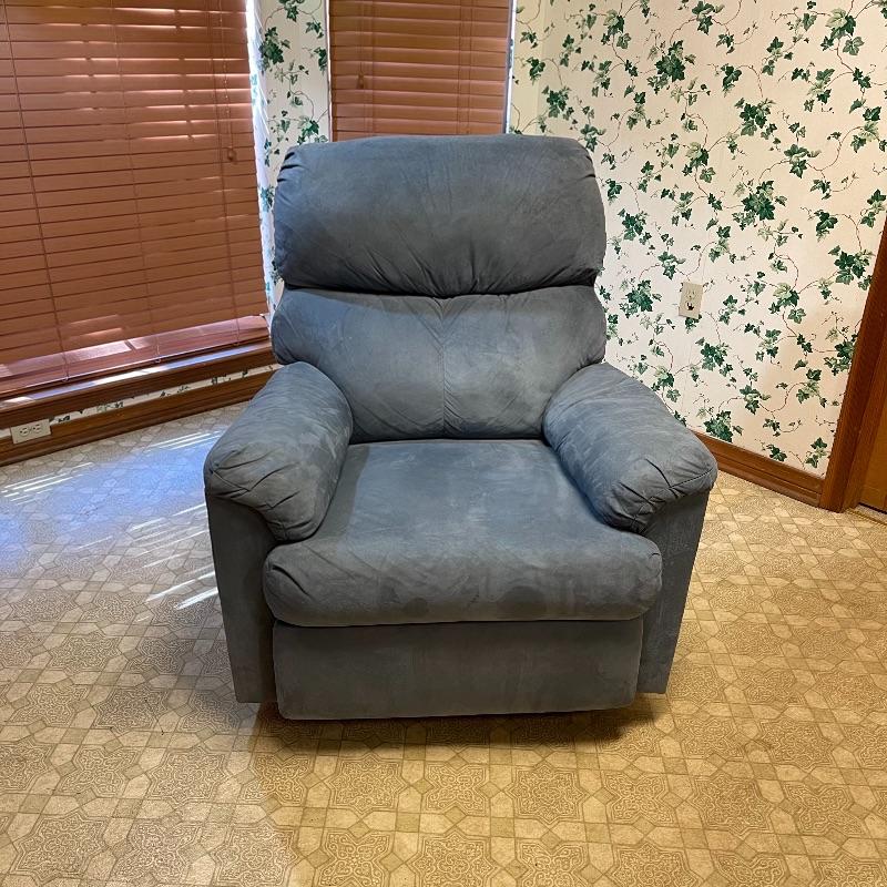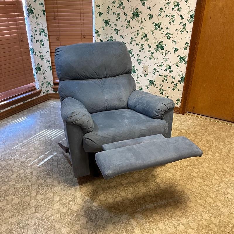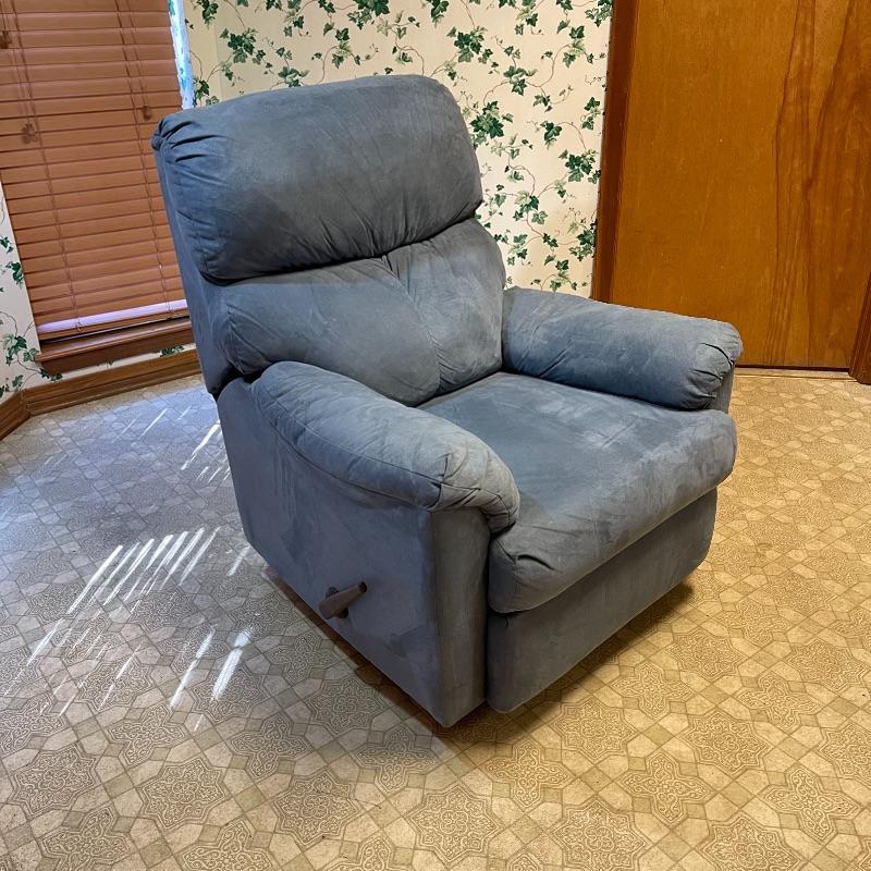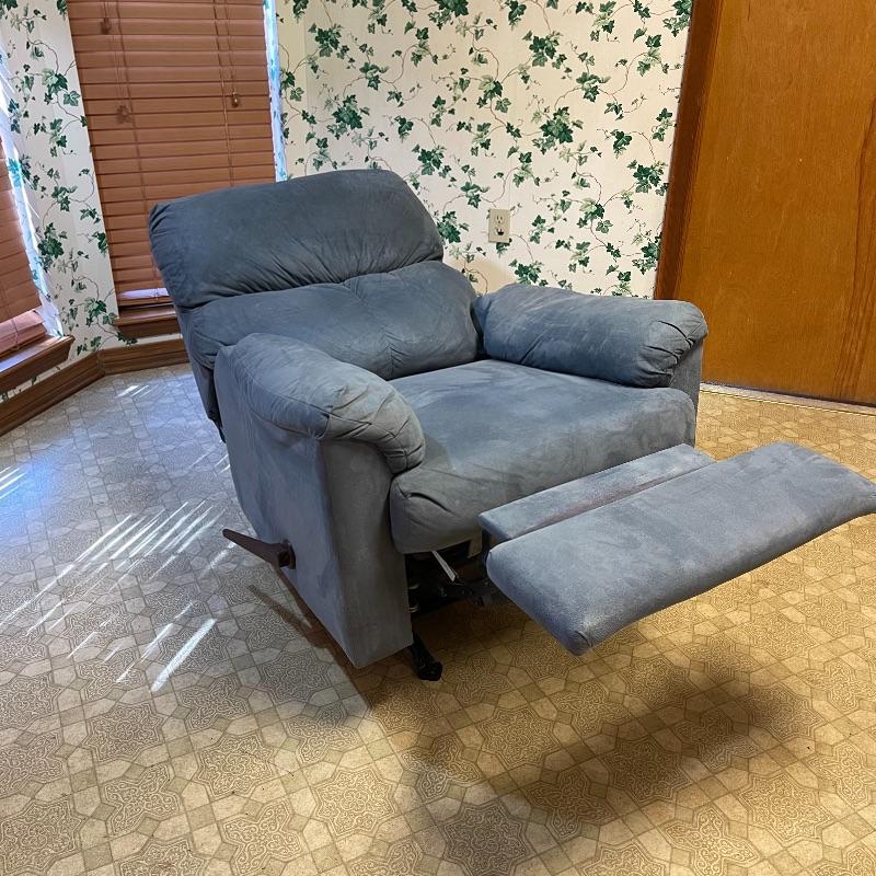 Plush, blue microfiber with wood handle to recline. Rocks.