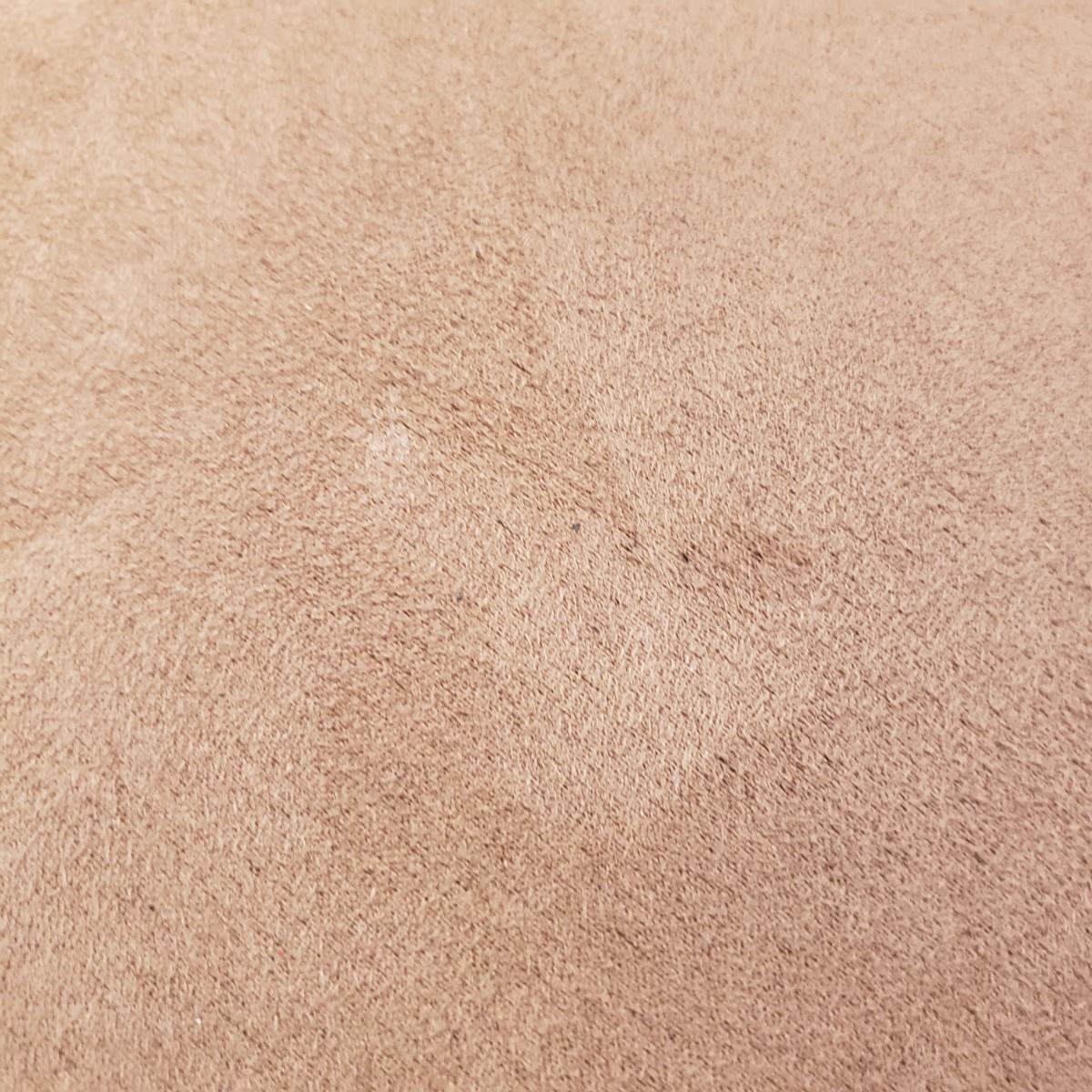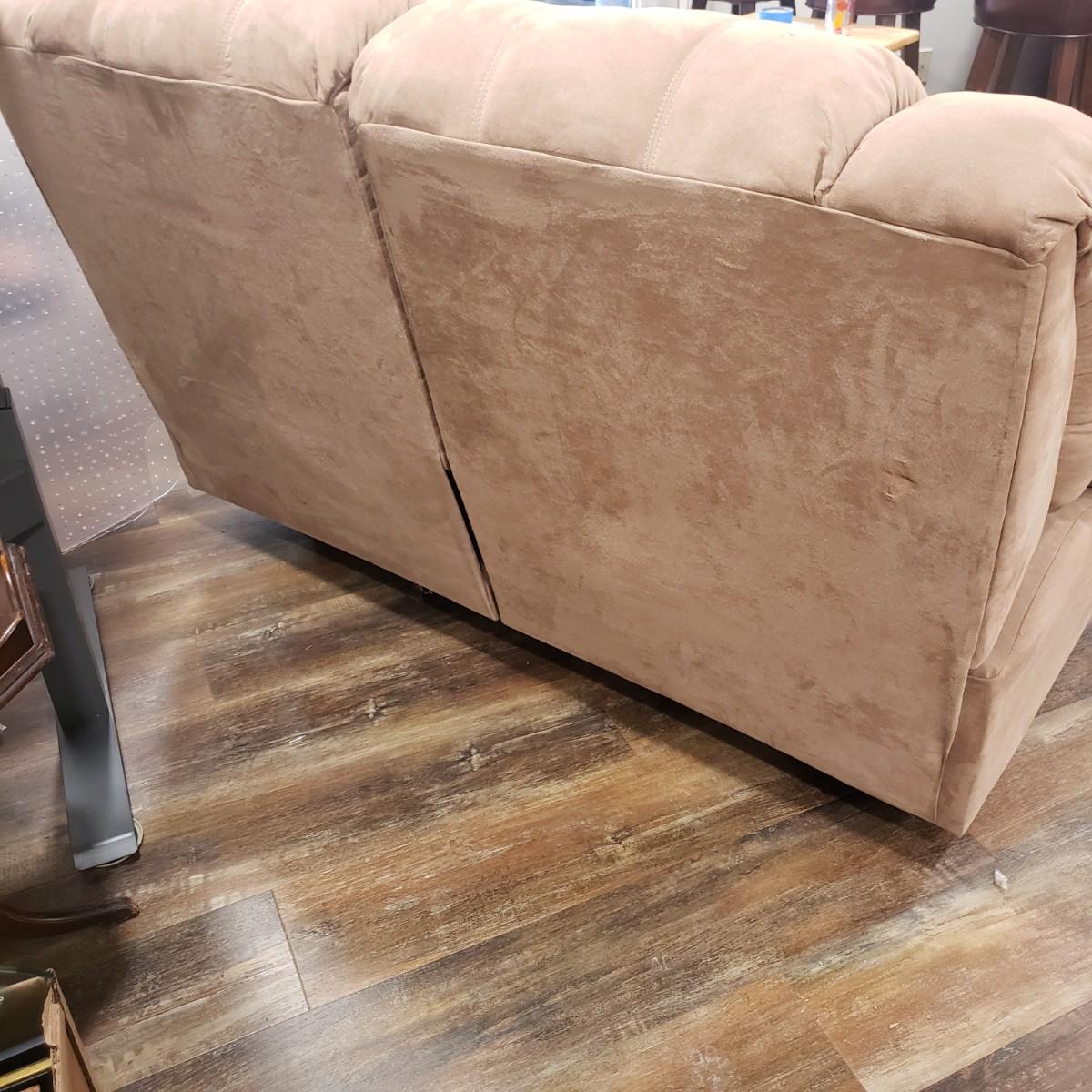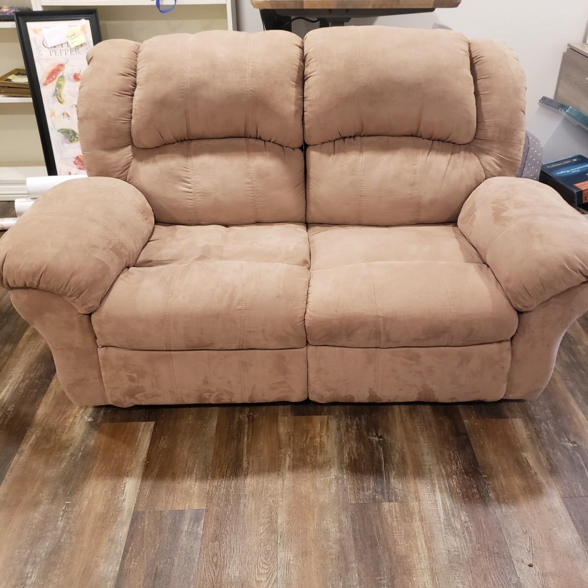 This is a microfiber tan reclining love seat. Both sides recline. The love seat measures 67" x 35" x 40"H, with a seat height of approximately 19". There is some blemishes on the left side near the reclining latch, see pictures.