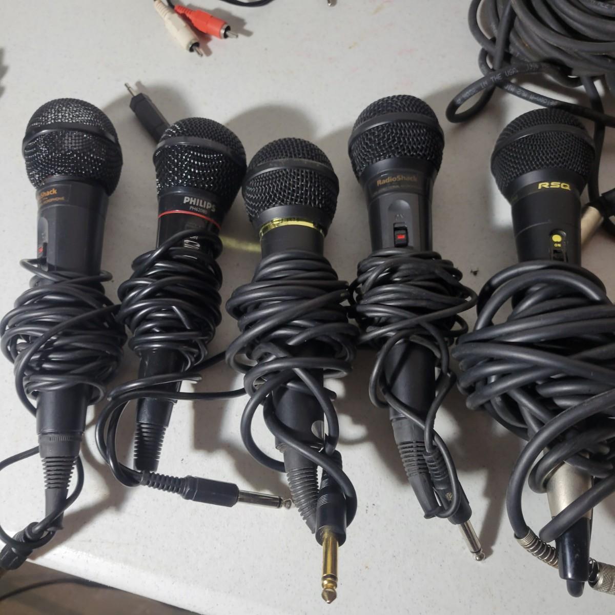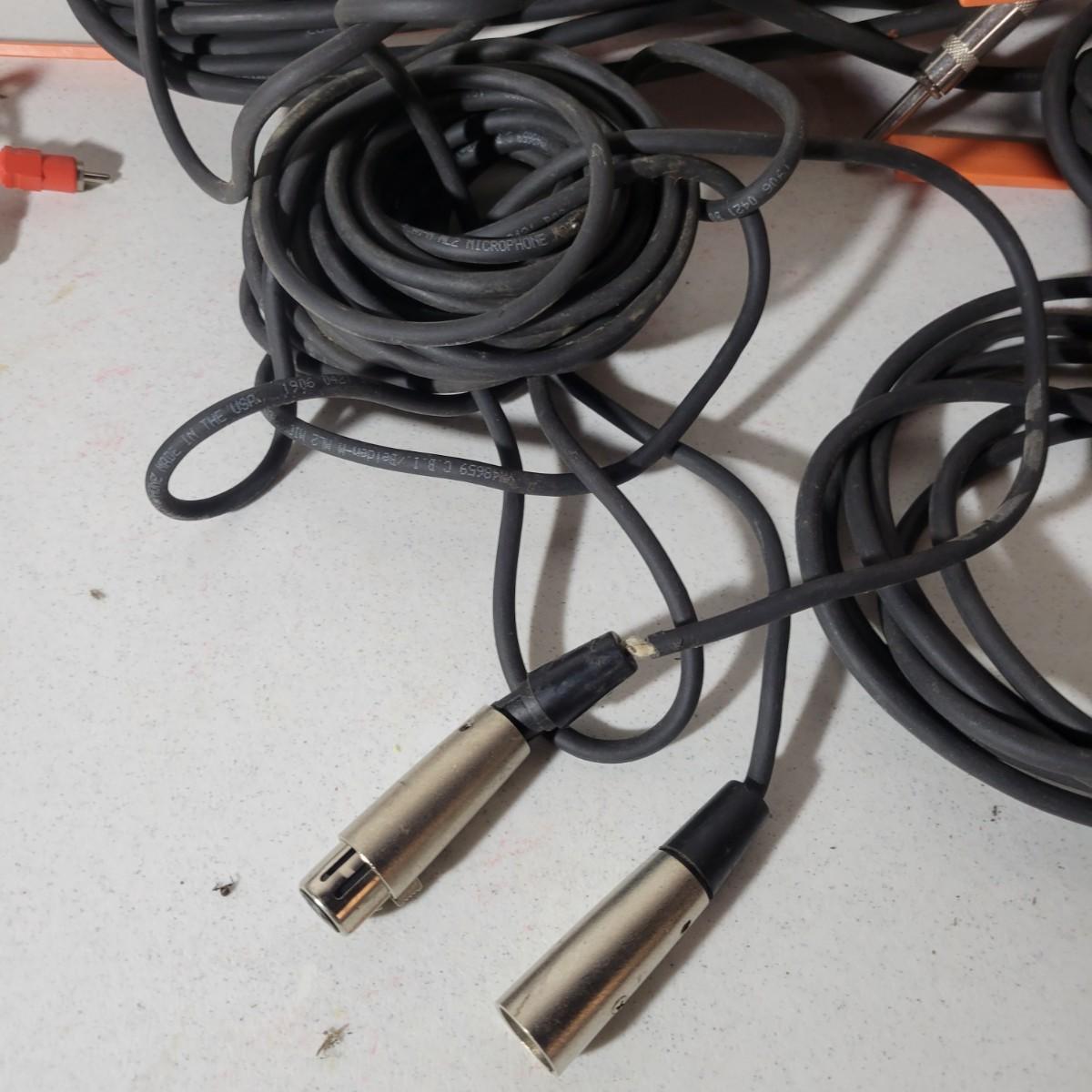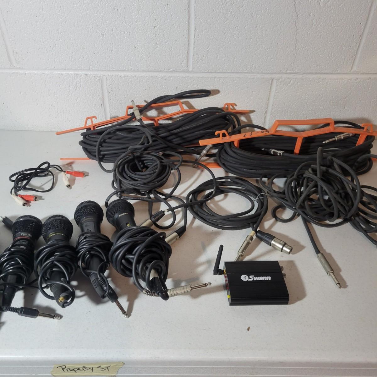 An assortment of four microphones, five PA cables of various sizes, a Swann 4 channel audio interface. No items in this lot were able to be tested. The Swann audio interface is missing its power cable. A few of the microphones have loose screen covers and the PA cords range from M2M, F2F, M2F ends and appear to be in good shape and are 50ft lengths. Shipping available