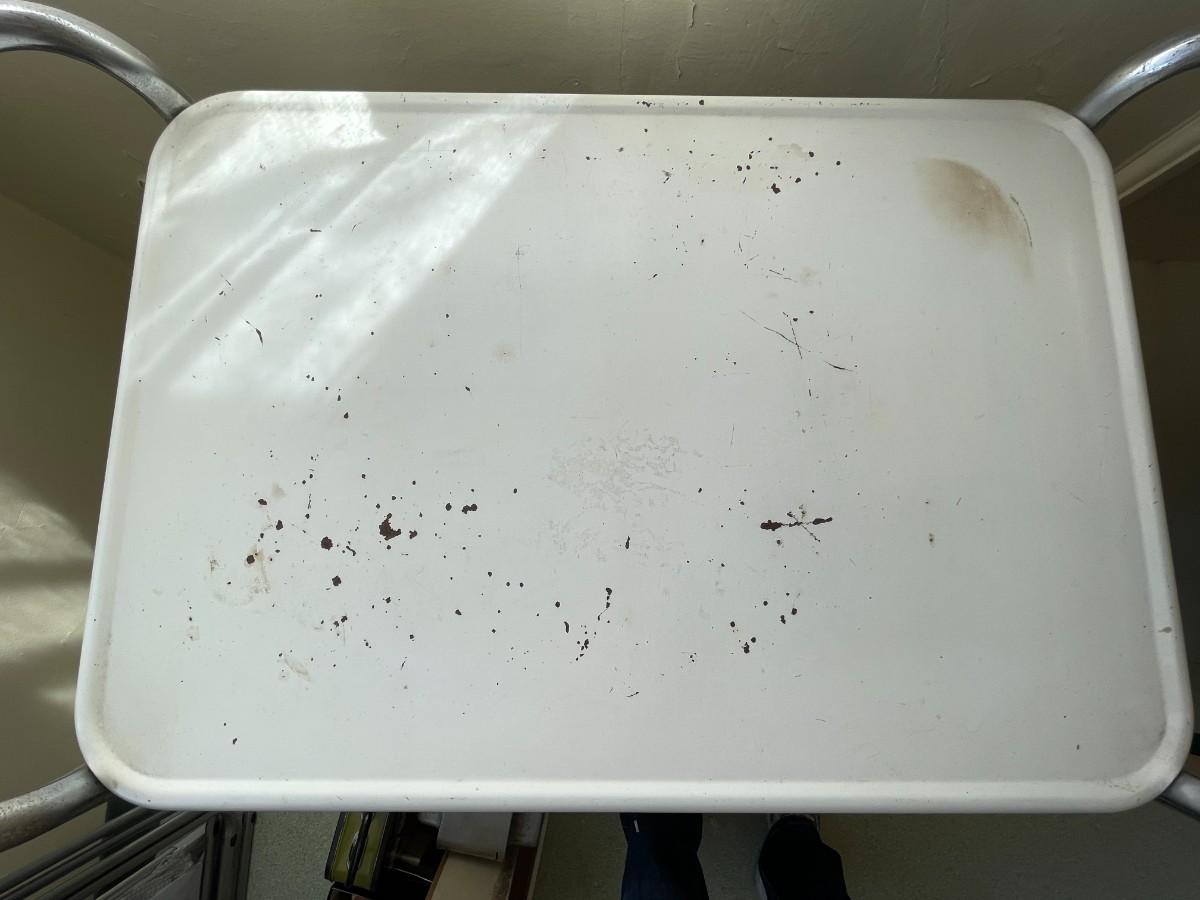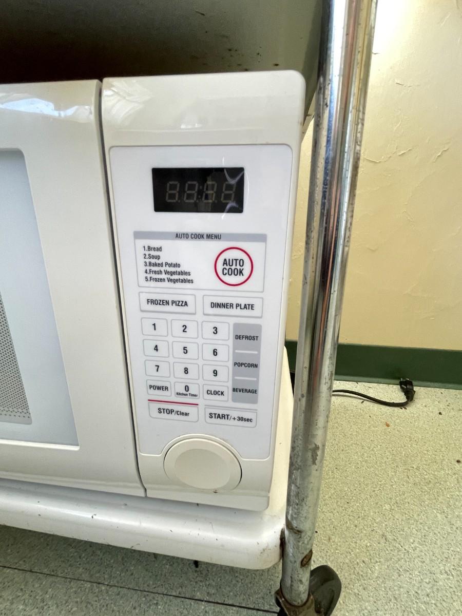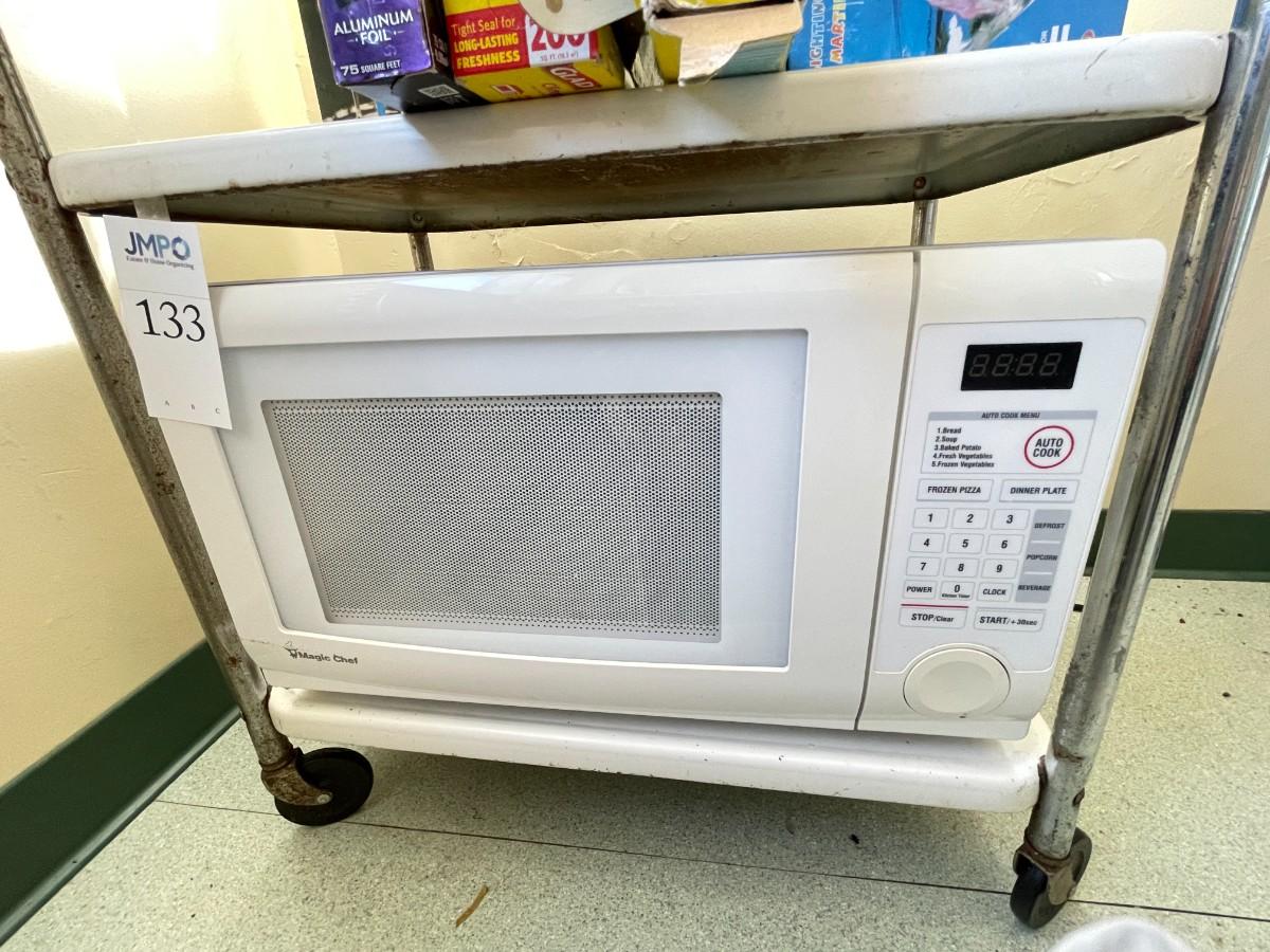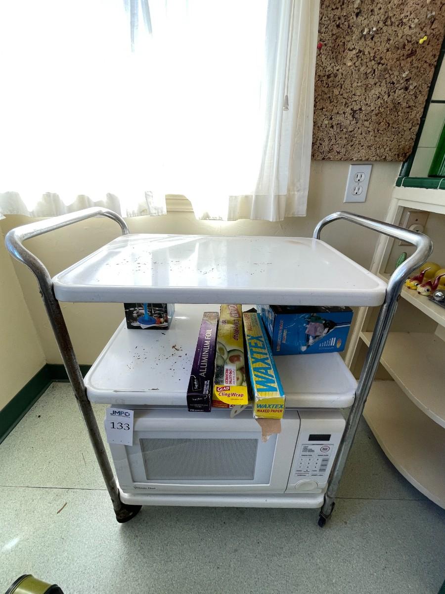 Includes all items shown on cart. Cart has wear, rust. Microwave works