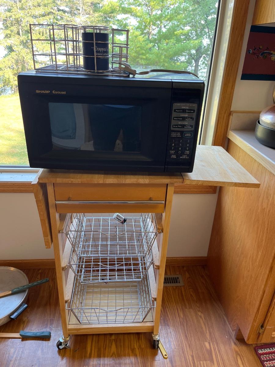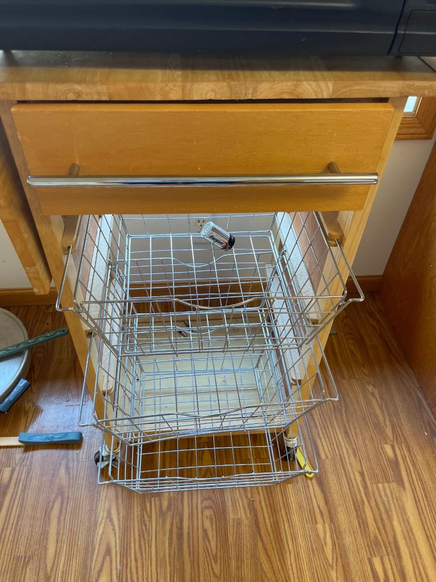 Cute cart with three metal drawers and a wood drawer. Appears only the right side of extension is working correctly.