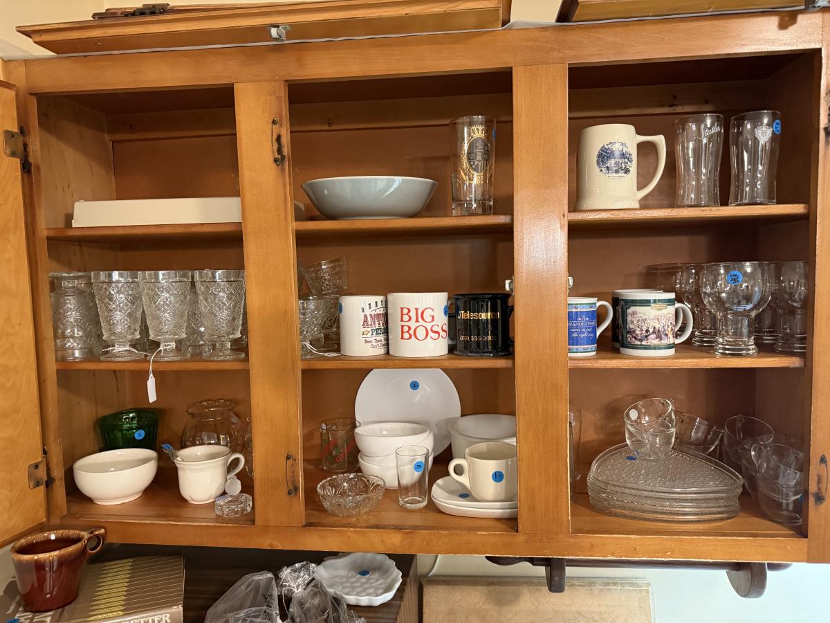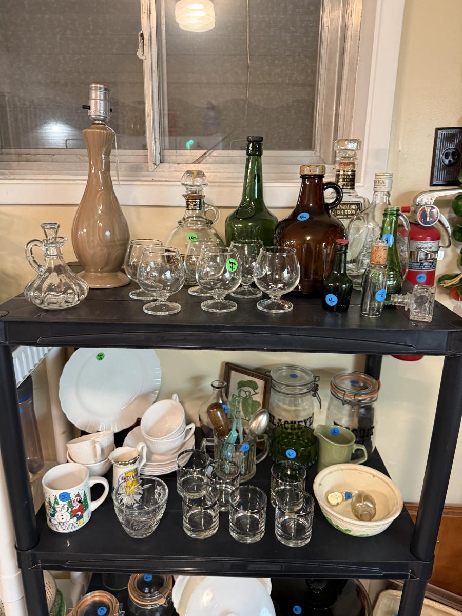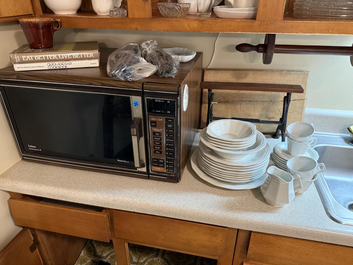 Microwave, dishes, glassware, carafes, milk glass, utensils, home decor, dish drain, bottles, fondue pot, candle stands, etc