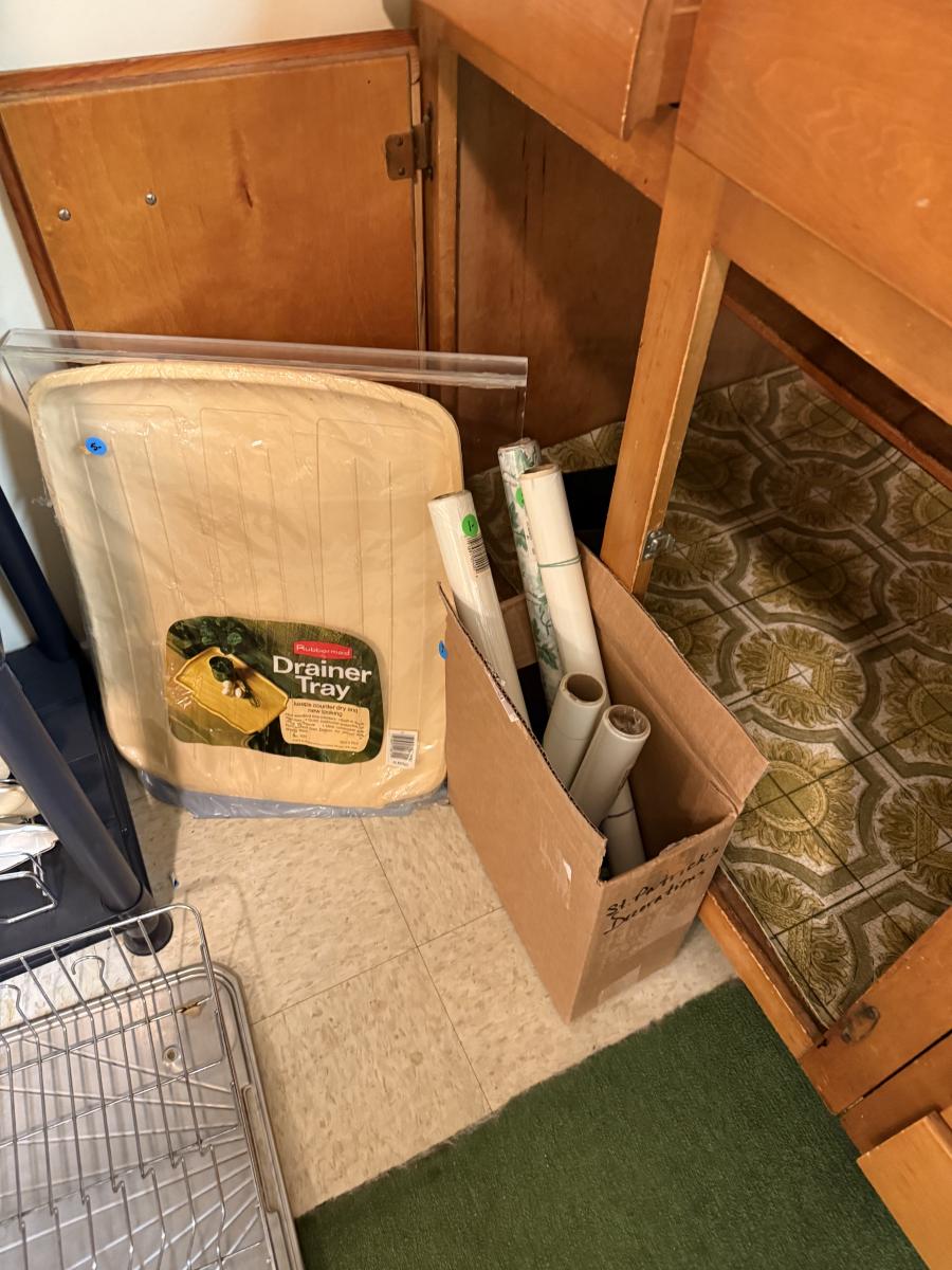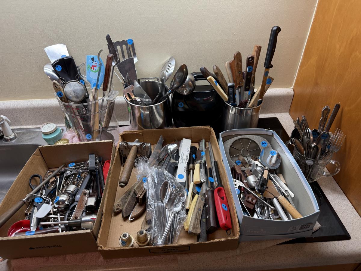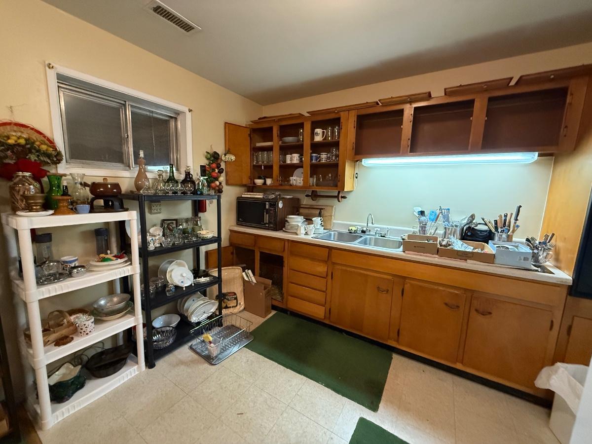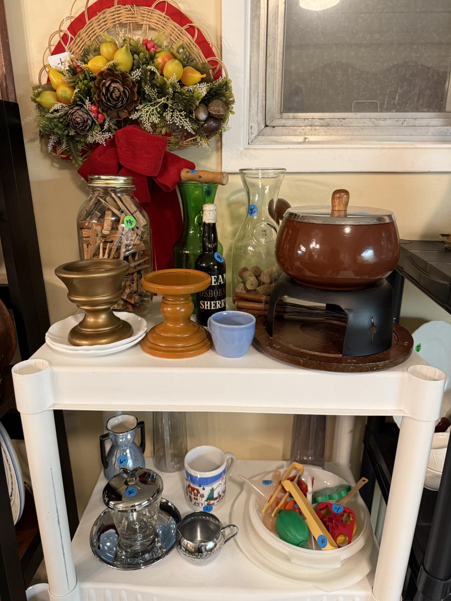 Microwave, dishes, glassware, carafes, milk glass, utensils, home decor, dish drain, bottles, fondue pot, candle stands, etc