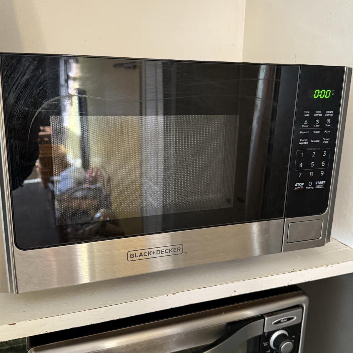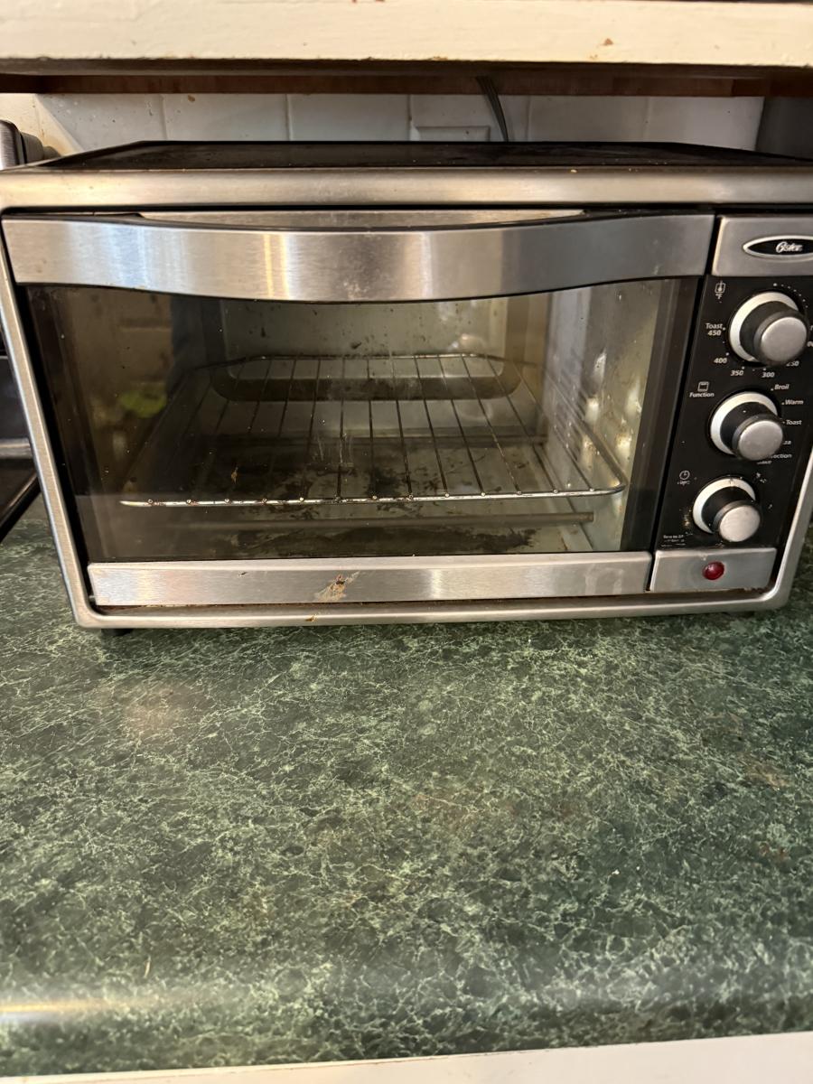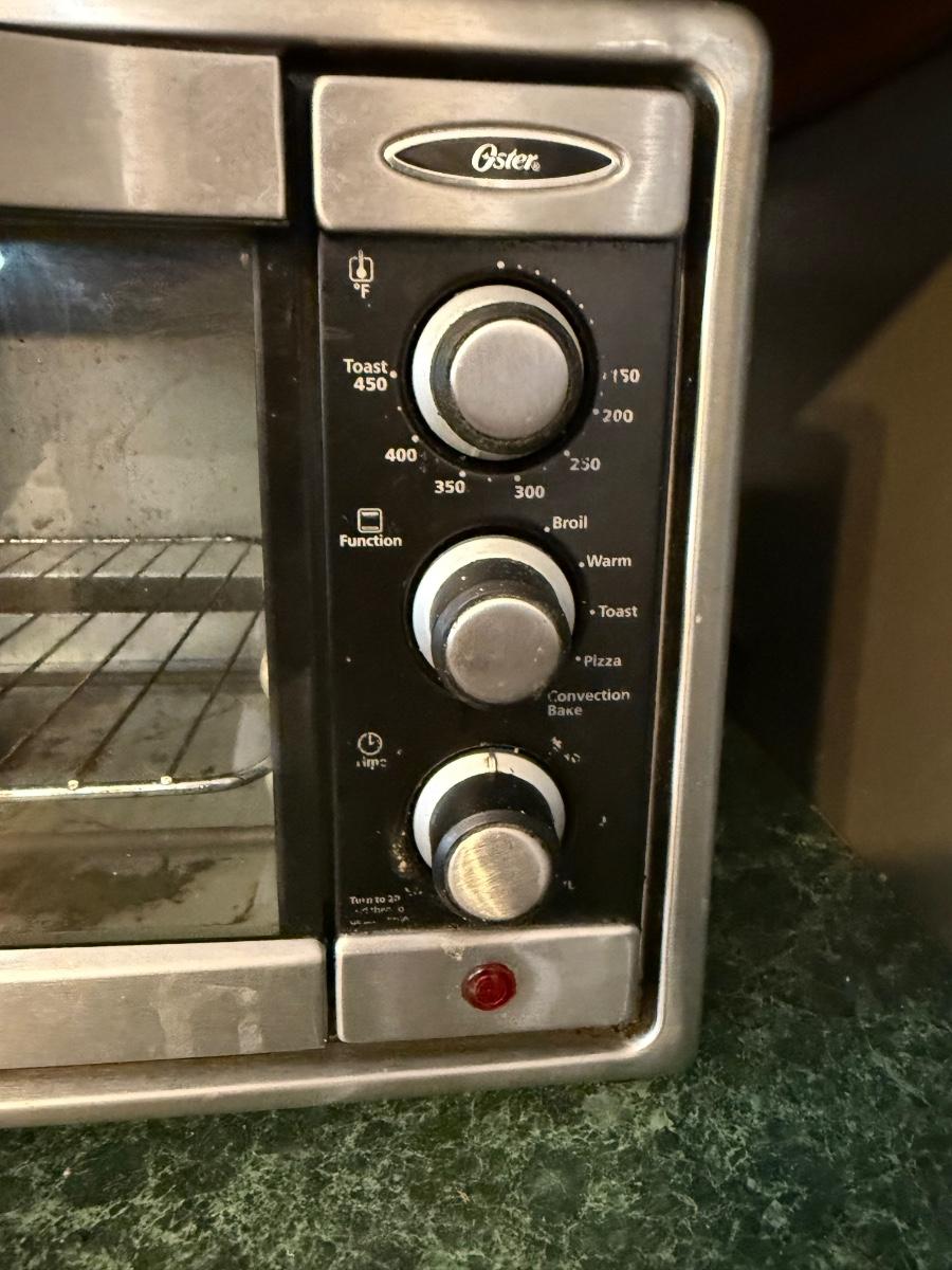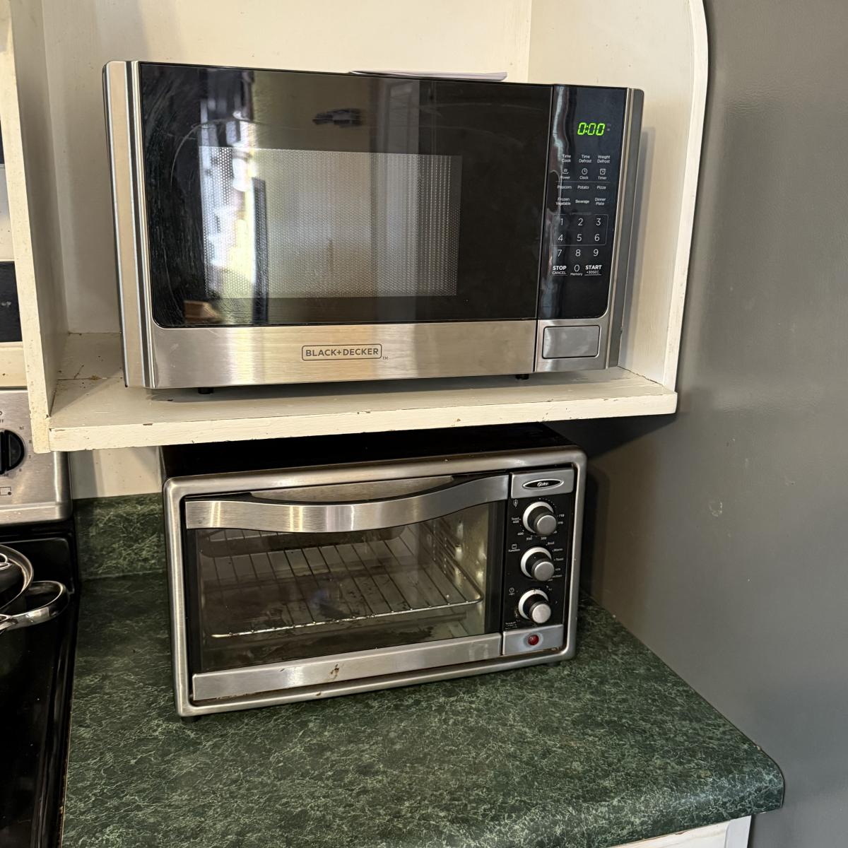 Black + Decker microwave oven measures 19” X 13.5” X 10”H and powers on when plugged in. Oster toaster oven measures 17” X 11.5” X 10.5”H and powers on when plugged in.
