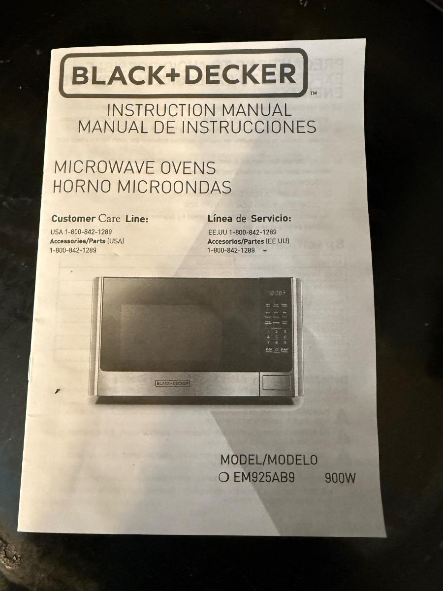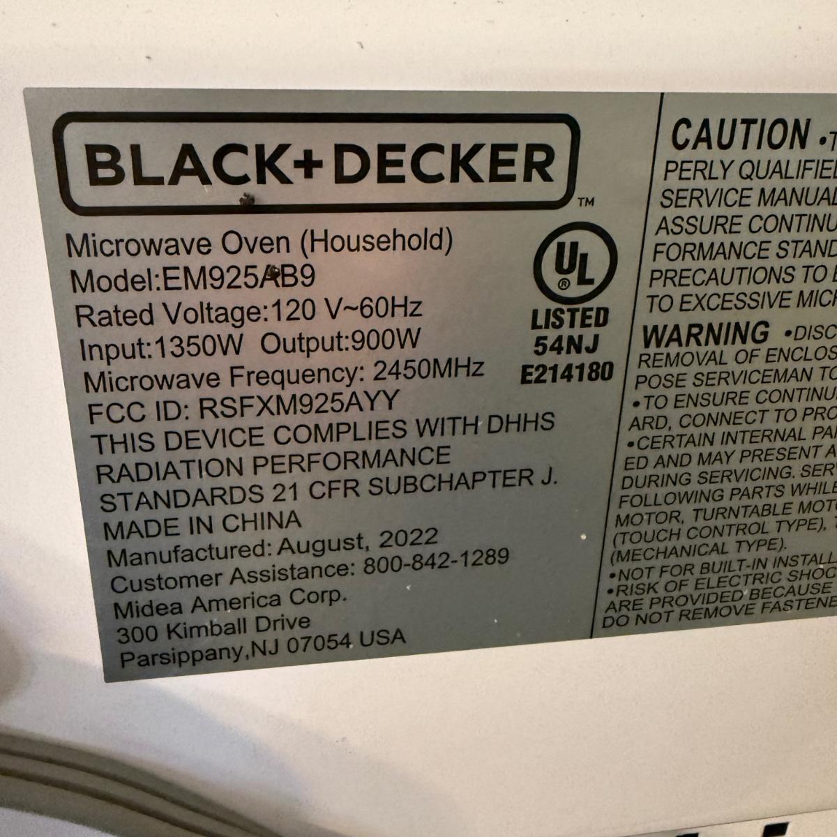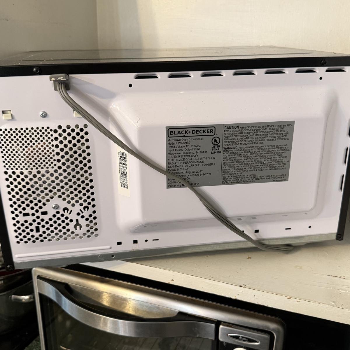 Black + Decker microwave oven measures 19” X 13.5” X 10”H and powers on when plugged in. Oster toaster oven measures 17” X 11.5” X 10.5”H and powers on when plugged in.