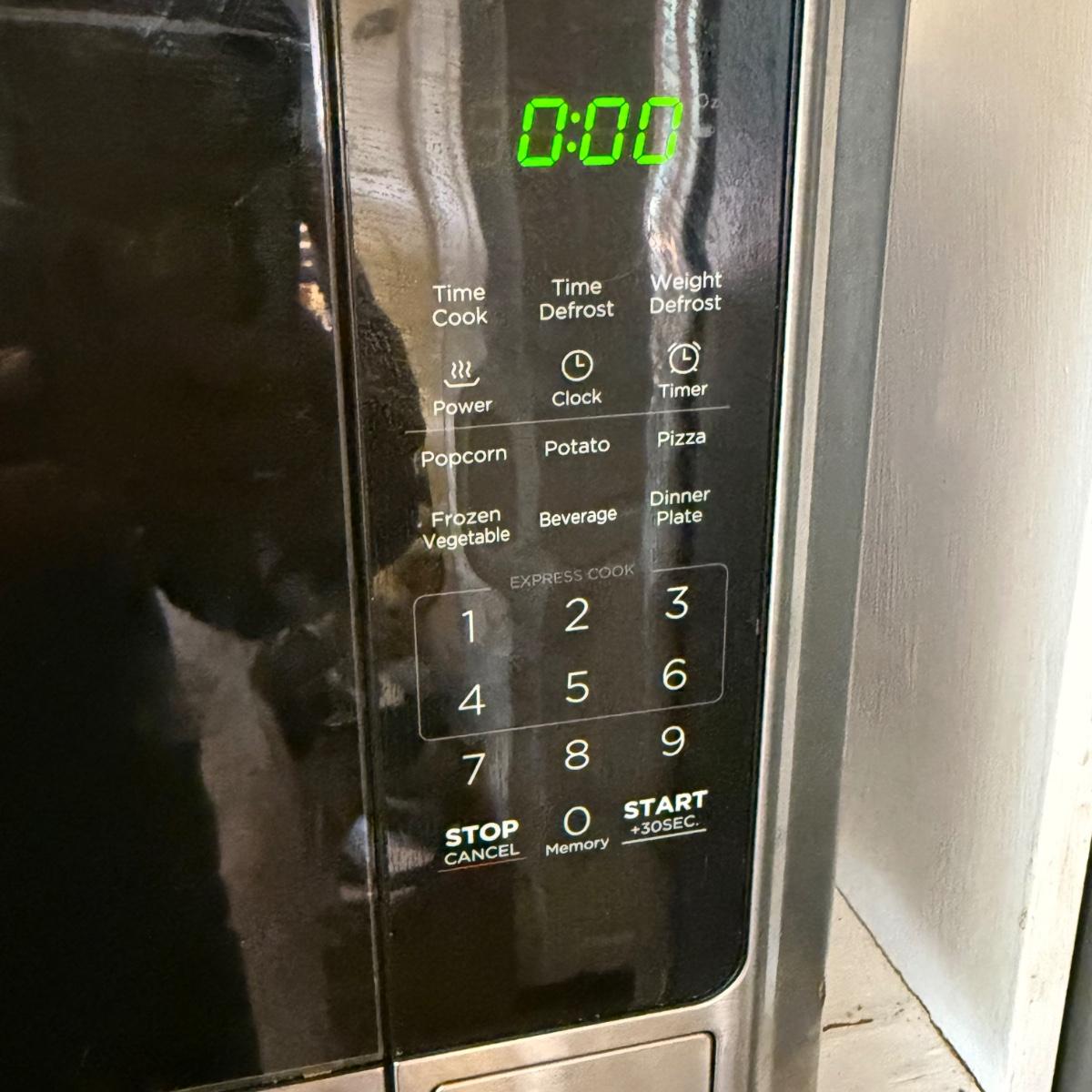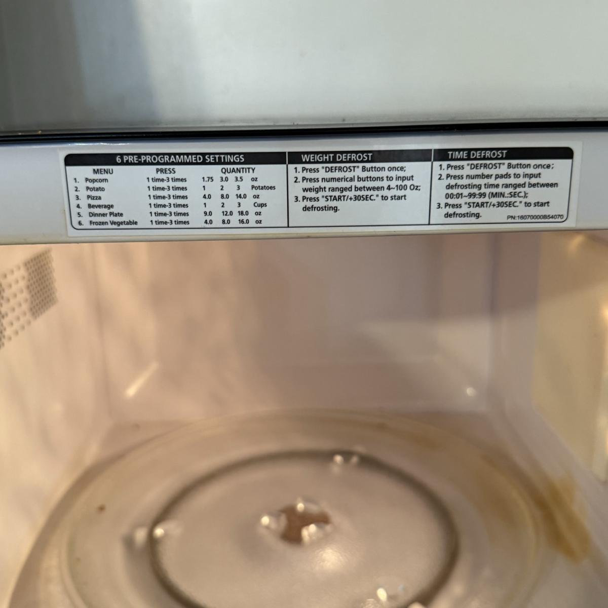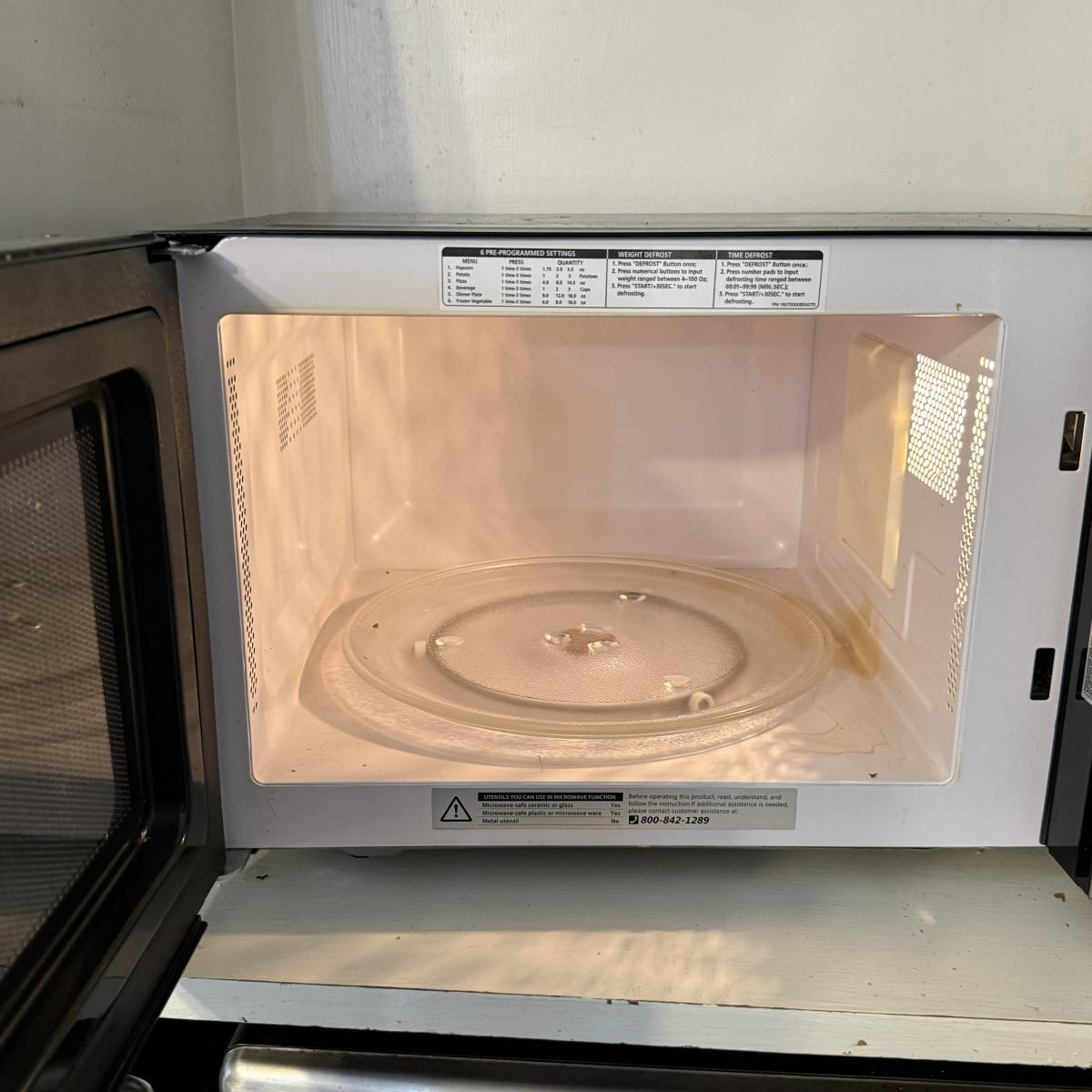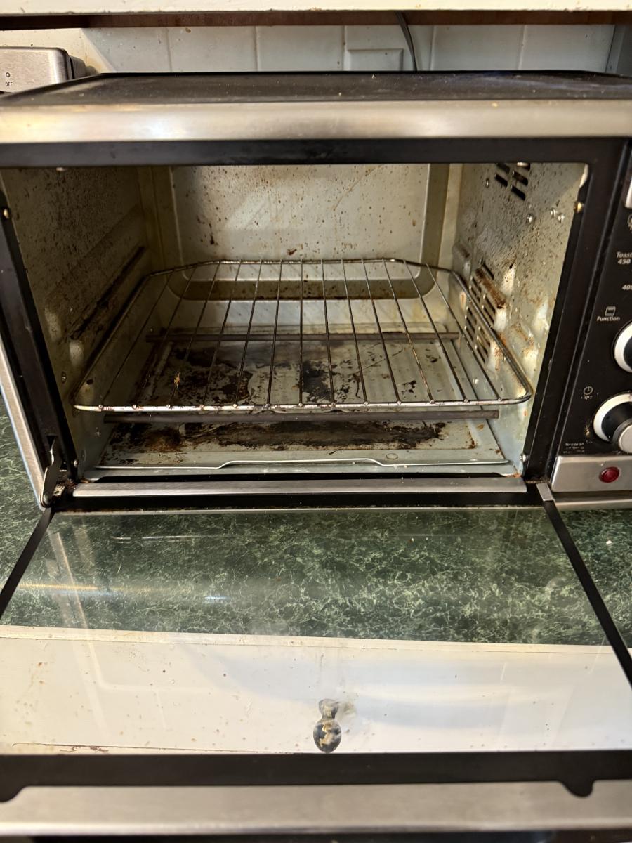 Black + Decker microwave oven measures 19” X 13.5” X 10”H and powers on when plugged in. Oster toaster oven measures 17” X 11.5” X 10.5”H and powers on when plugged in.