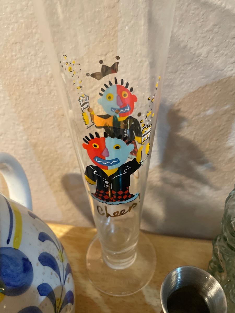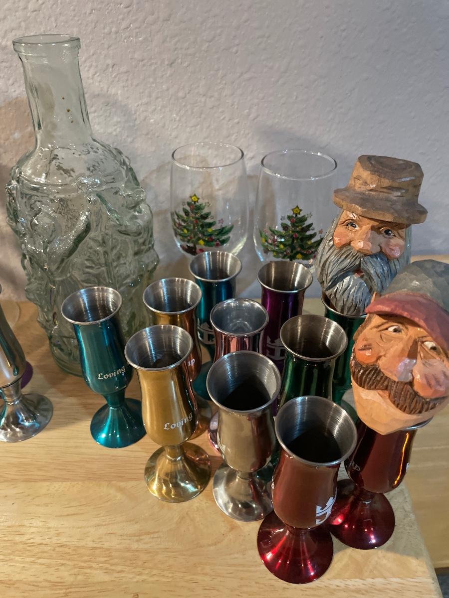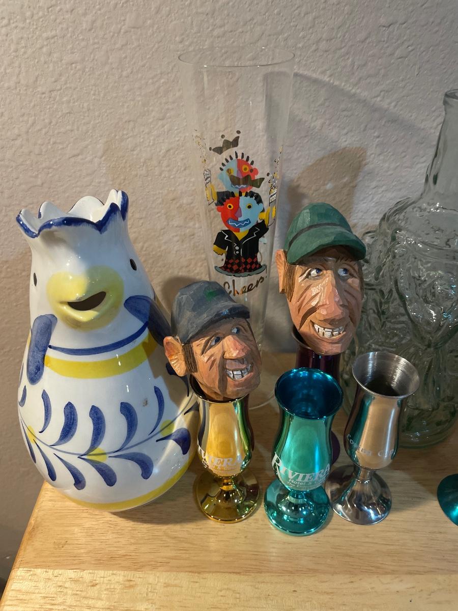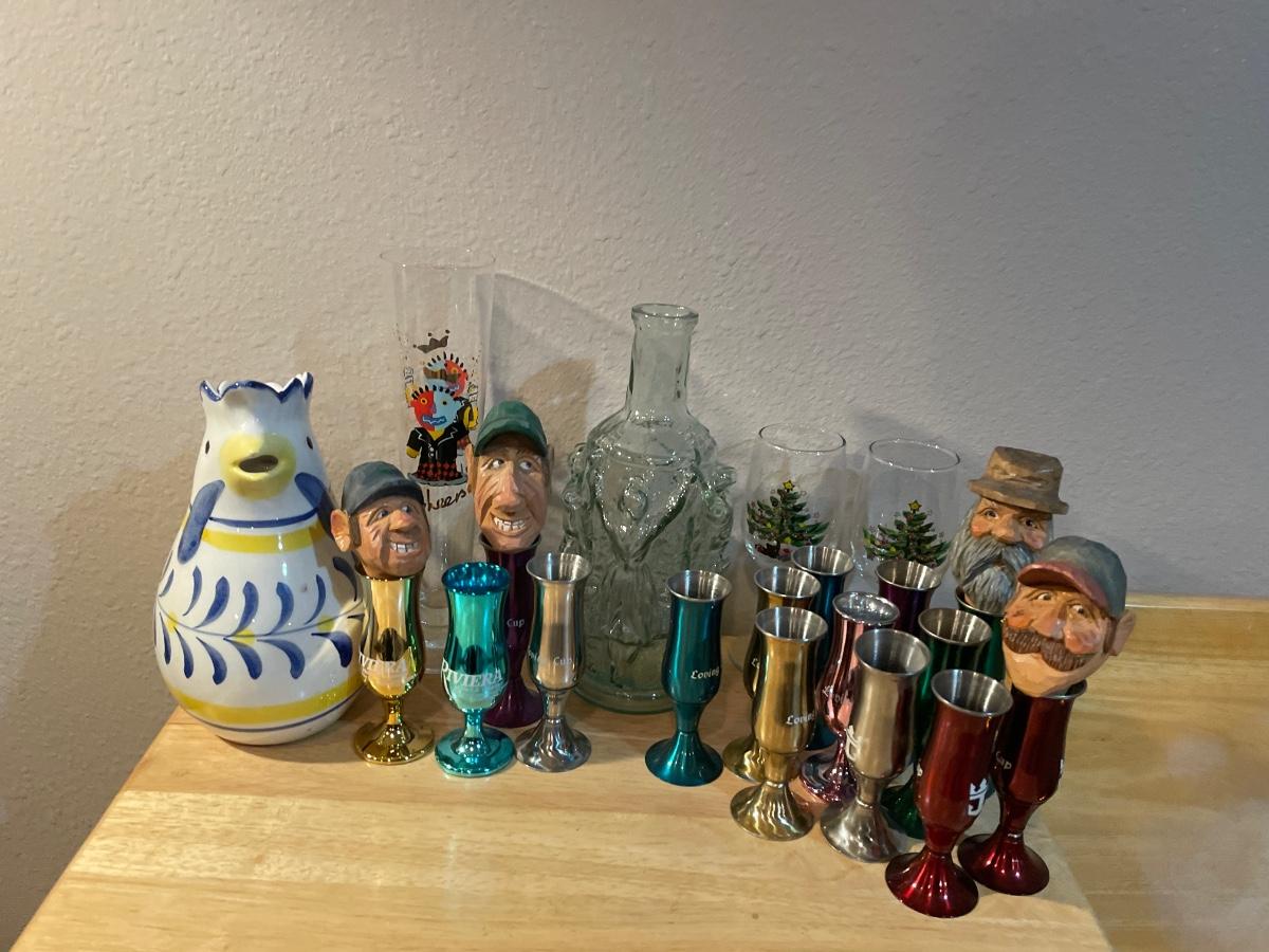 Mics shot glasses and some glass decor with wood heads