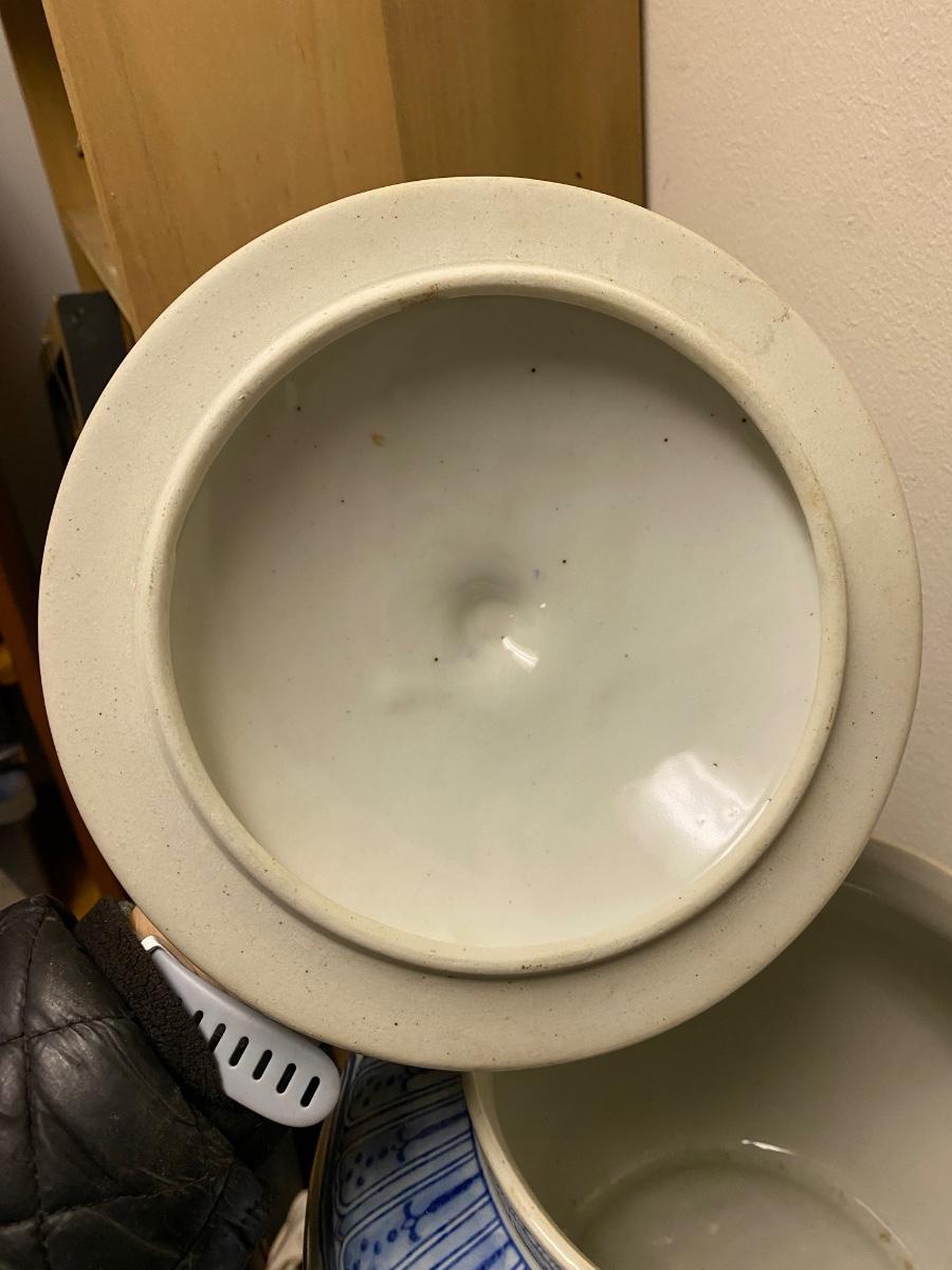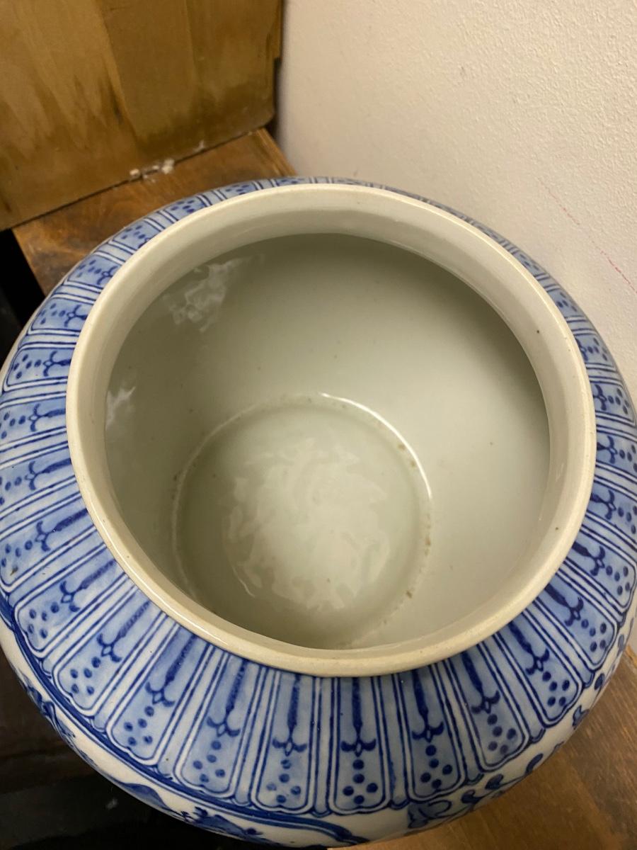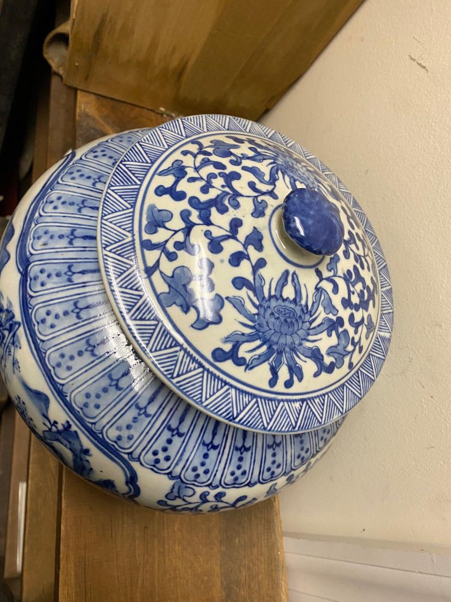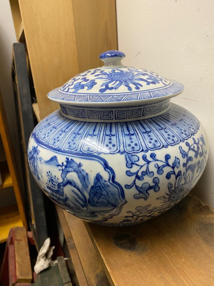 Mid 20th Century Chinese Blue and White Floral & Landscape Porcelain Lidded Urn. Makers mark on botom